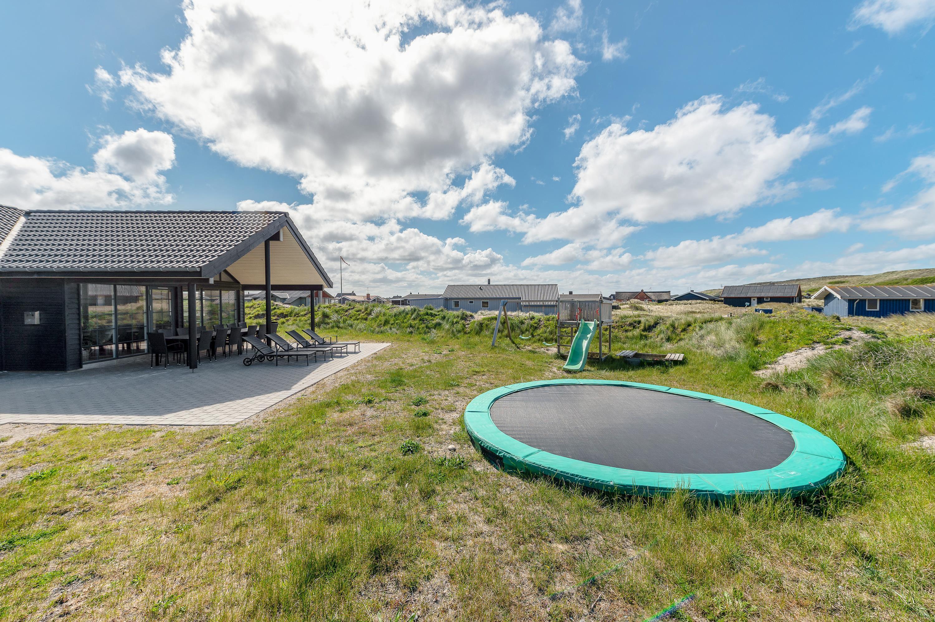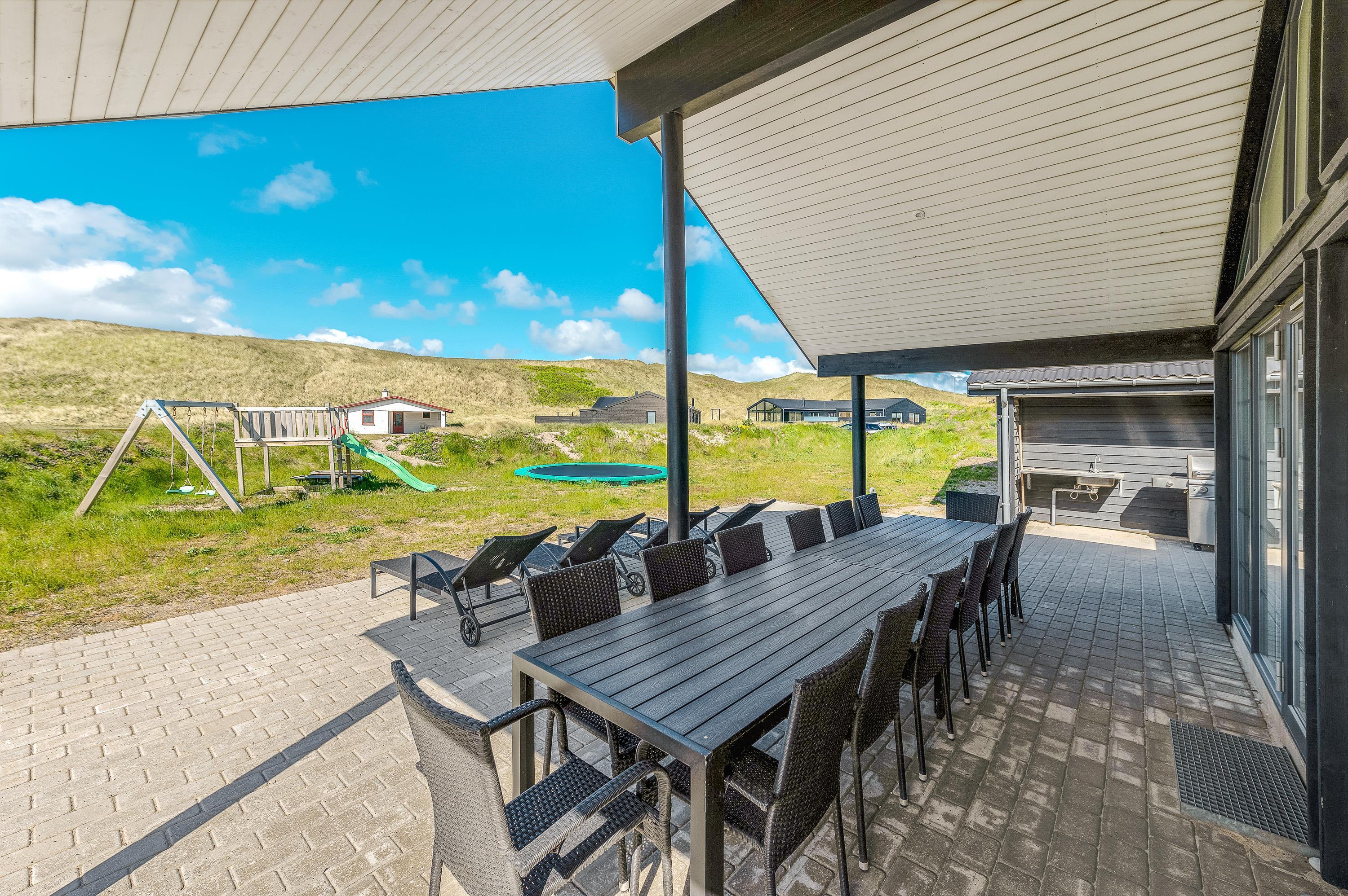 Her kan I dase i det varme vejr, mens børnene og hundene tumler på græsplænen. Der er også sat et gyngestativ op - og på beachvolleybanen kan hele familien tage et spil volleyball. I udekøkkenet (med koldt og varmt vand) kan I gøre aftenens grillmåltid klart og holde en ægte feriemiddag i den lune aftensol.