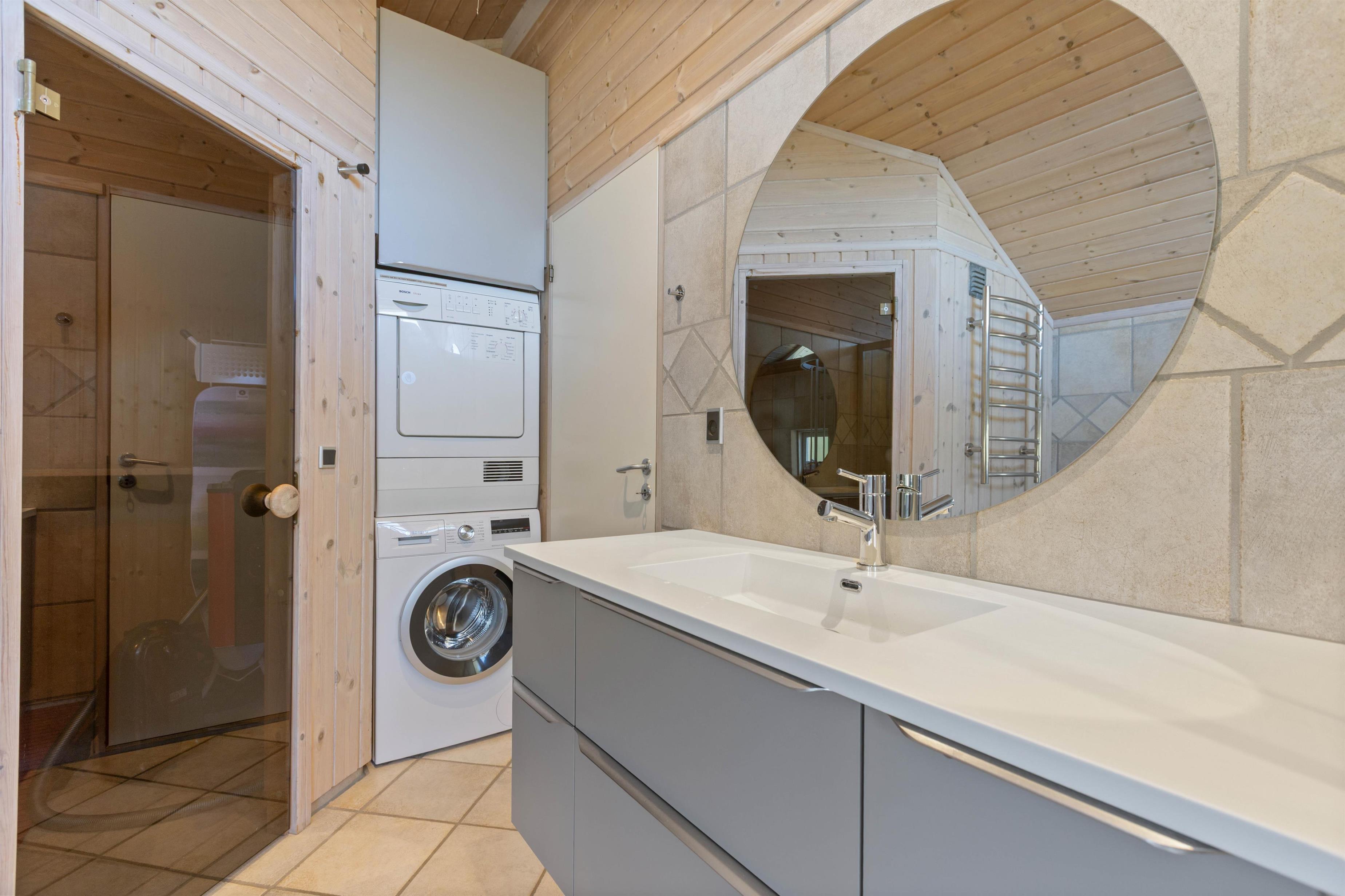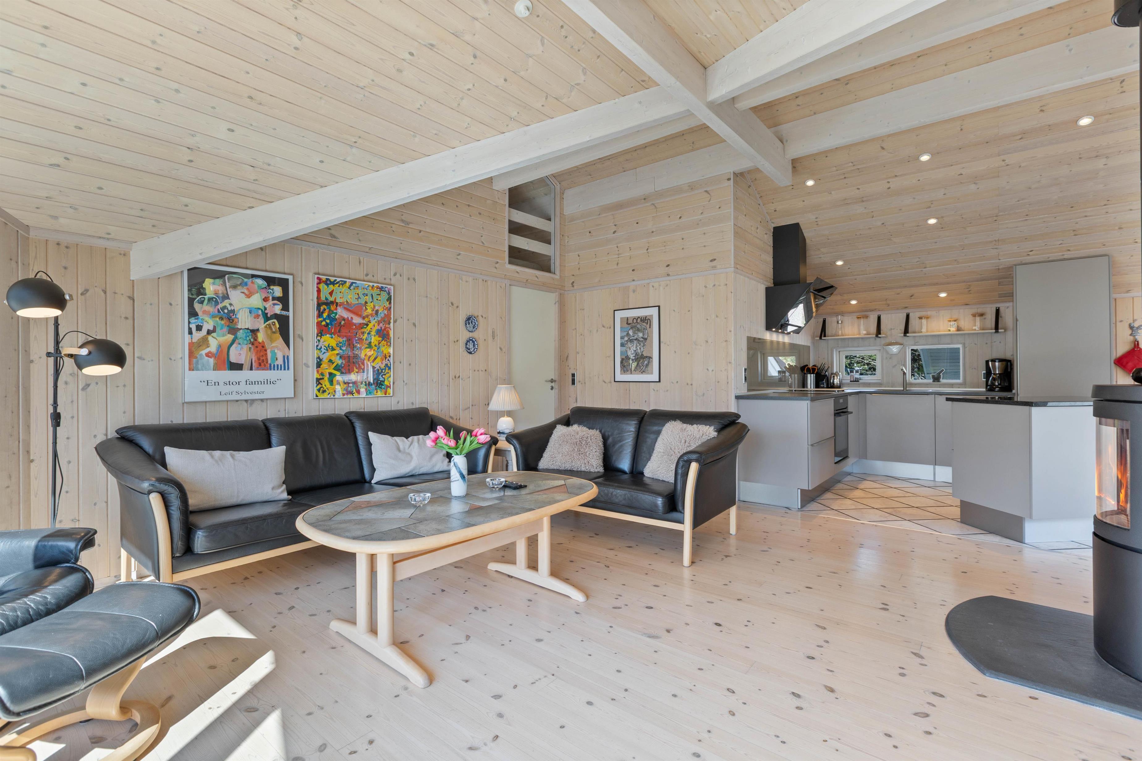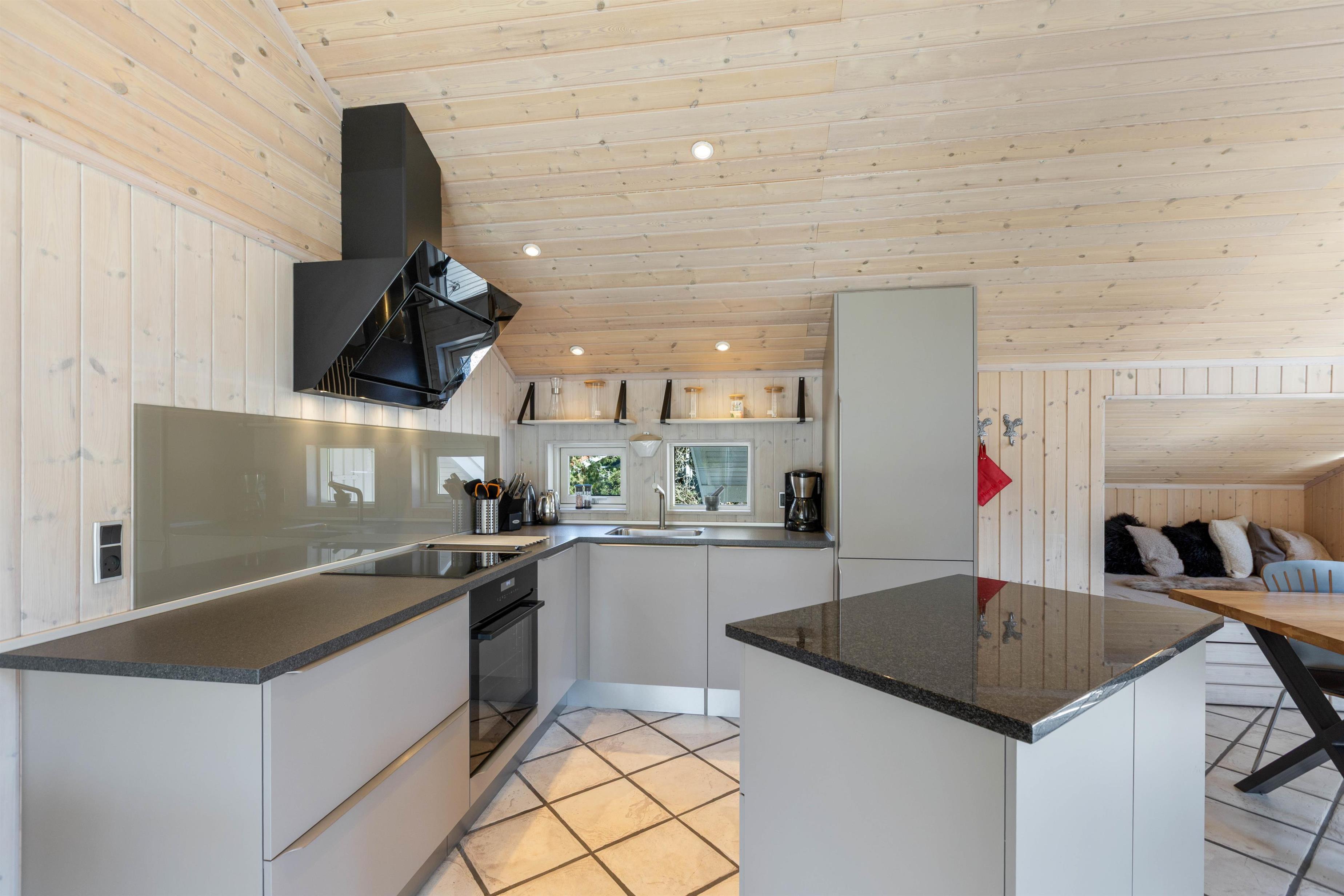 Feriehusets dejlige badeværelse er med gulvvarme, bruseniche, hjørnespa og sauna. Køkkenet er veludstyret med bl.a. opvaskemaskine og 61 l fryser. Der er også gulvvarme i køkkenet. Stuen er rigtig hyggeligt og smagfuldt indrettet. Den dekorative og praktiske brændeovn er godt placeret mellem køkken, spiseafdeling og selve stuen, så den effektivt kan sprede både varme og hygge. Der er desuden fladskærm-TV, DVD og gratis trådløst internet i feriehuset.