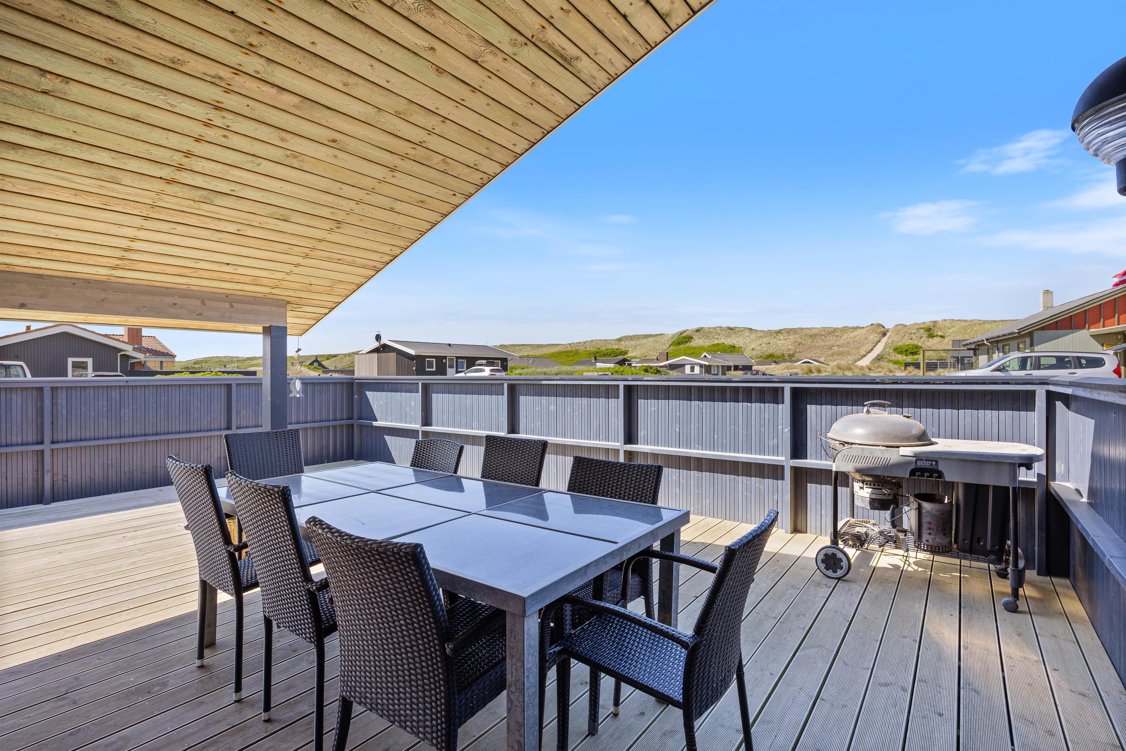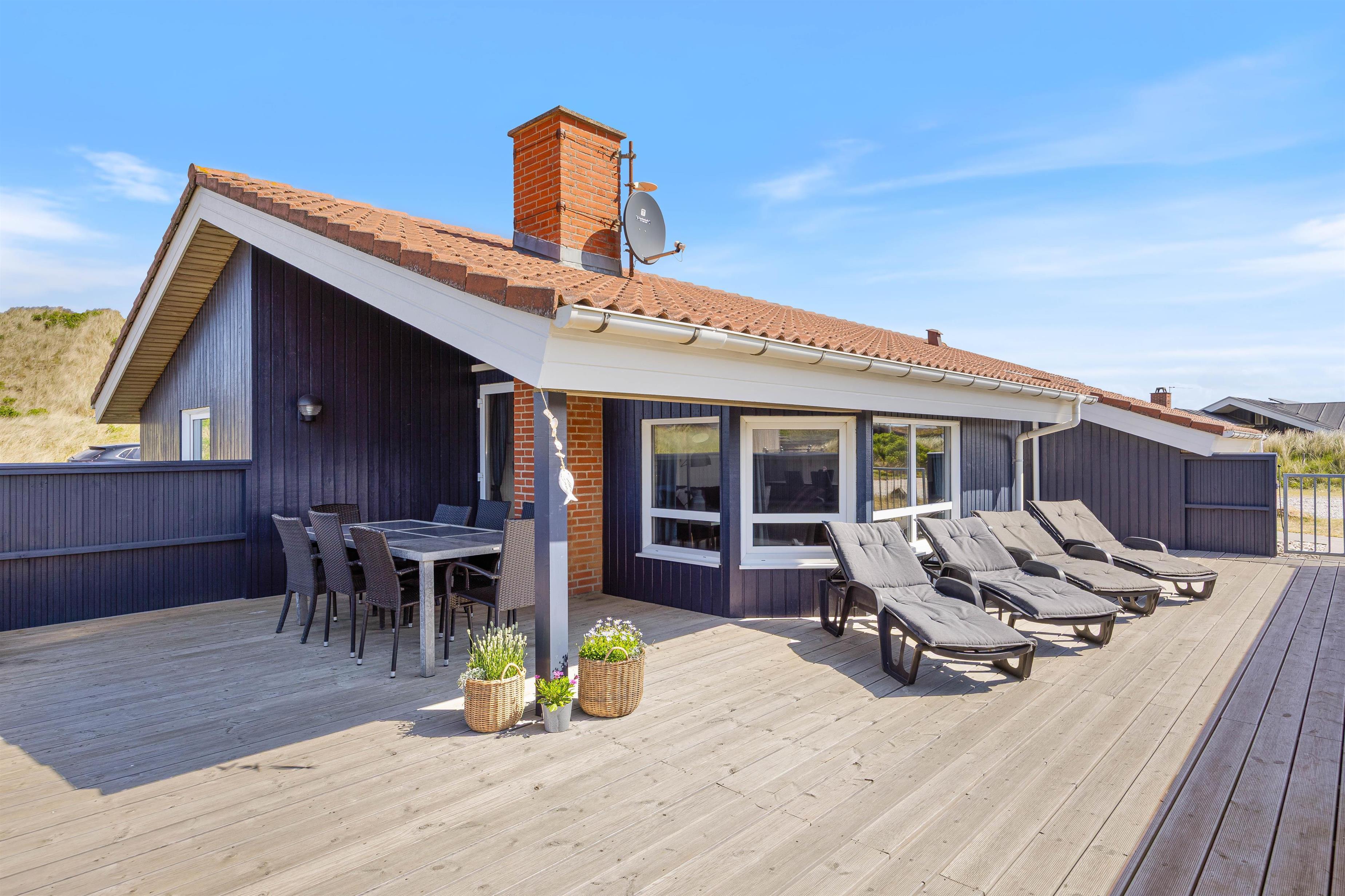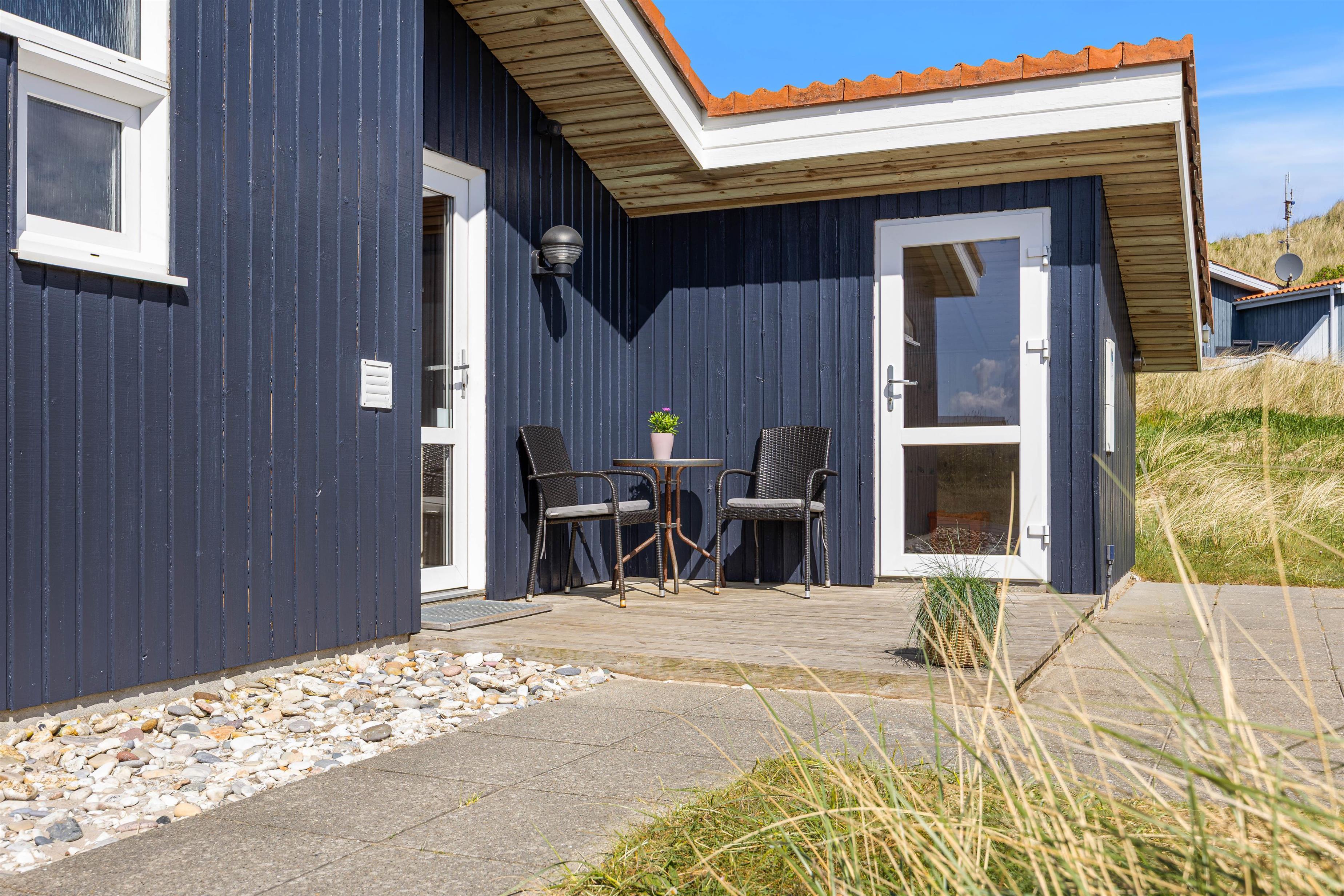 En ægte ferie med børn og hund på den jyske vestkyst, indeholder gode traveture langs det storslåede Vesterhav, som ligger 200 meter herfra. Og lige meget hvilken årstid det er, så er oplevelsen altid unik. Derefter kan du vende tilbage til feriehuset, tænde op i brændeovnen og nyde lidt varmt at drikke med god hyggemusik i baggrunden – bedre kur mod stress fra hverdagen findes ikke. Derudover er feriehuset også udstyret med en energibesparende varmepumpe.