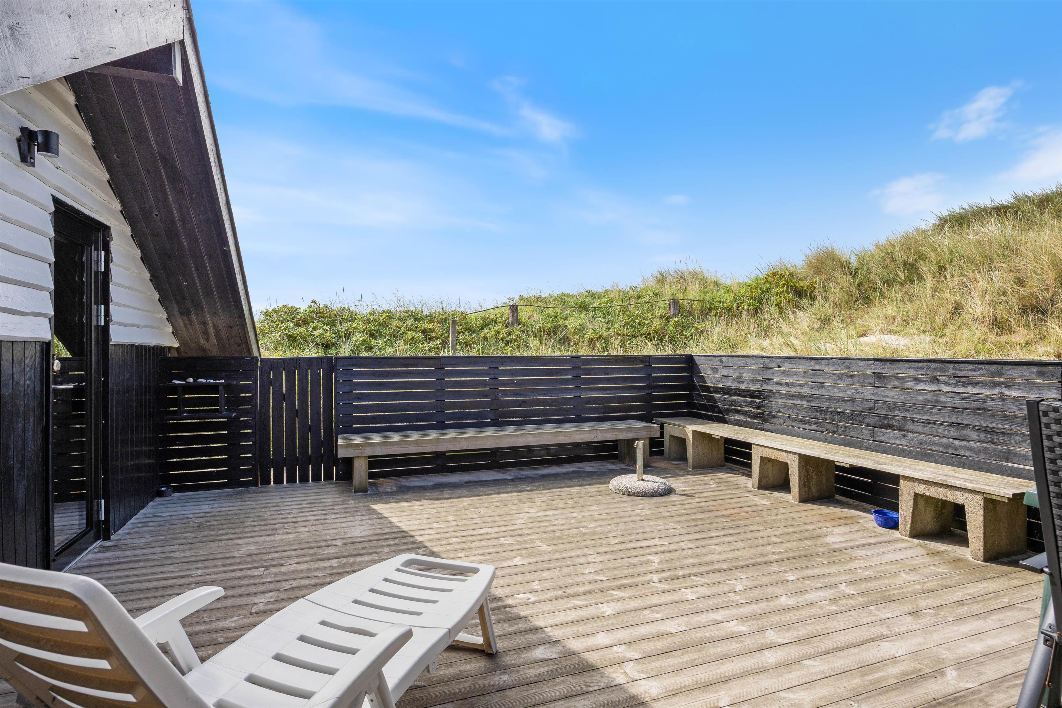Slap af i hyggelige omgivelser i dette lille feriehus. De skønne omgivelser, den salte luft og bruset fra Vesterhavet, – alt sammen er med til at sætte rammen om en god ferie – fuld af afslapning og smukke naturoplevelser. Stranden er kun et stenkast fra den lukkede terrasse i sydvest. Terrassen er møblet og indbyder til hyggelige stunder med grillaftner med lækker mad tilberedt på gasgrillen, kortspil og drinks samt solbadning fra liggestolene. Hunden kan gå frit her, og terrassen kan tilgås fra stuen.