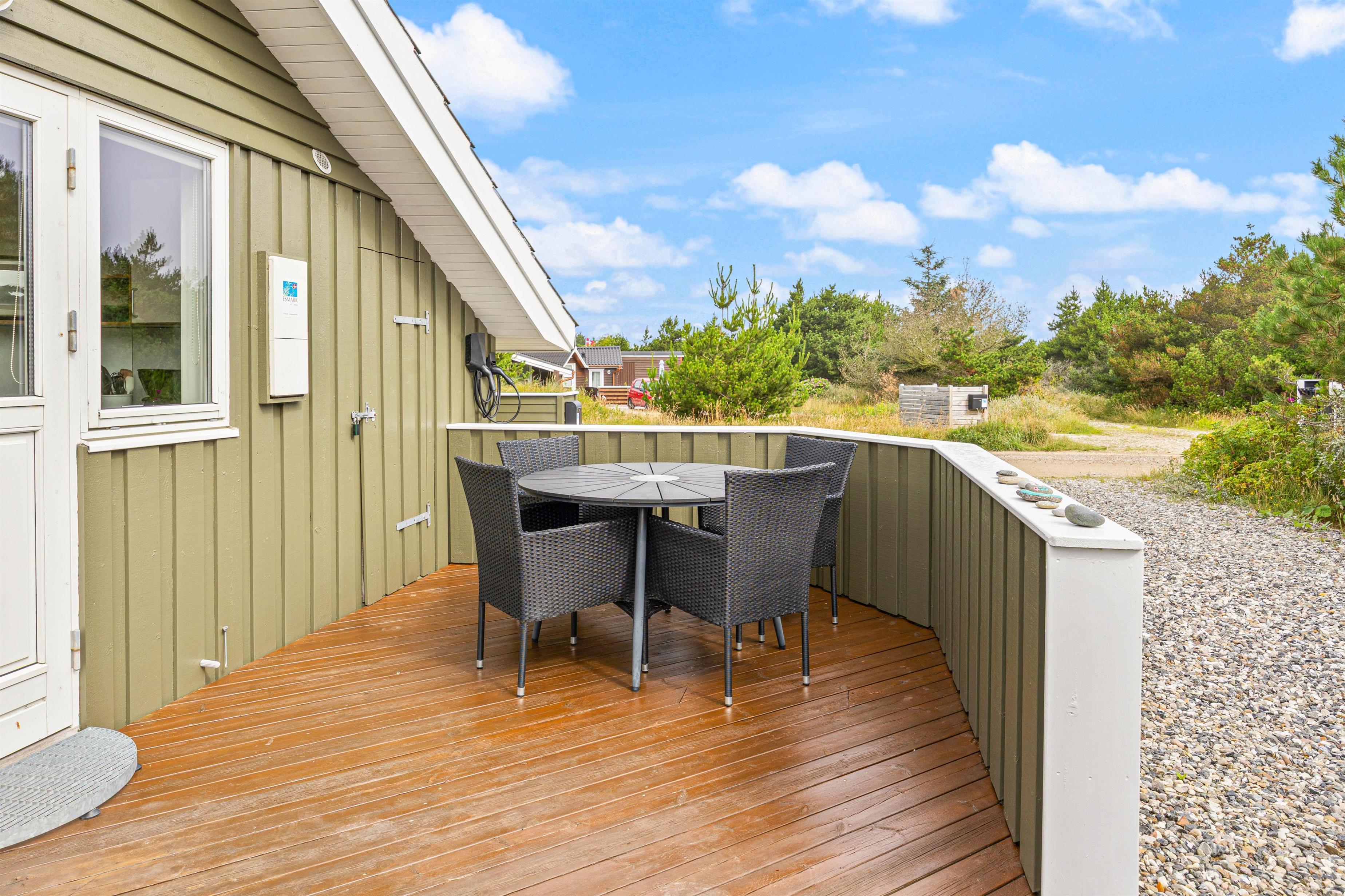 Allerede fra morgenstunden kan I gøre brug af sommerhusets gode terrasser. Ved indgangsdøren er der en lille østvendt terrasse, hvor I kan nyde de tidlige morgentimer, inden hundene skal med på en 700 meters gåtur til købmanden efter nybagte rundstykker til morgenmaden.