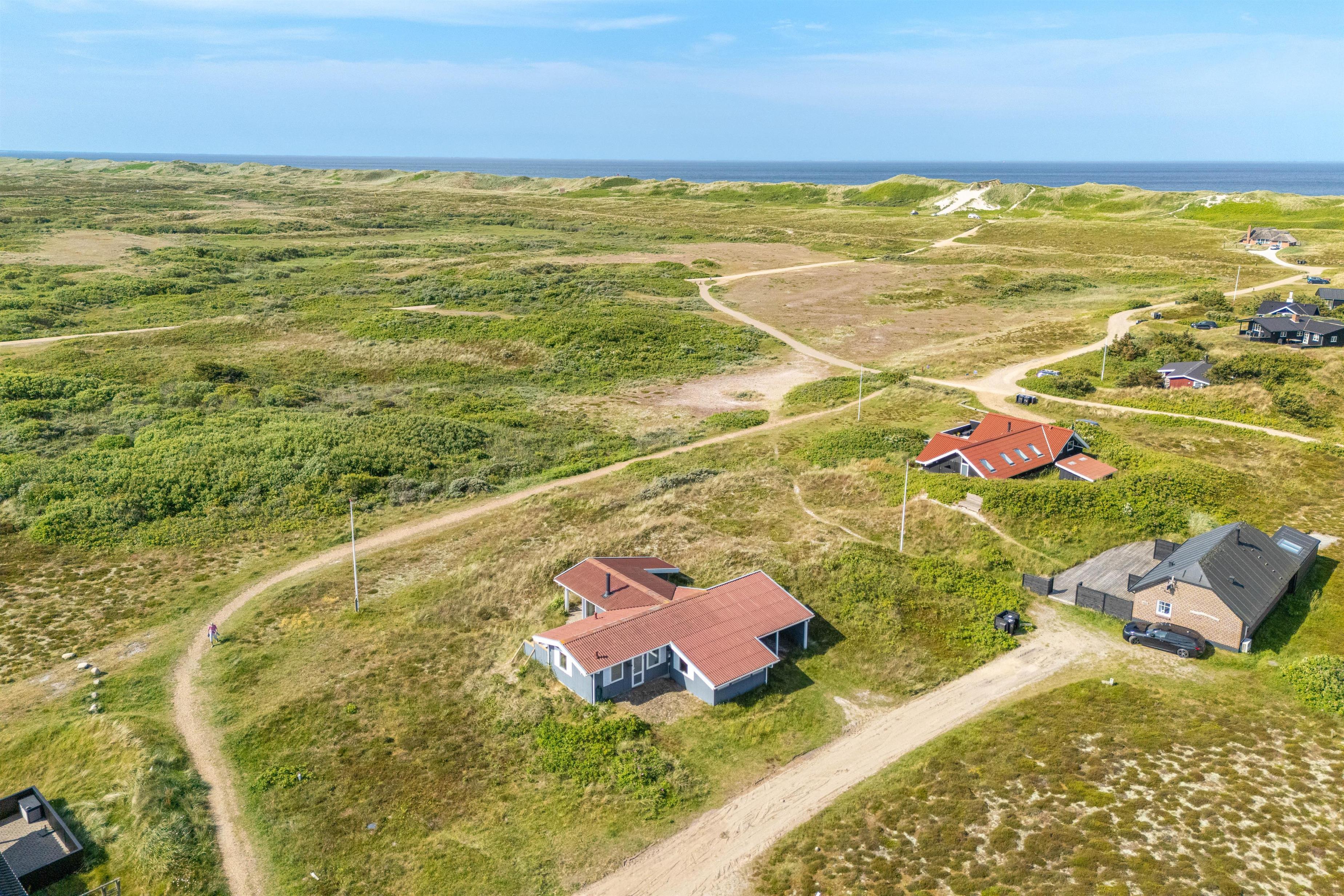 Der er både en overdækket og en afskærmet del af terrassen, hvor I kan finde læ og nyde en kop kaffe eller et måltid. Den omkringliggende grund er på ca. 1.270 m², og der er mulighed for at grille på sommeraftener, hvis vejret tillader det. Udsigten er præget af den omkringliggende naturgrund og klitlandskab.