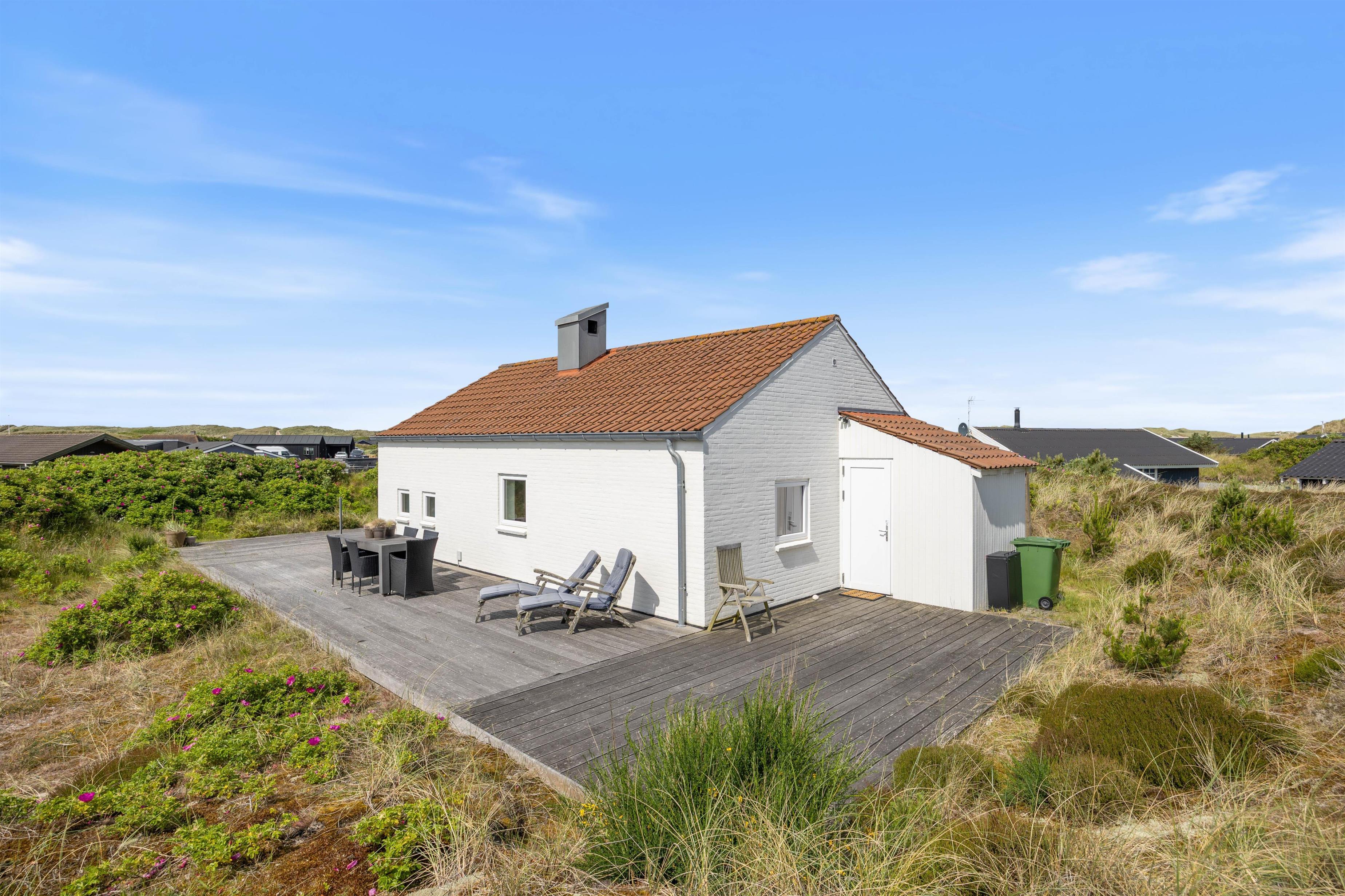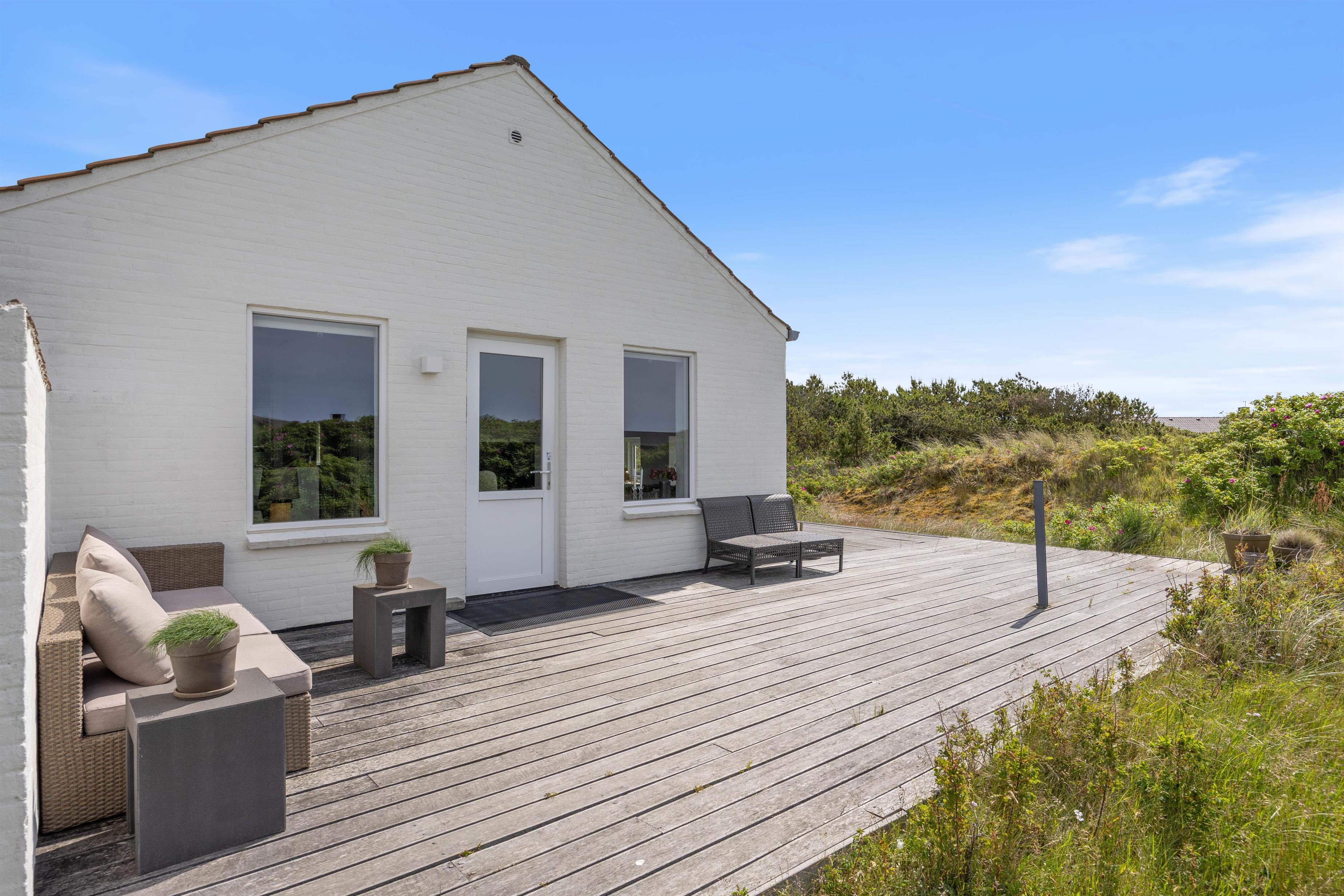Der er terrasse på 3 sider omkring sommerhuset, hvor I kan følge solens gang. Her kan I nyde opholdet og den friske luft på natur- og klitgrunden. Benyt lejligheden til at trække jer tilbage i et roligt hjørne med en krydsord eller sudoku. Slap af i de komfortable havemøbler eller liggestole og lad maveskindet få lidt solskin.