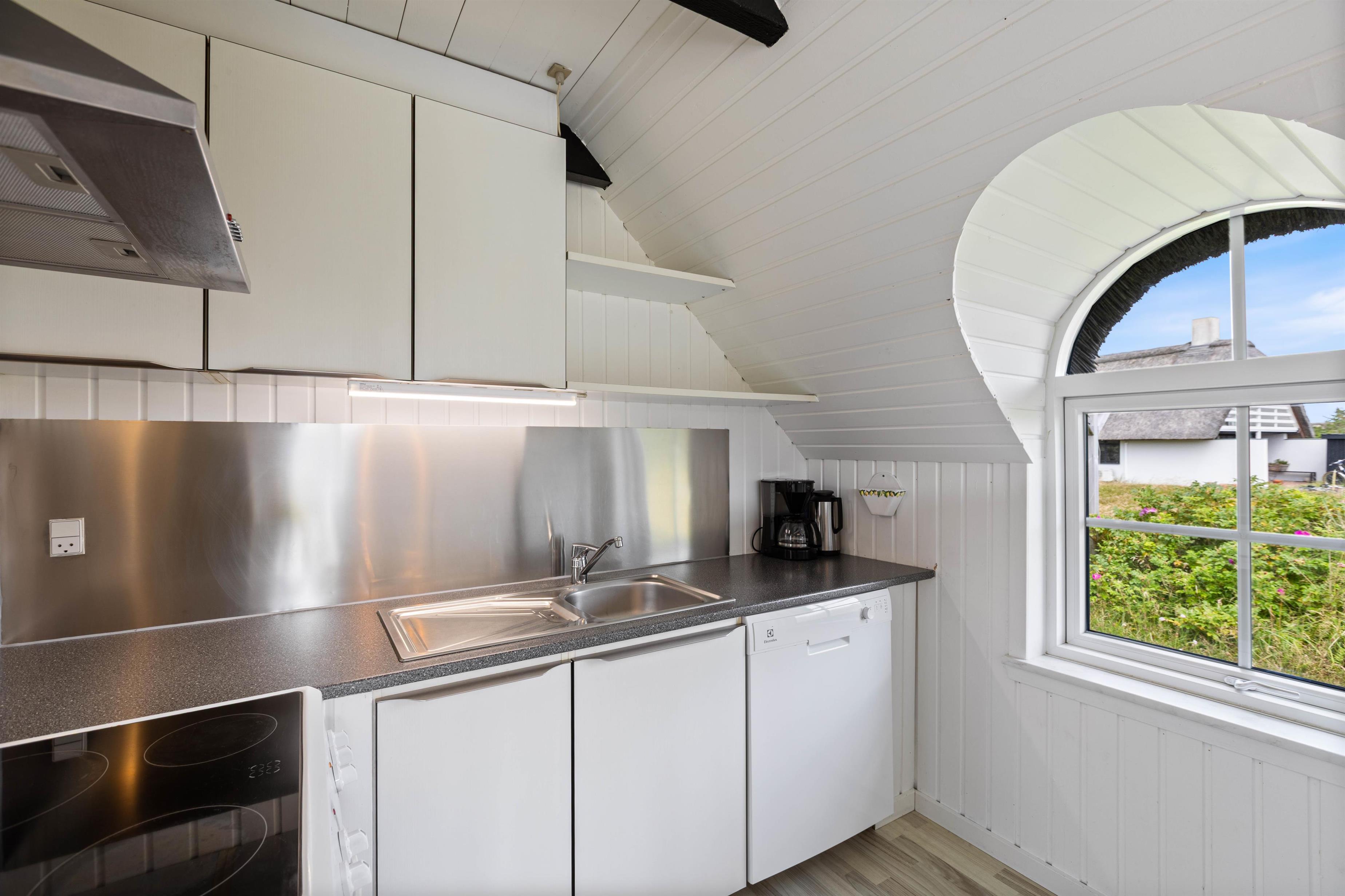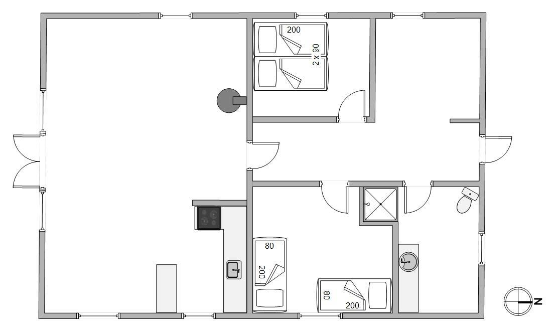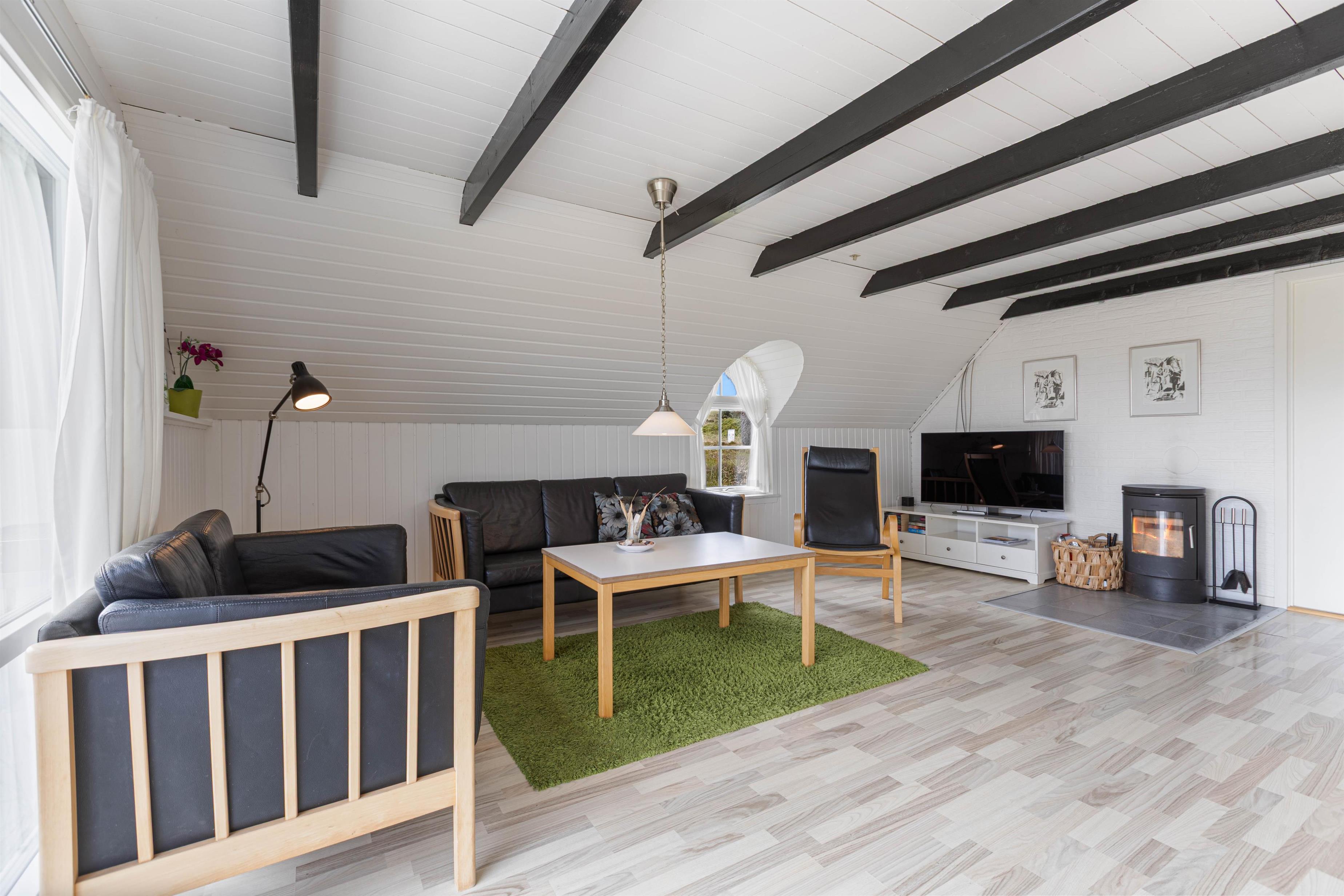 Sommerhuset er traditionelt indrettet med 2 soverum og et lille køkken i åben forbindelse med stuen. Det store sydvendte vinduesparti lukker lyset og naturen ind i stuen. Tænd op i brændeovnen og hyg dig med en god bog eller nyd den smukke udsigt til heden og klitterne. Feriehuset har også en energibesparende varmepumpe, som I med fordel kan benytte jer af til at holde en behagelig temperatur i rummet.