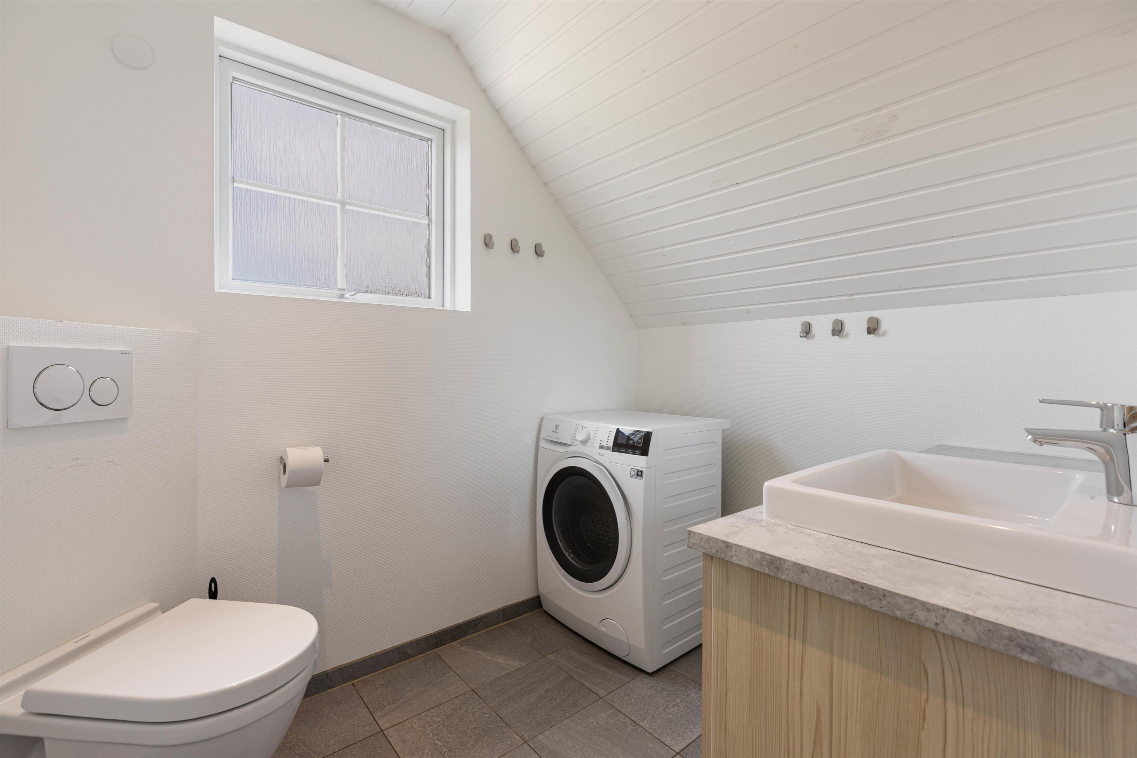 Sommerhuset badeværelse er flot og rummeligt. Her er der også en vaskemaskine/tørretumbler, så I har muligheden for at vaske lidt tøj eller håndklæder i løbet af ferien.