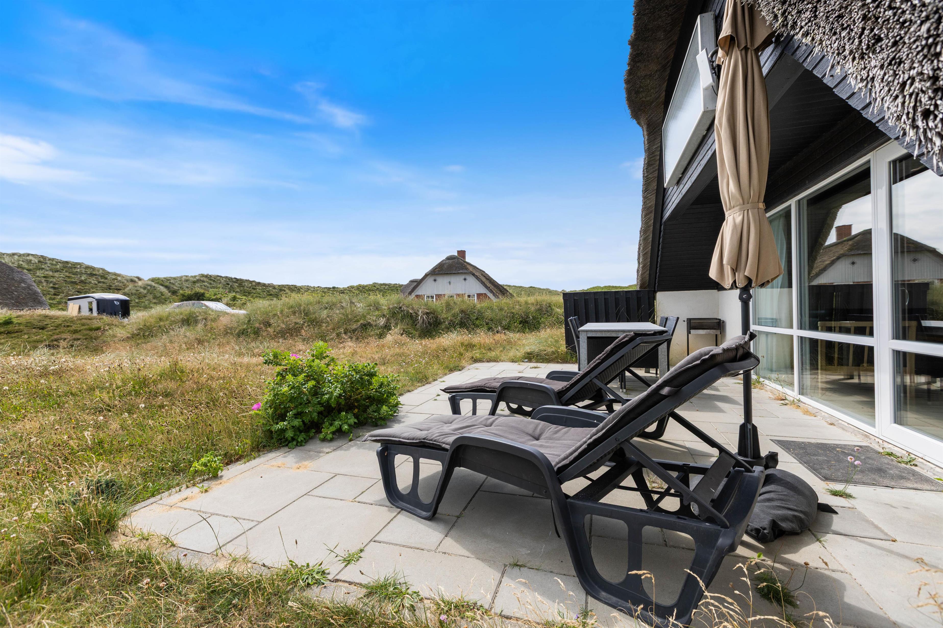 Fra stuen er der udgang til den sydvendte og afskærmede terrasse. Terrassen er naturligvis udstyret med det, du behøver for også at nyde ferien udendørs. Slap af på liggestolen eller tænd op i grillen og nyd en god middag med venner og familie.