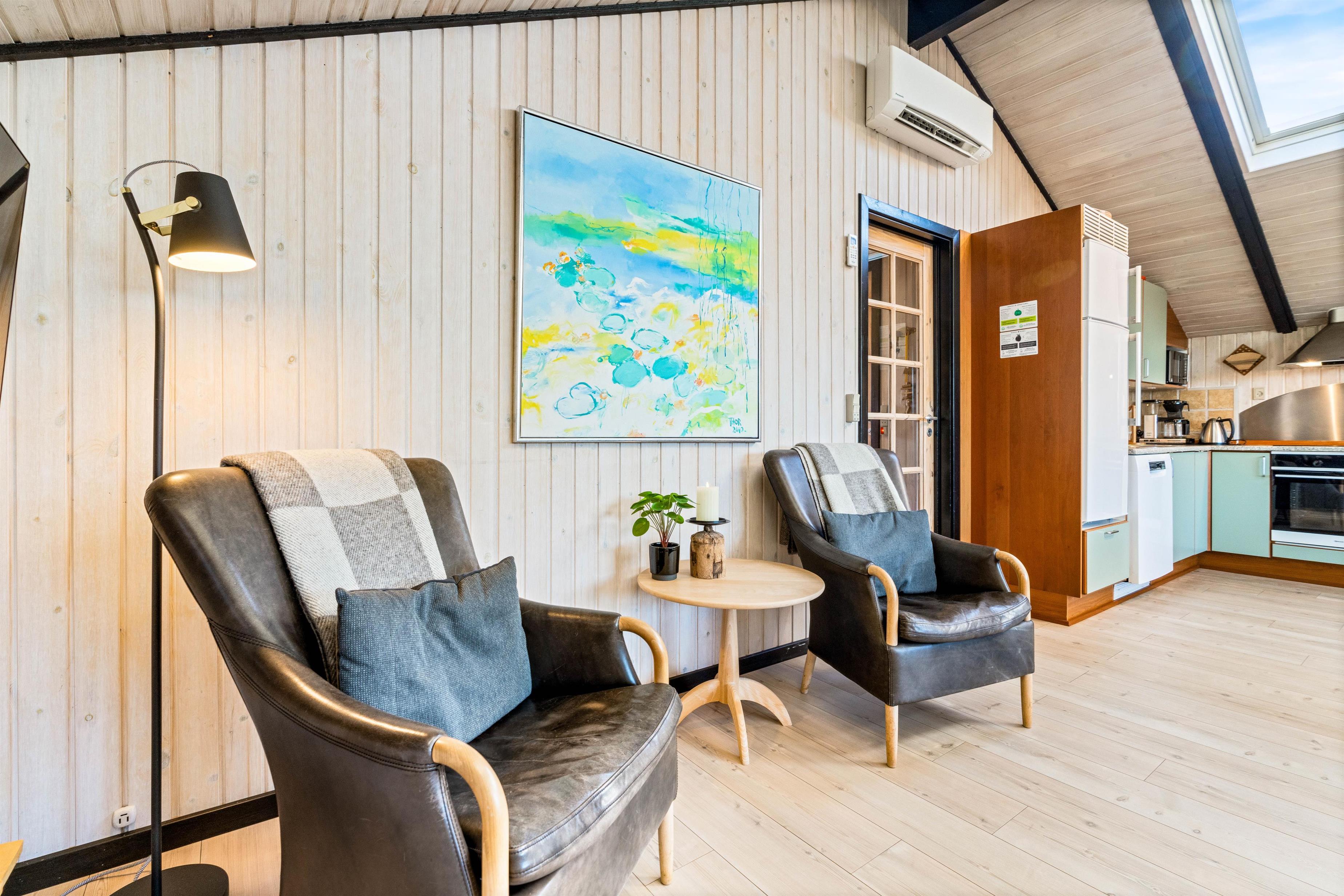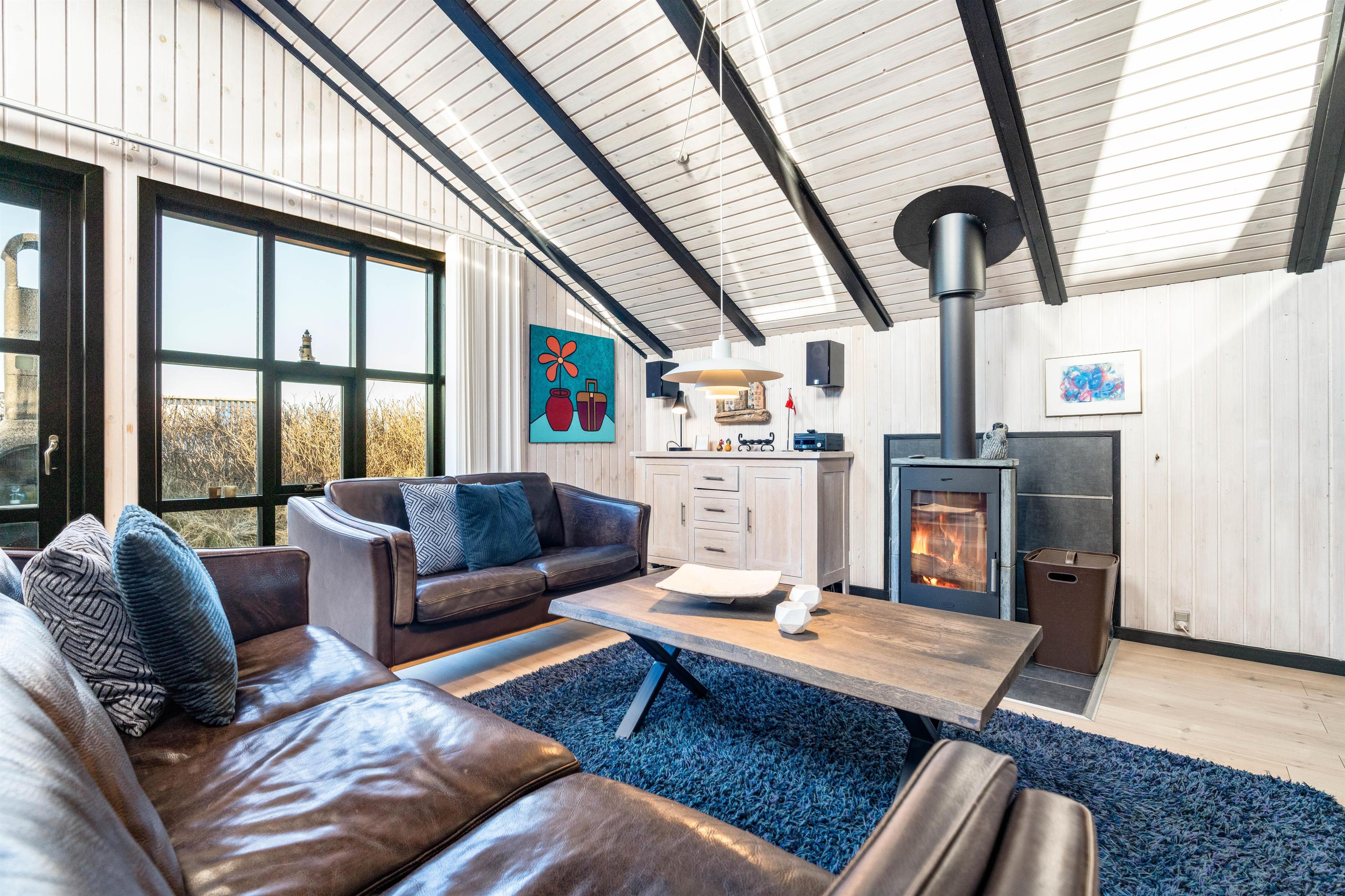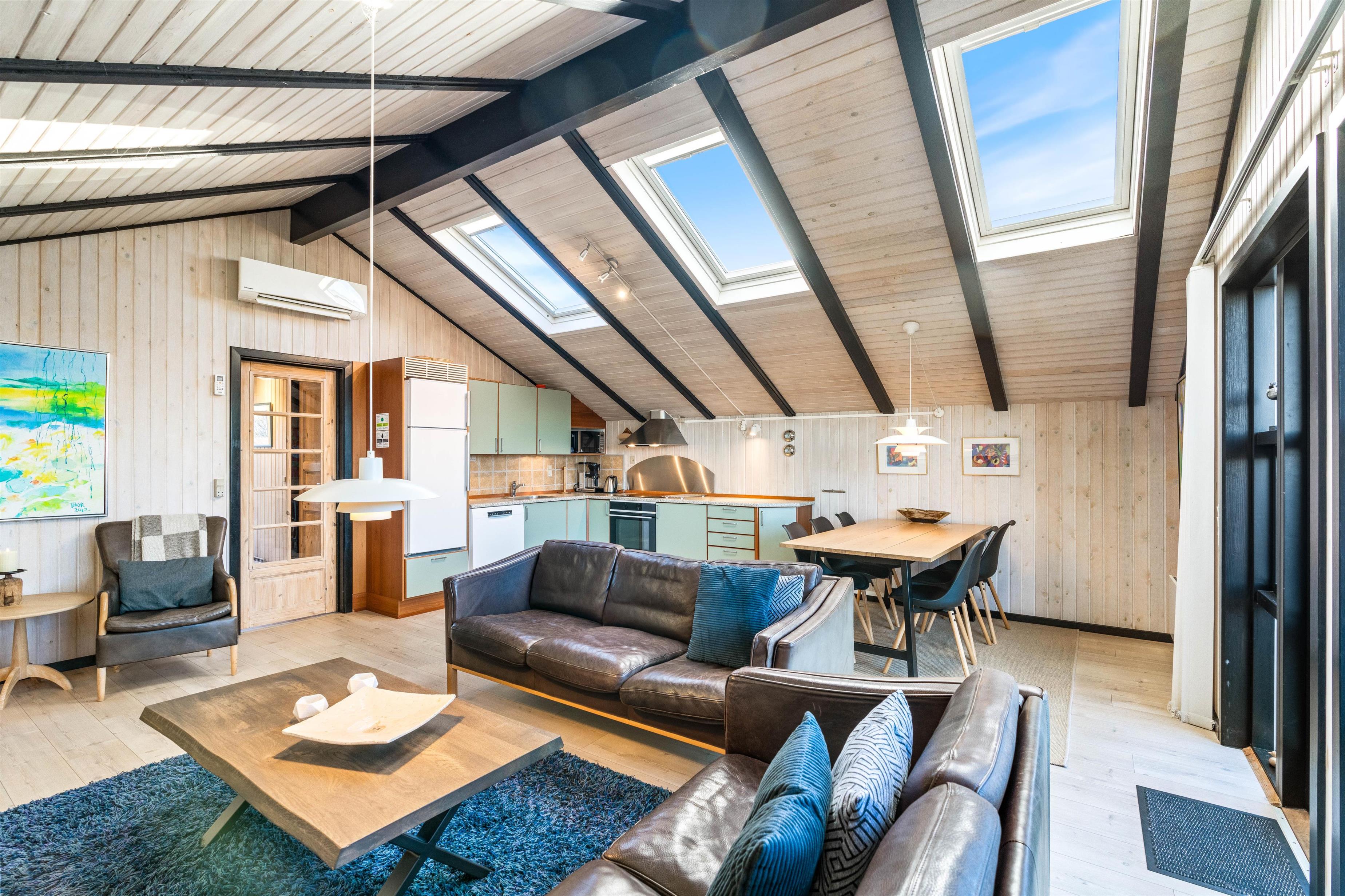 Rundt om sommerhuset er der flere dejlige terrasser med gode læforhold. Her står komfortable havemøbler, liggestole og en grill klar til hyggelige stunder under åben himmel. Mod syd findes en overdækket del, hvor du kan sidde ude selv på dage med lidt vind eller småregn. På toppen af klitten bag sommerhuset ligger en lille udsigtsterrasse, hvorfra du kan nyde panoramaudsigten over området, klitterne, heden og fjorden i det fjerne.