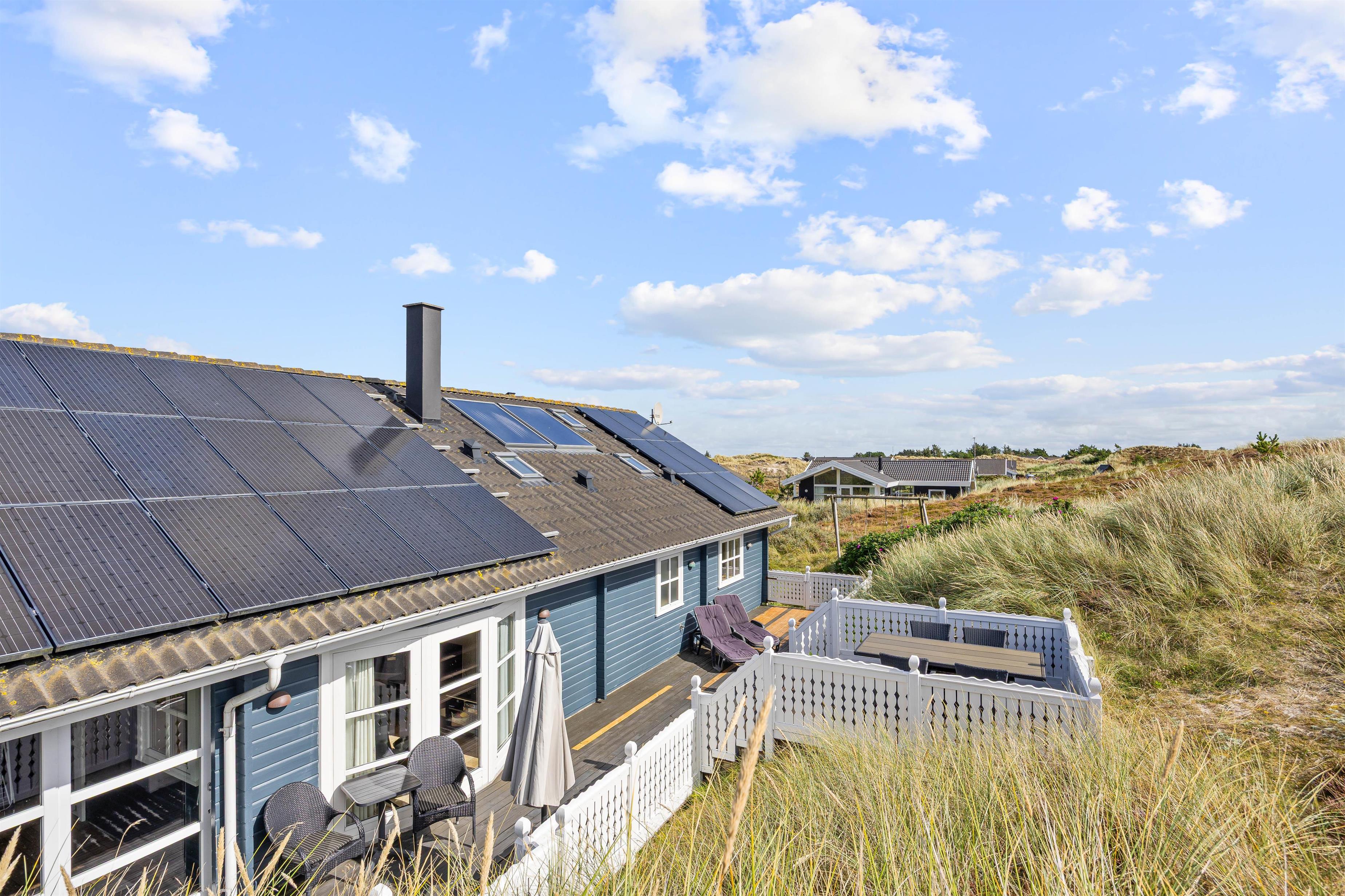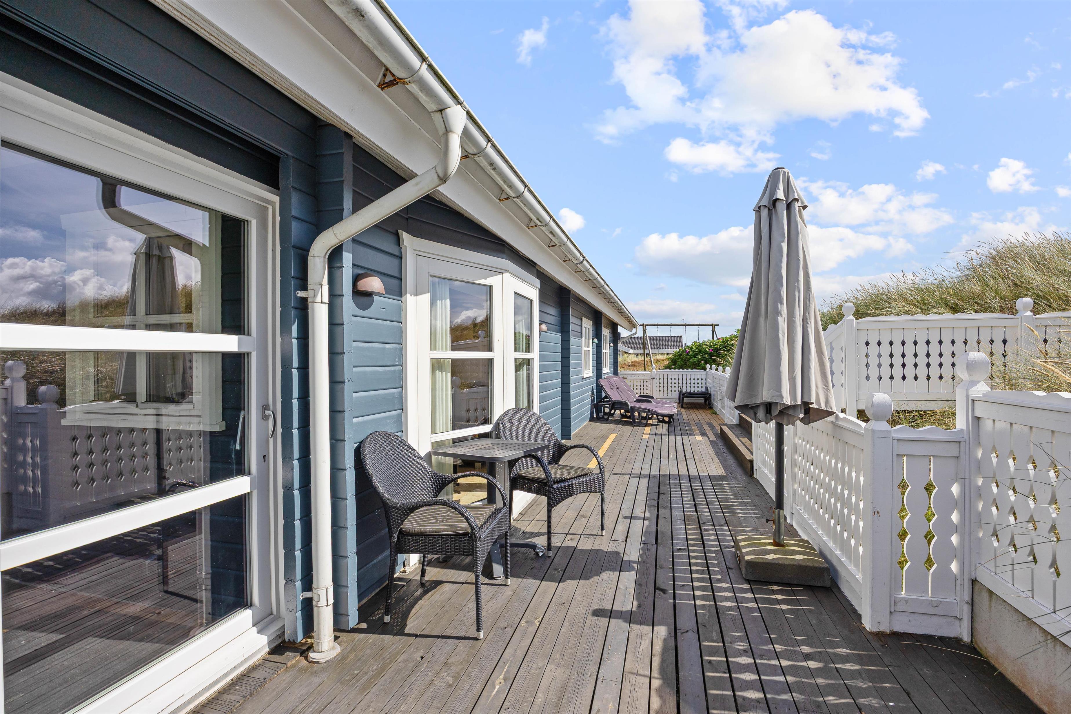 På den skønne, lukkede terrasse kan I uforstyrret kan nyde morgenkaffen og hyggelige grillaftener. En del af terrassen er overdækket, så selv i det til tider drilske danske sommervejr kan I sidde ude og nyde den friske vesterhavsluft. Fra terrassen har I en flot udsigt til de marehalmsklædte klitter, der kendetegner naturen ved Vesterhavet.