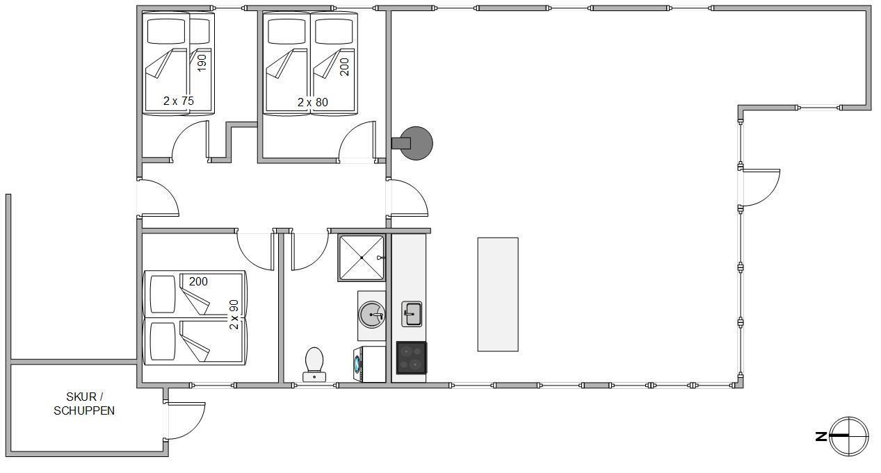 De 81 velindrettede kvadratmeter har plads til 5 personer. Indretningen er varm og indbydende, og med en brændeovn som hjerte i stuen kan I samles til hyggelige aftener med brætspil eller en god film. Det åbne køkken er moderne indrettet med induktionskomfur og opvaskemaskine.