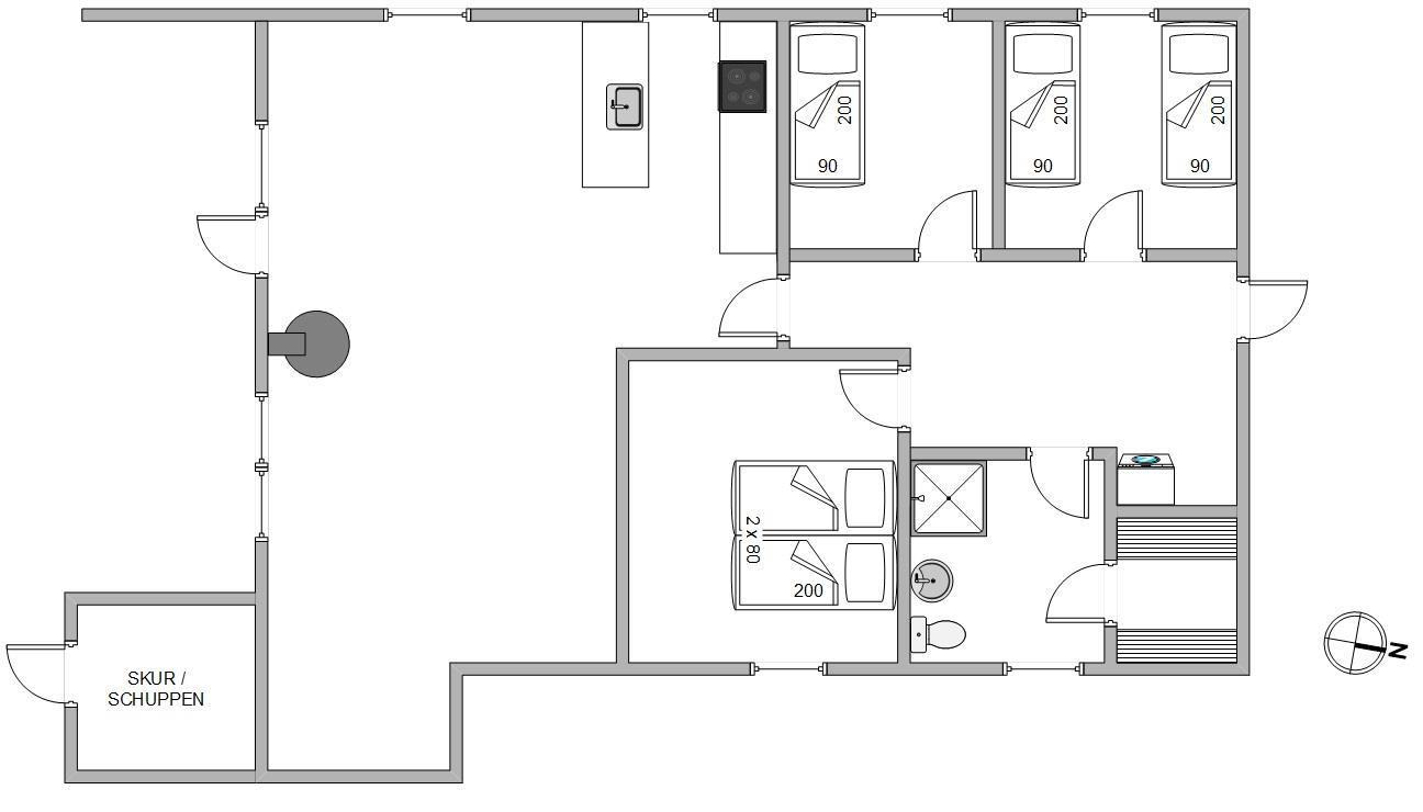 Dette sommerhus har 5 sovepladser, fordelt på 3 soveværelser. Alle med gulvtæppe, trævægge og loft til kip. Et af værelserne er med dobbeltseng, et med 2 enkeltsenge og det sidste værelse med en enkeltseng. Badeværelset er lyst og venligt, med bruseniche og indgang til husets sauna. Køkkenet, der ligger i åben forbindelse med stuen, er udstyret med bl.a. opvaskemaskine, mikroovn og en 50 liters fryser. Stuen er hyggelig og med et dejligt lysindfald fra de sydvendte vinduer. Her er bl.a. en skøn, centralt placeret brændeovn, som giver både hygge og varme i de kolde måneder og en DAB+ radio med Bluetooth. Desuden har huset en energibesparende varmepumpe. Der er gratis trådløst internet i huset.