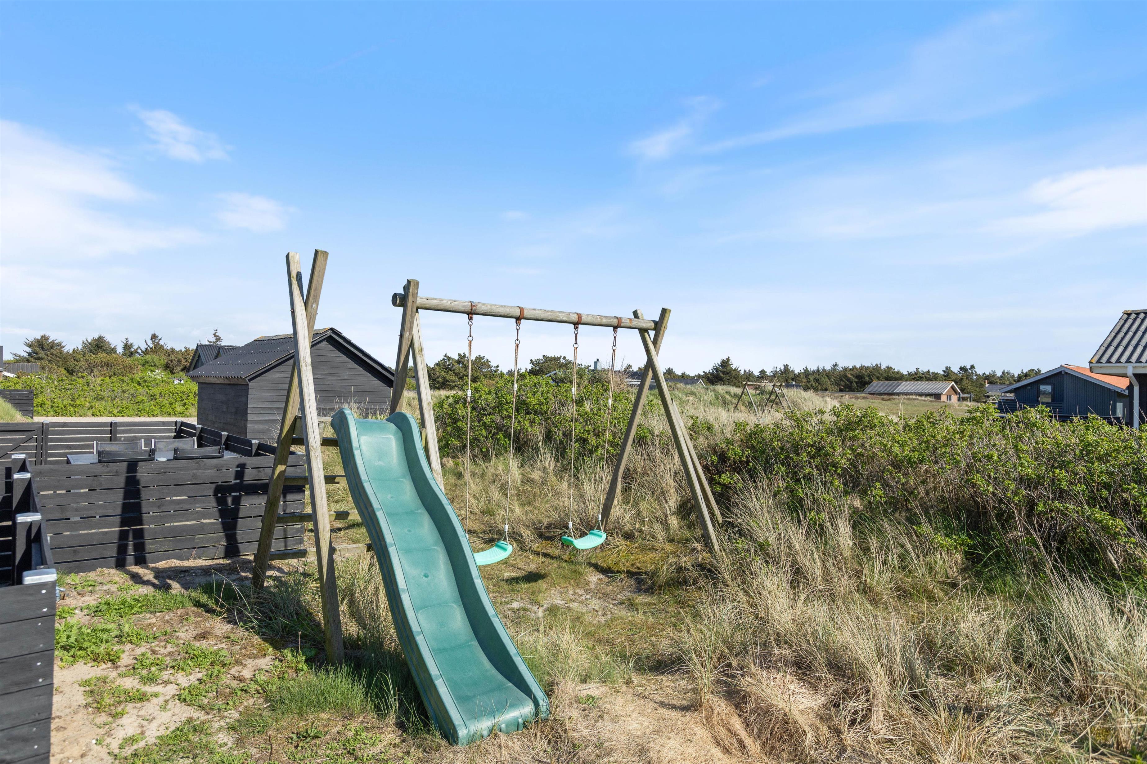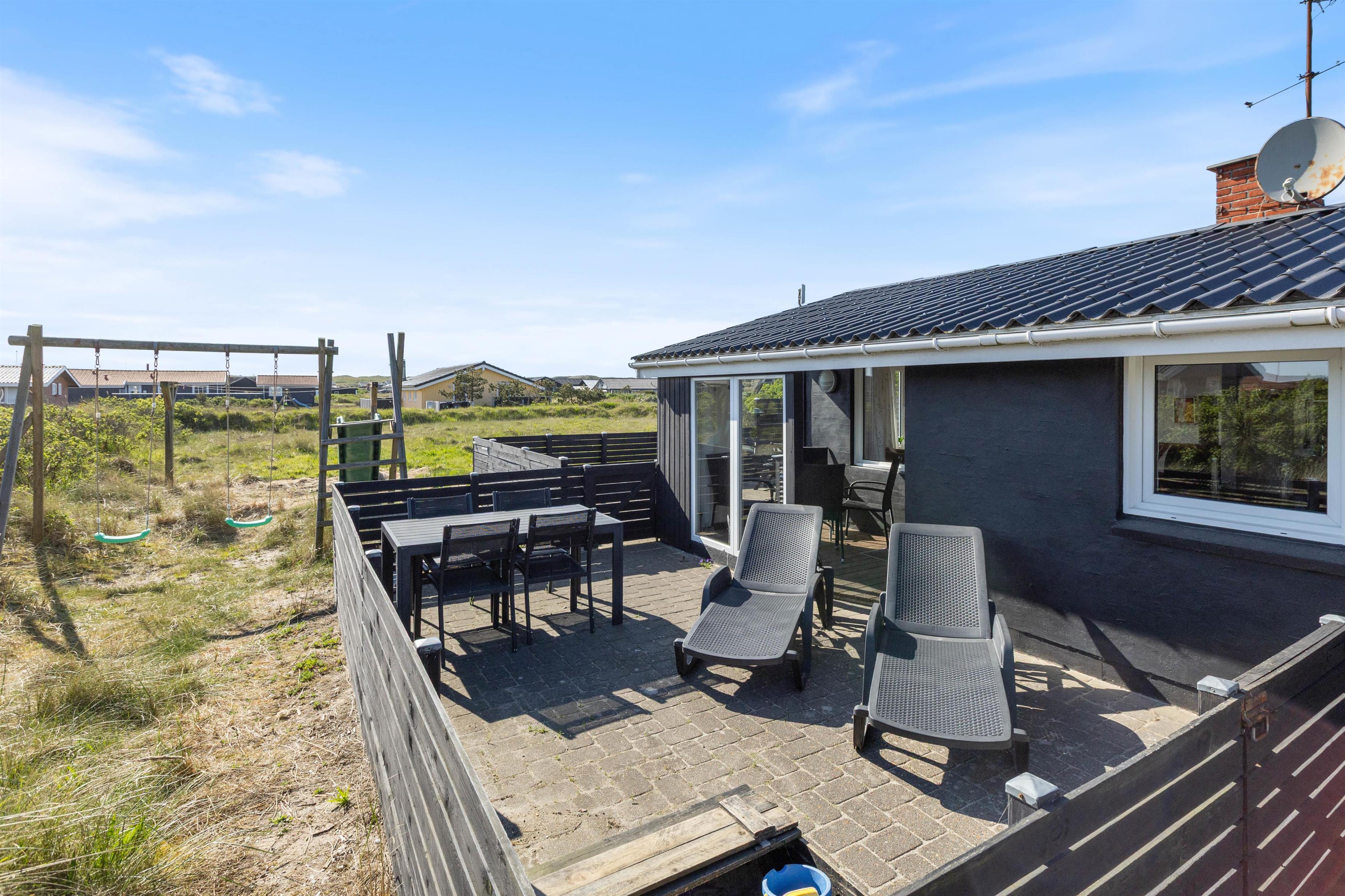 Den ene af de 2 store, møblerede terrasser er helt lukket og derfor særdeles velegnet, hvis man er en familie med småbørn og/eller hund – her kan man tumle sig frit, og børnene har desuden gode legeredskaber til rådighed.