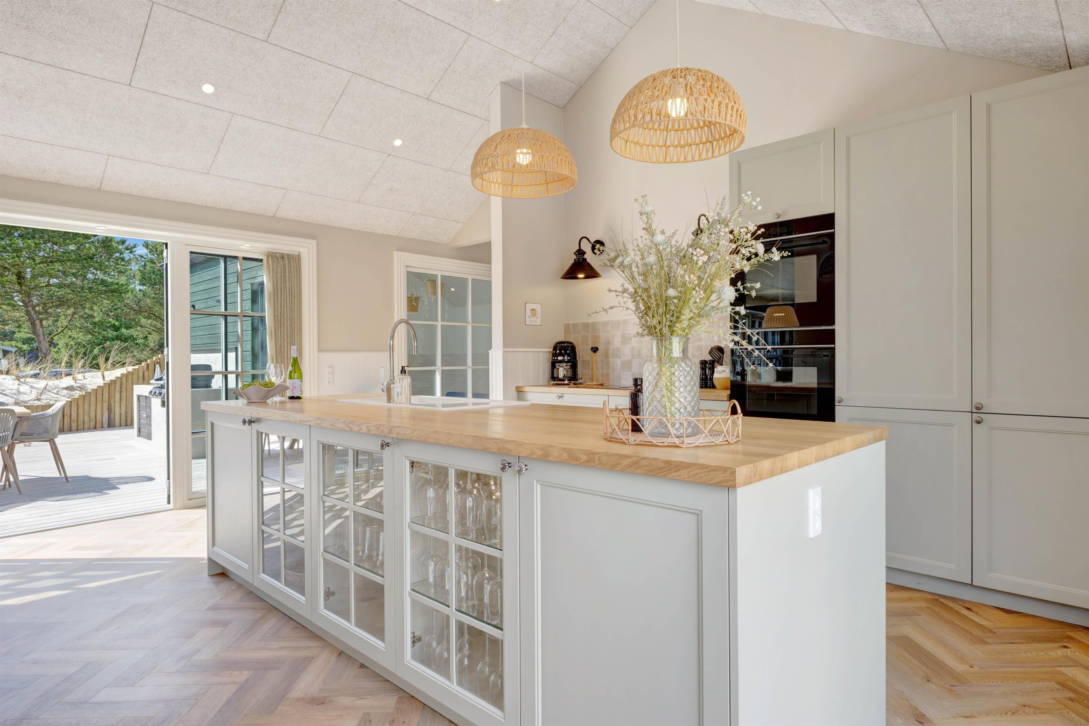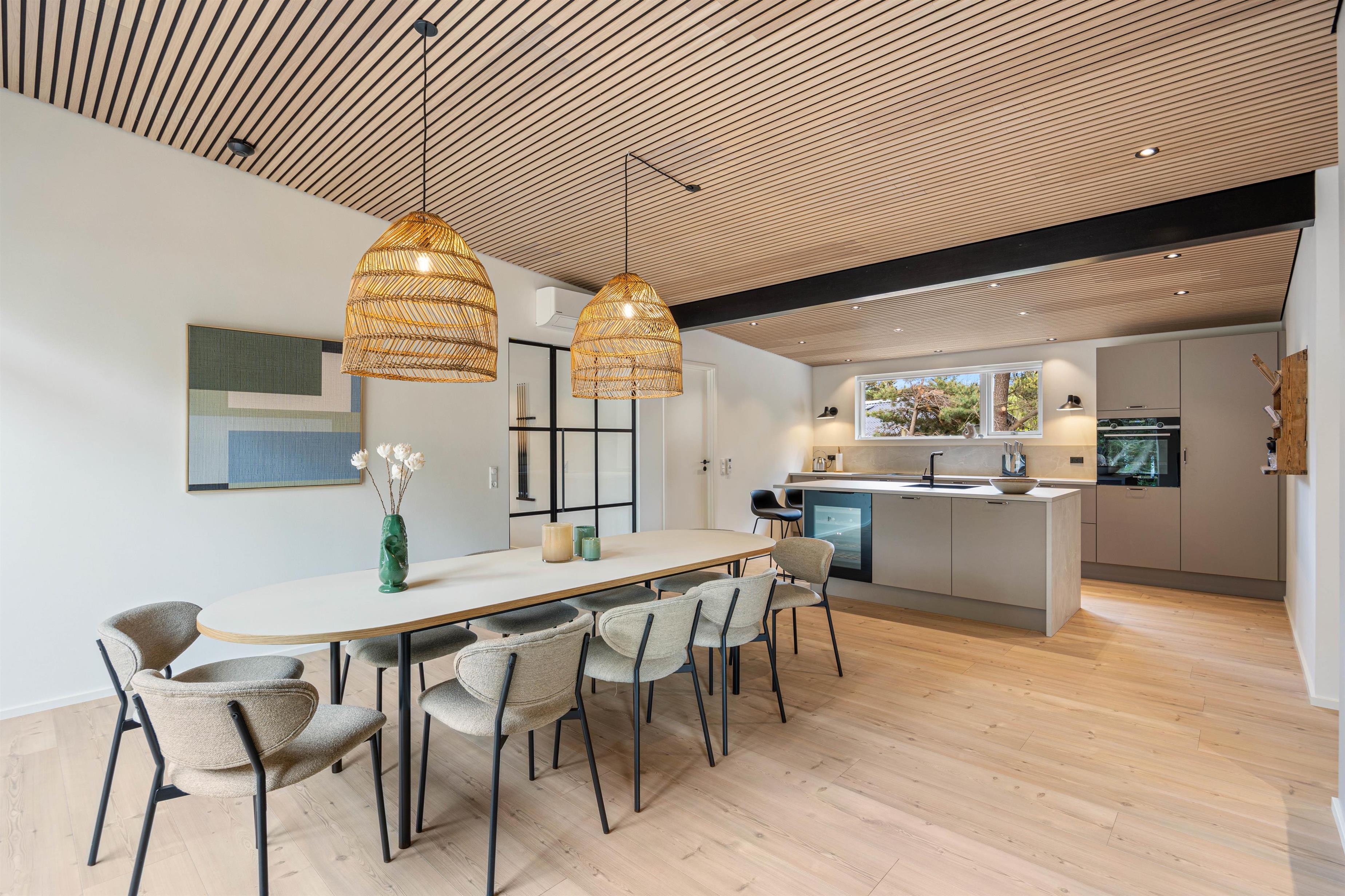Sommerhuset på Bjerregårdsvej 189 er bygget i 2025 og har med sine 180 kvadratmeter god plads til 10 personer. Indretningen er moderne og holdt i rolige og lyse nuancer. Her er et stort åbent køkkenalrum med et veludstyret køkken, stue og spiseplads i ét – centralt i rummet står den knitrende hyggelige brændeovn. Her er god plads til hyggeligt samvær – uanset om det er afslapning på sofaen, tilberedning af lækre måltider eller hyggelige brætspilsaftner. Med et Chromecast kan I altid streame jeres yndlings-programmer, når det passer jer.