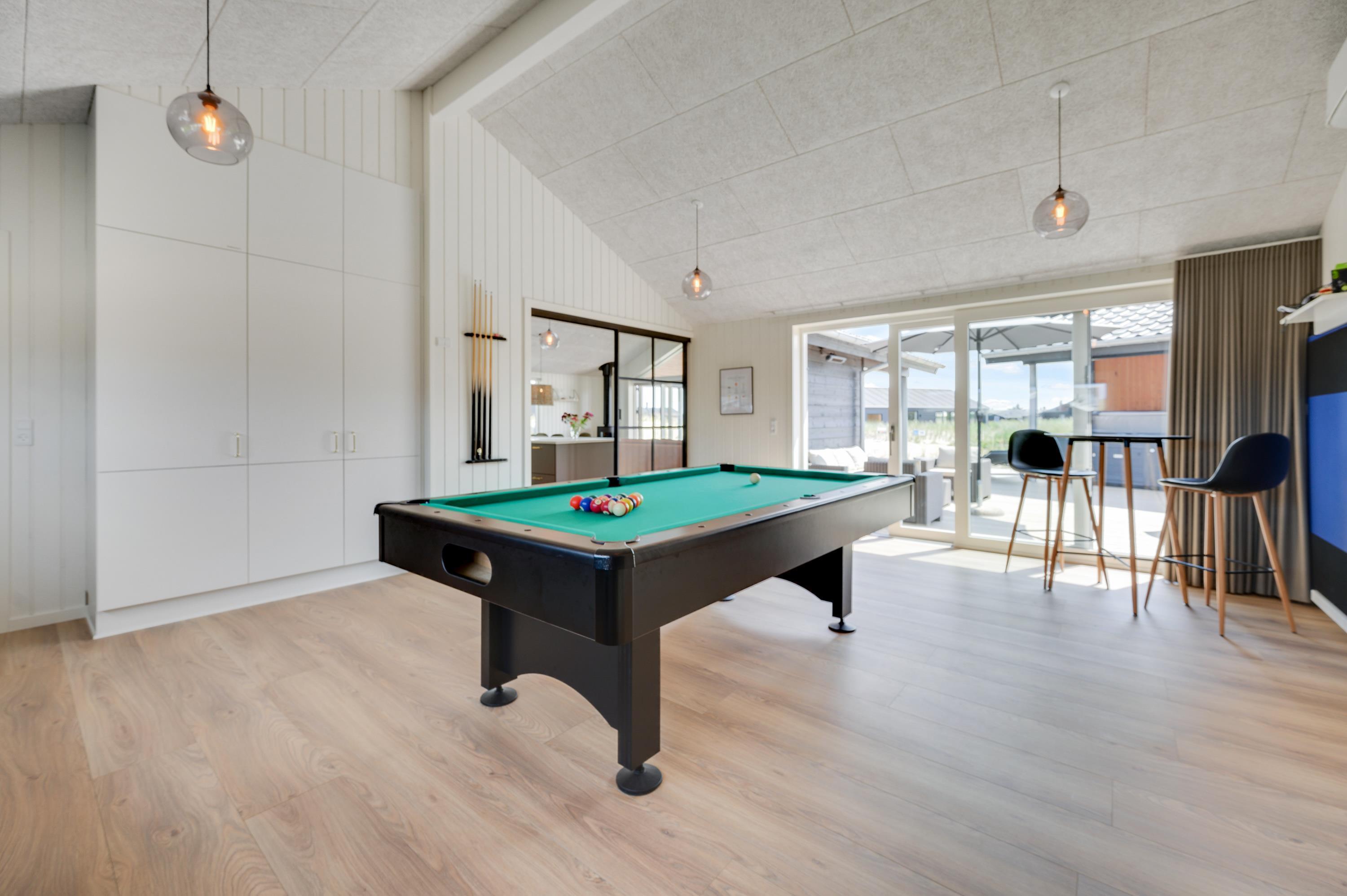 To højdepunkter må være swimmingpoolen og det skønne aktivitetsrum, hvor I finder bordtennis og billard. I poolen kan børnene lege, svømme mod strømmen fra svømmetræneren, mens I kan dyste om at finde feriens bedste bordtennisspiller. Uanset vejret og årstiden er her lovet timevis af sjov. I aktivitetsrummet finder I desuden hemsen, hvor 2 af sovepladserne er at finde. Resten er på de 4 soveværelser, der alle er udstyret med komfortable dobbeltsenge, 180x200. Praktisk er her 3 badeværelser, og her finder I alle hverdagens hjælpere såsom opvaskemaskine samt vaskemaskine og tørretumbler.