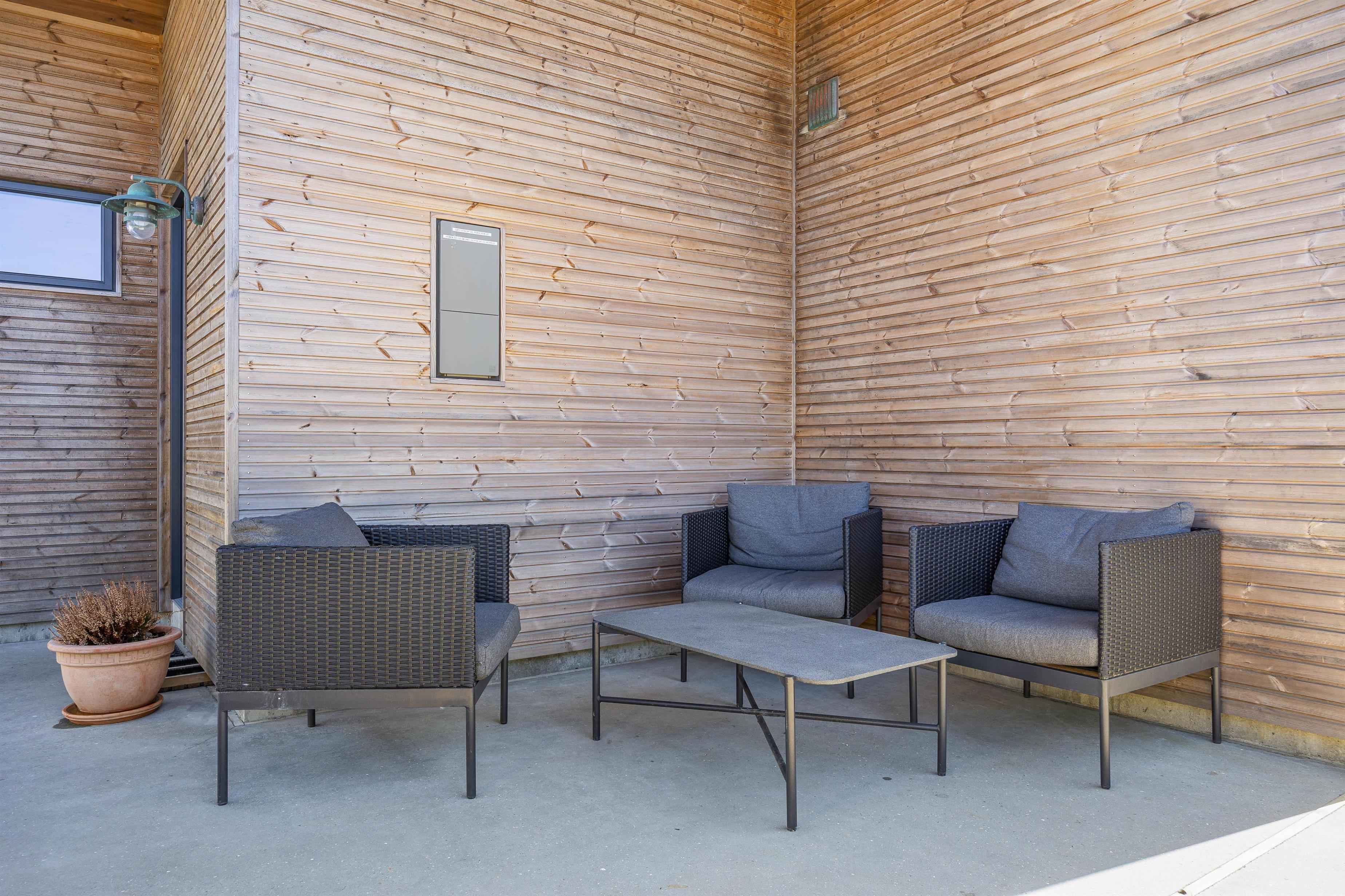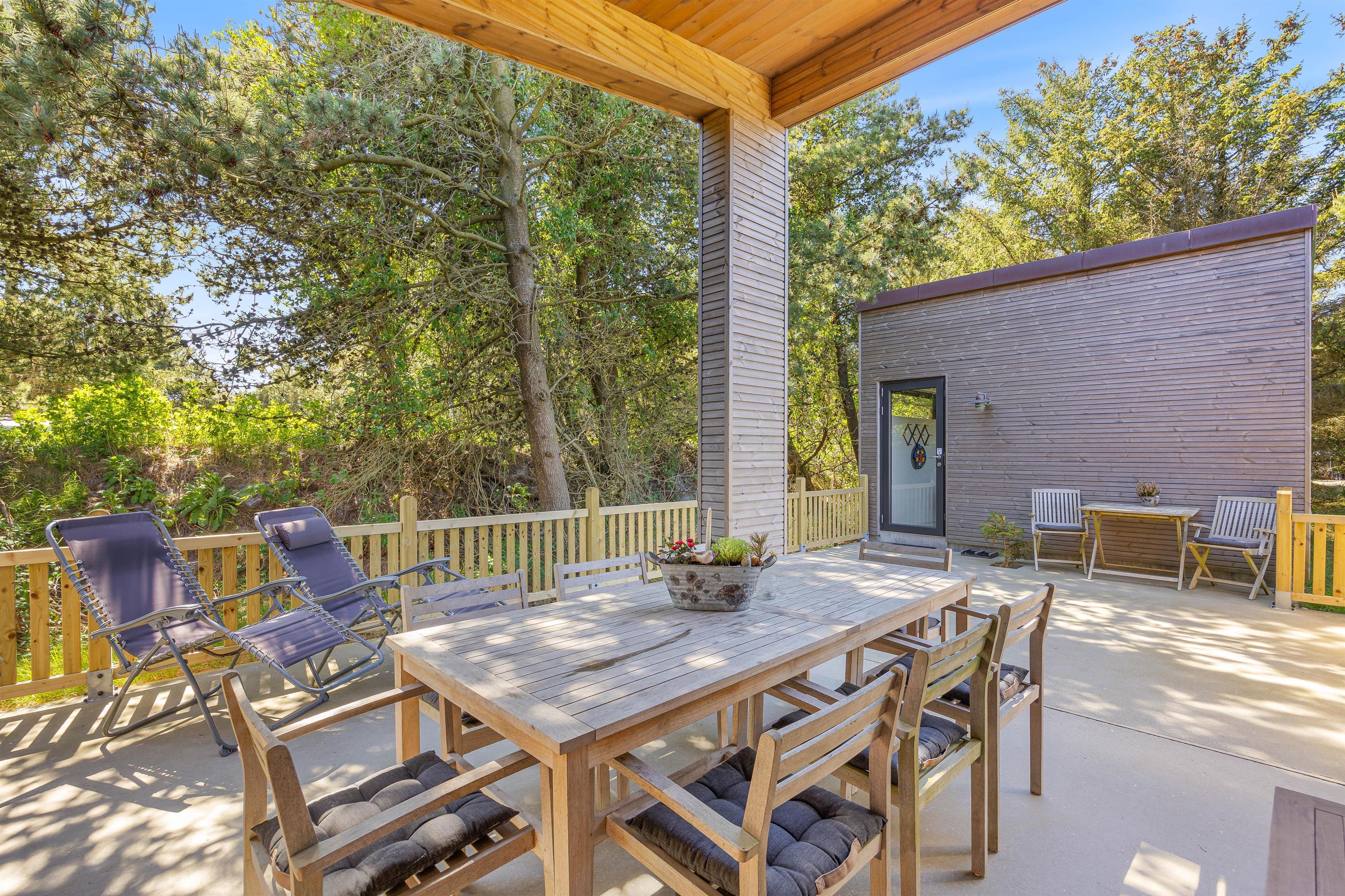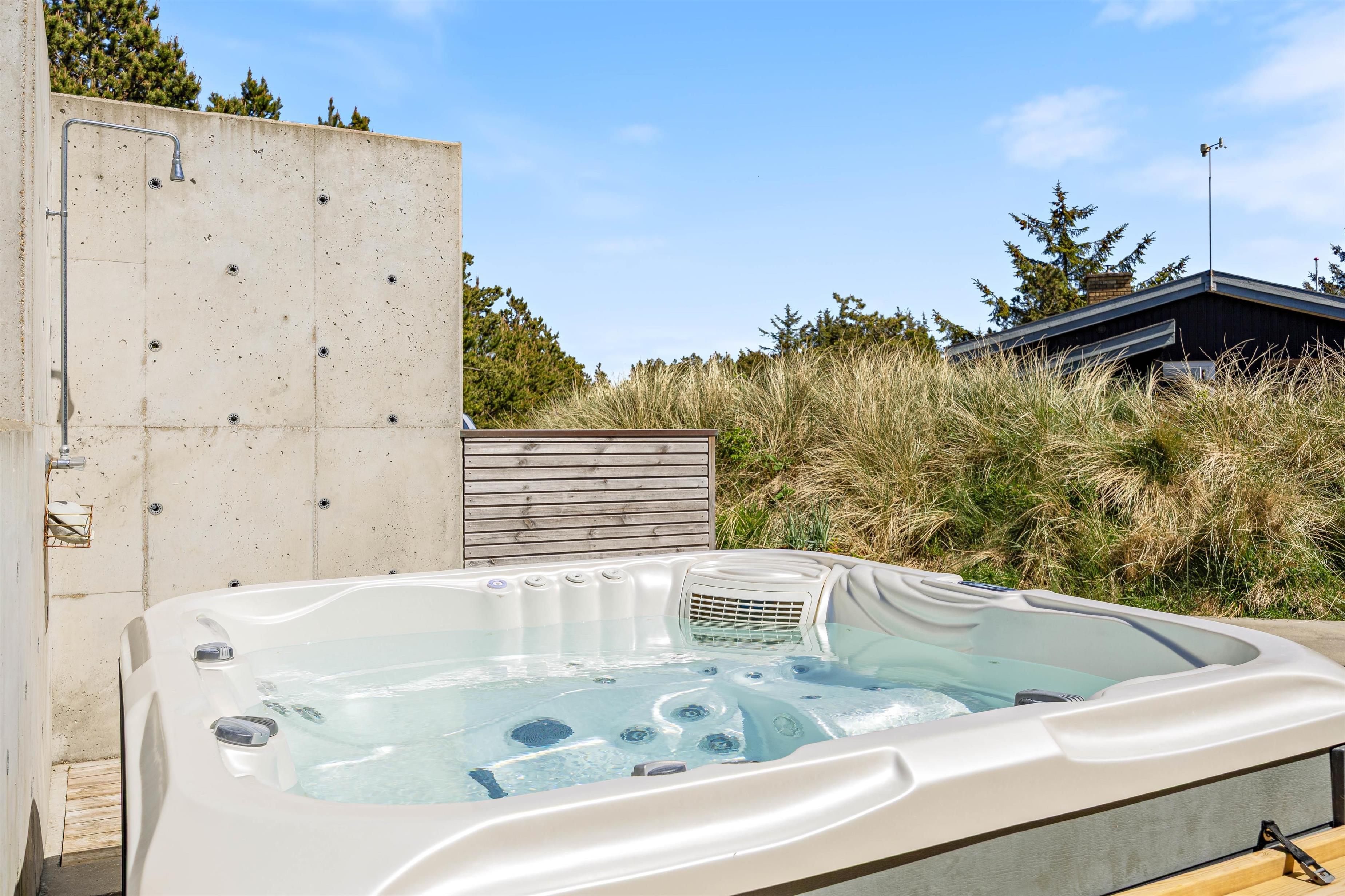 Et af sommerhusets absolutte højdepunkter er den udendørs wellnessafdeling, som byder på både sauna, spabad og udebruser. Efter en dejlig dag i naturen findes der intet bedre end afslappende stunder i familiens selskab. Udebruseren på terrassen er perfekt til at skylle sand og salt af kroppen efter en tur i Vesterhavets bølger (kan bruges fra april til november).