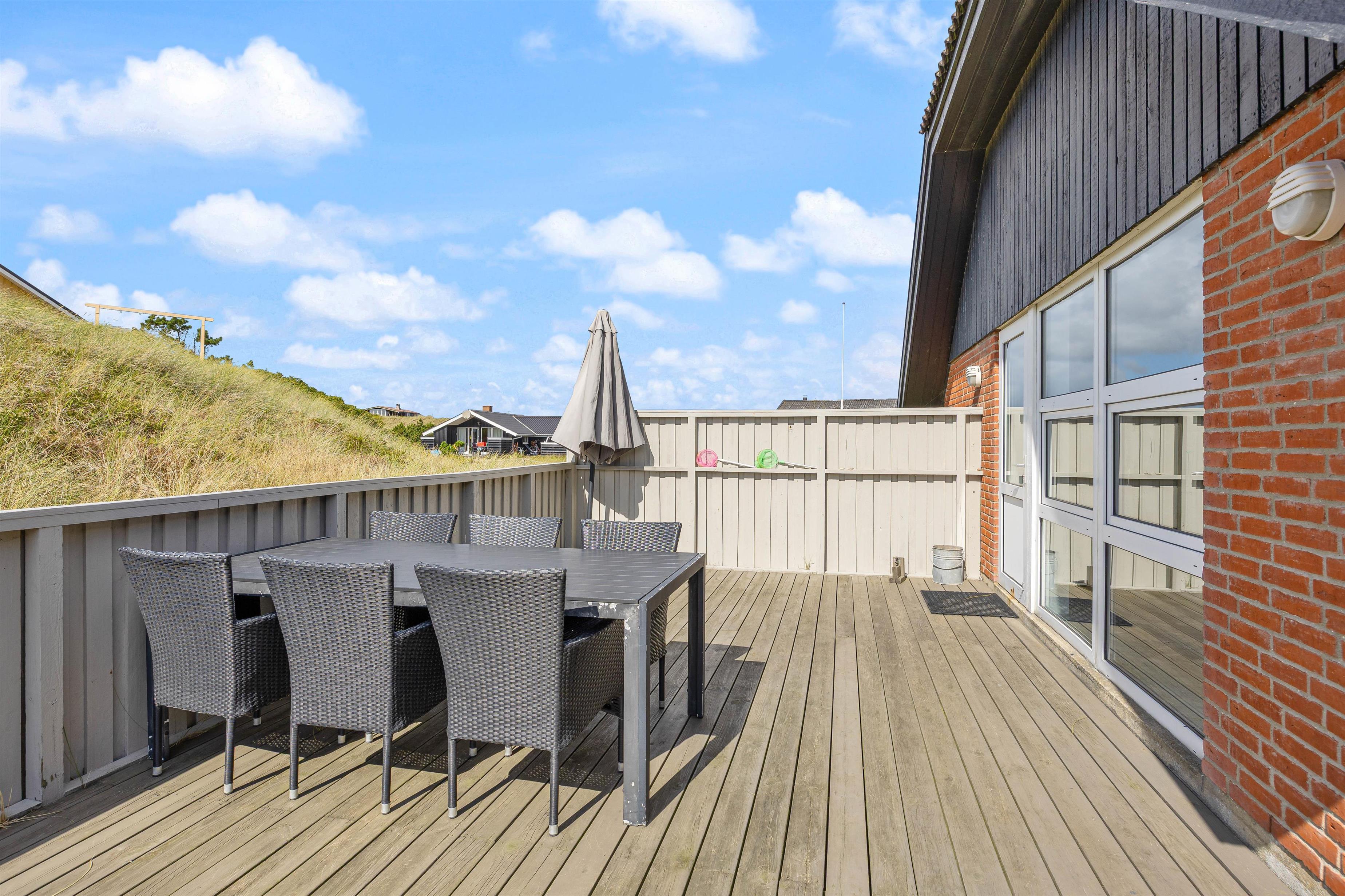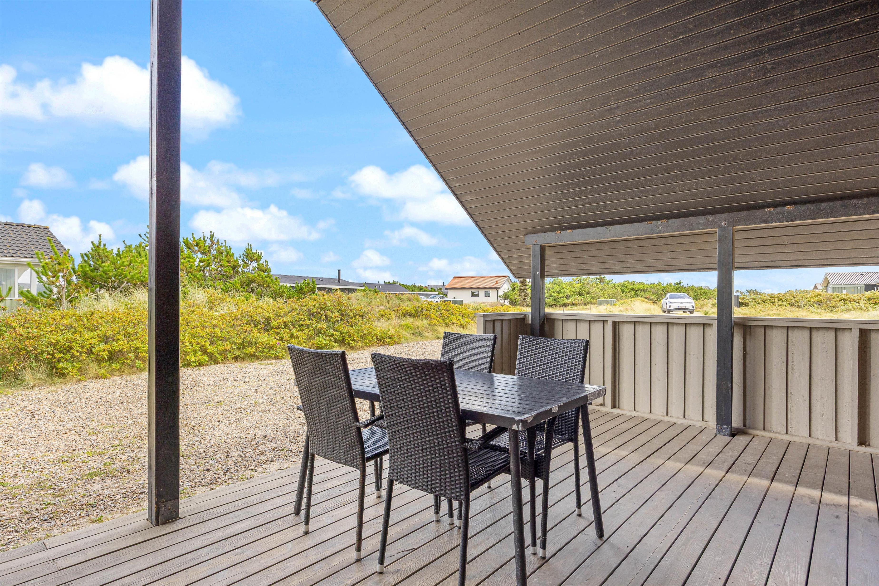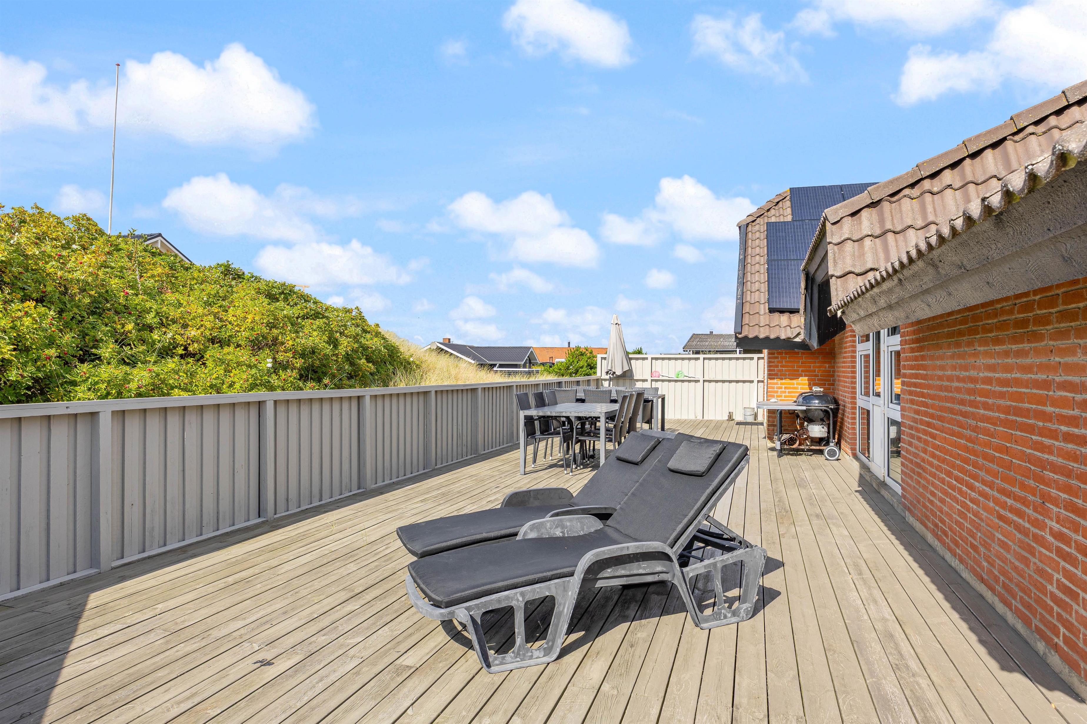 Den afskærmede terrasse omkring feriehuset indbyder til afslapning i de komfortable liggestole. Her er også en overdækket del, hvor I kan nyde måltiderne udendørs. Tænd op i grillen, og afslut dagen med en fælles grillaften. Her er terrasse til flere sider, så I kan altid finde en krog med læ.
