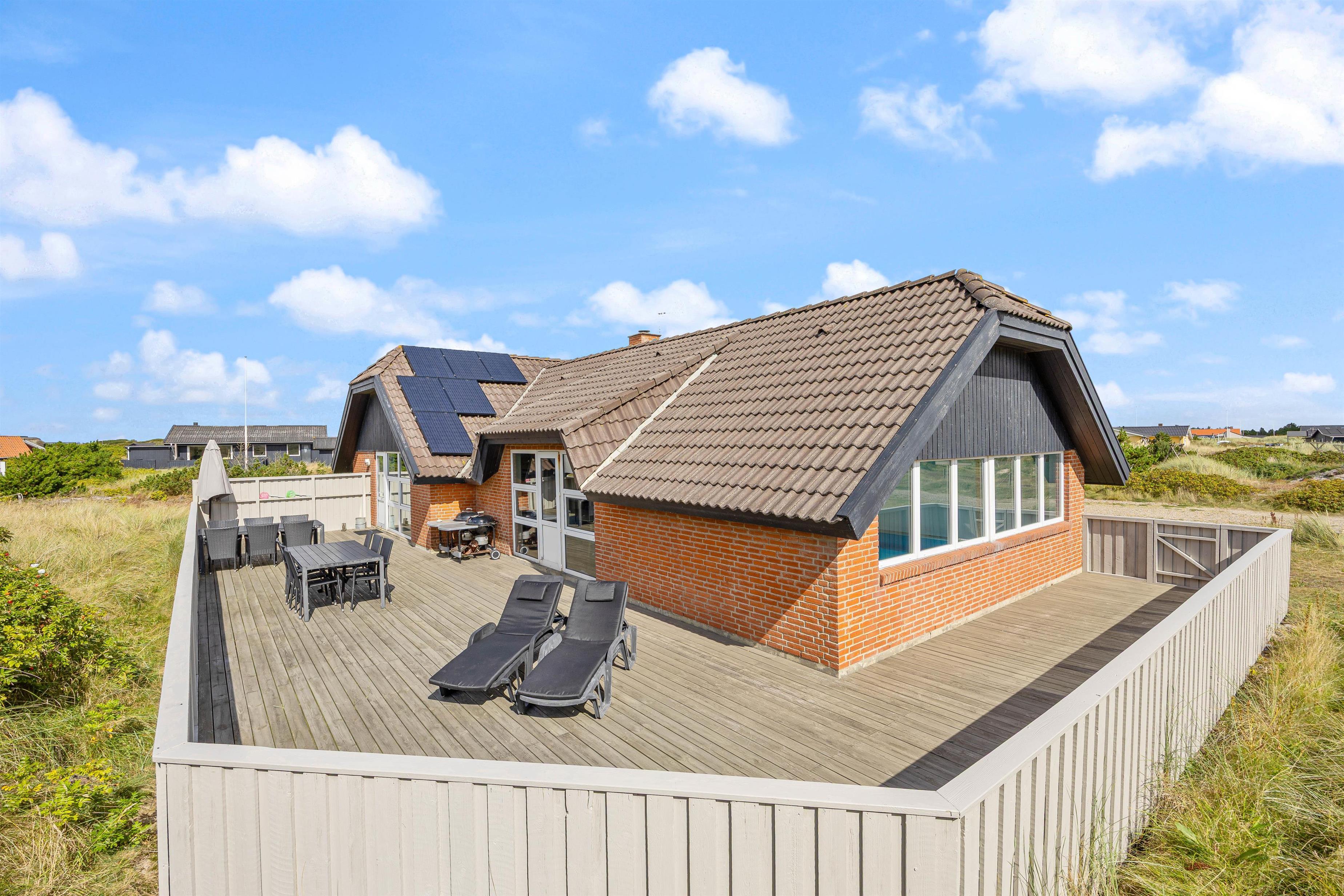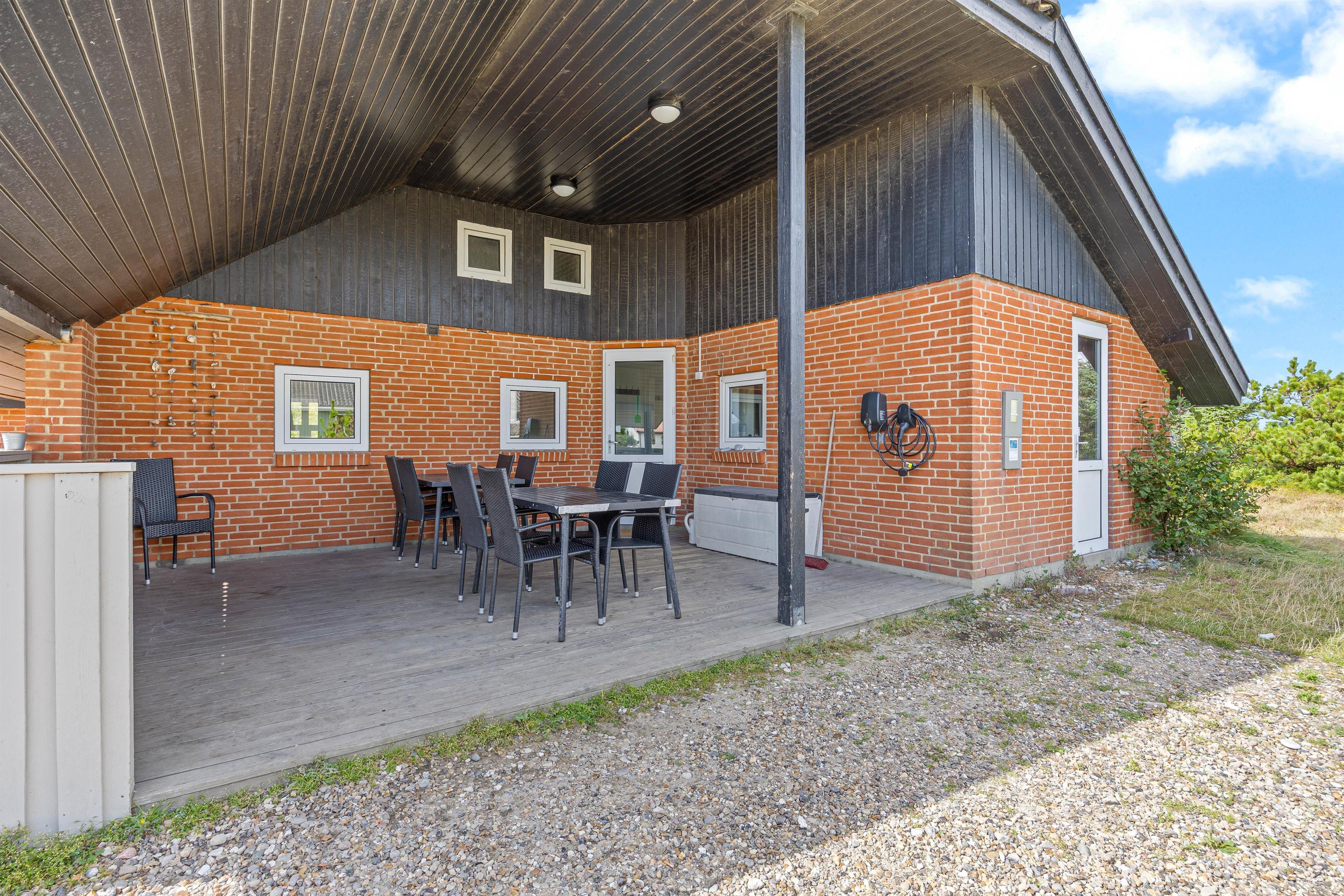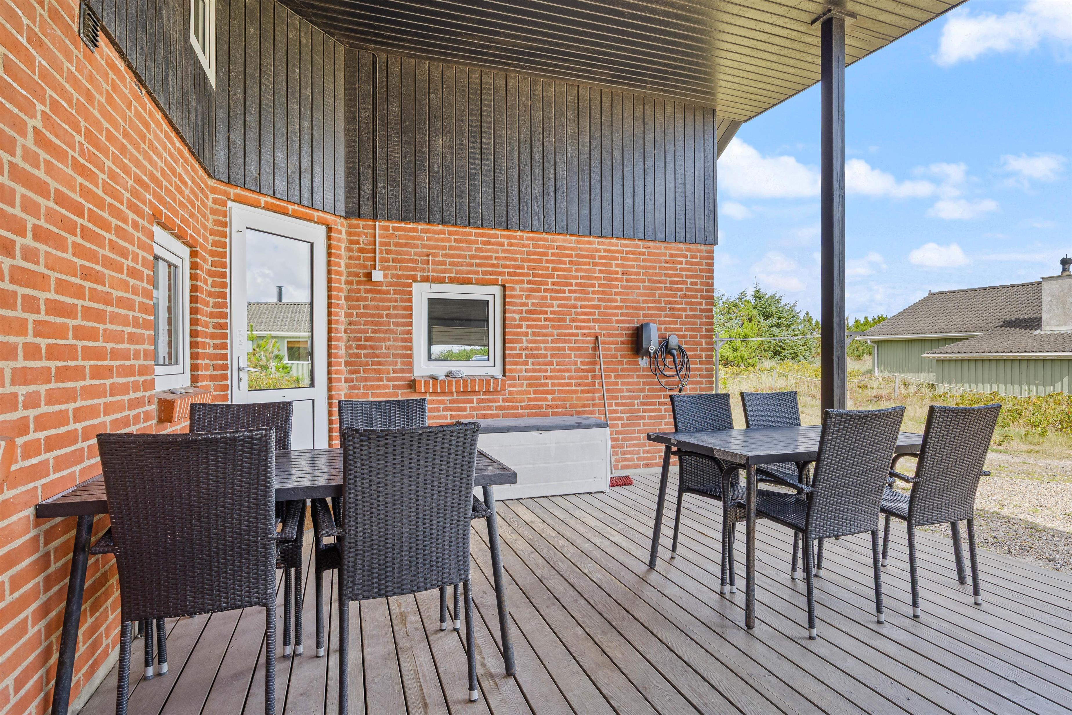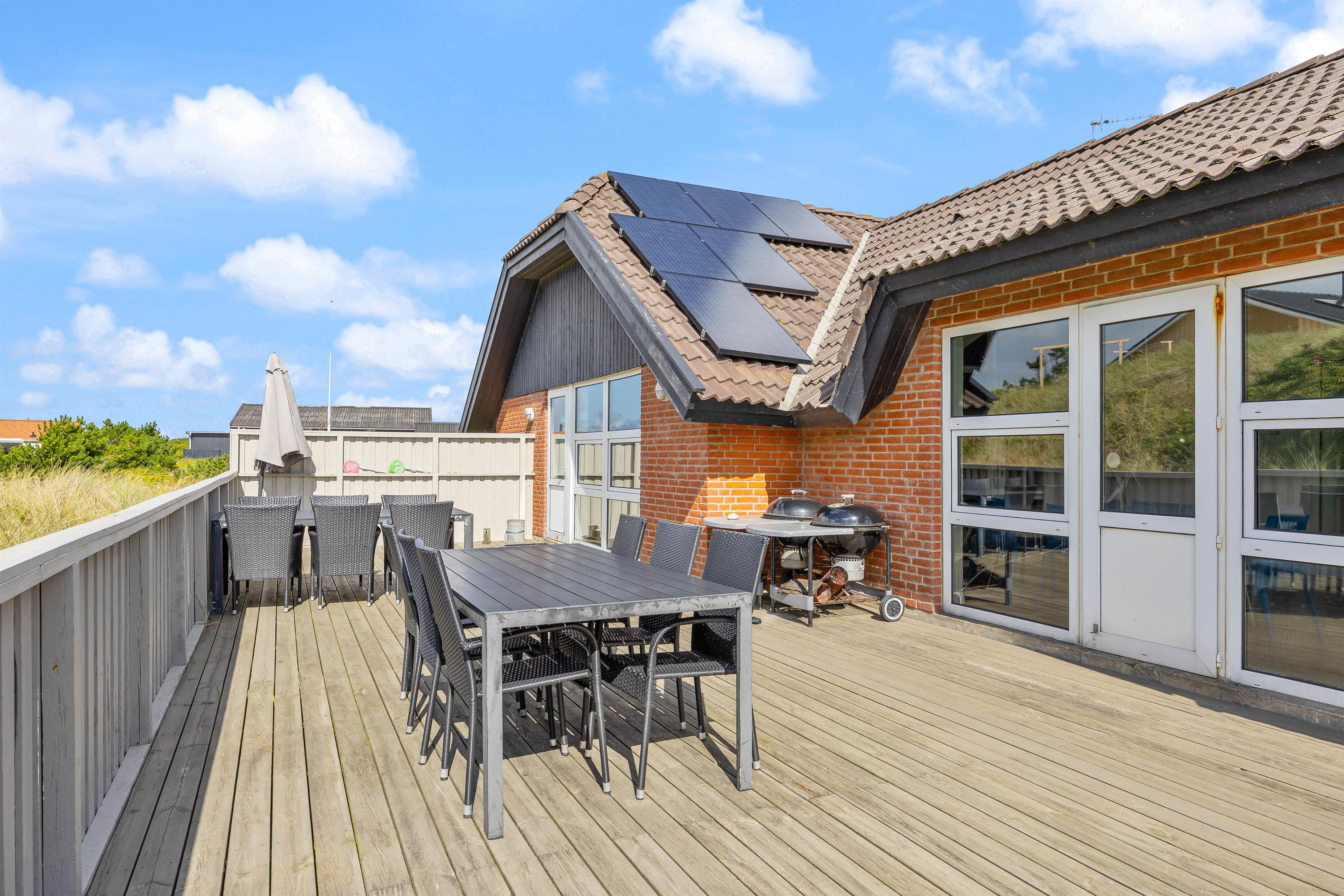 Den afskærmede terrasse omkring feriehuset indbyder til afslapning i de komfortable liggestole. Her er også en overdækket del, hvor I kan nyde måltiderne udendørs. Tænd op i grillen, og afslut dagen med en fælles grillaften. Her er terrasse til flere sider, så I kan altid finde en krog med læ.