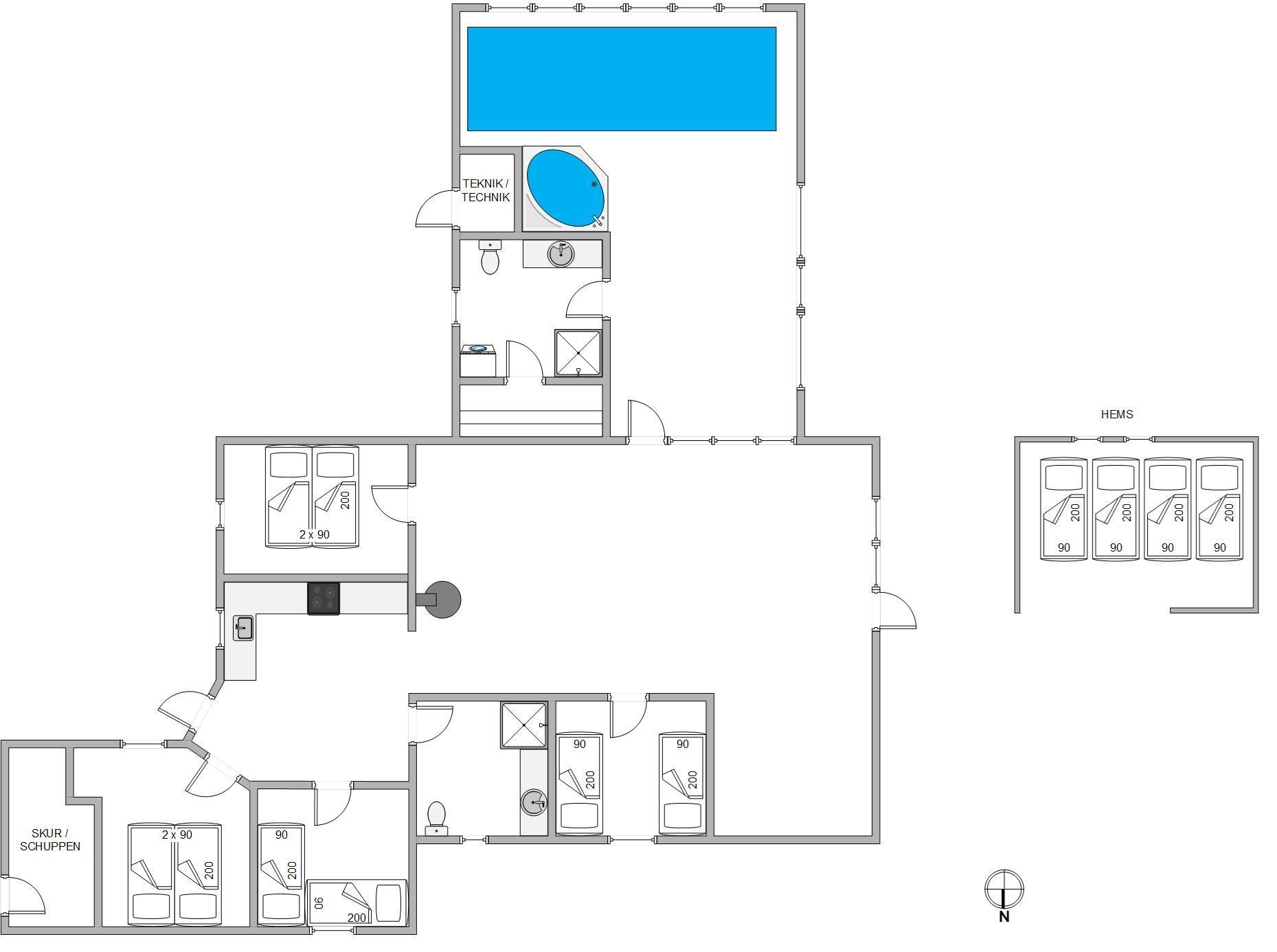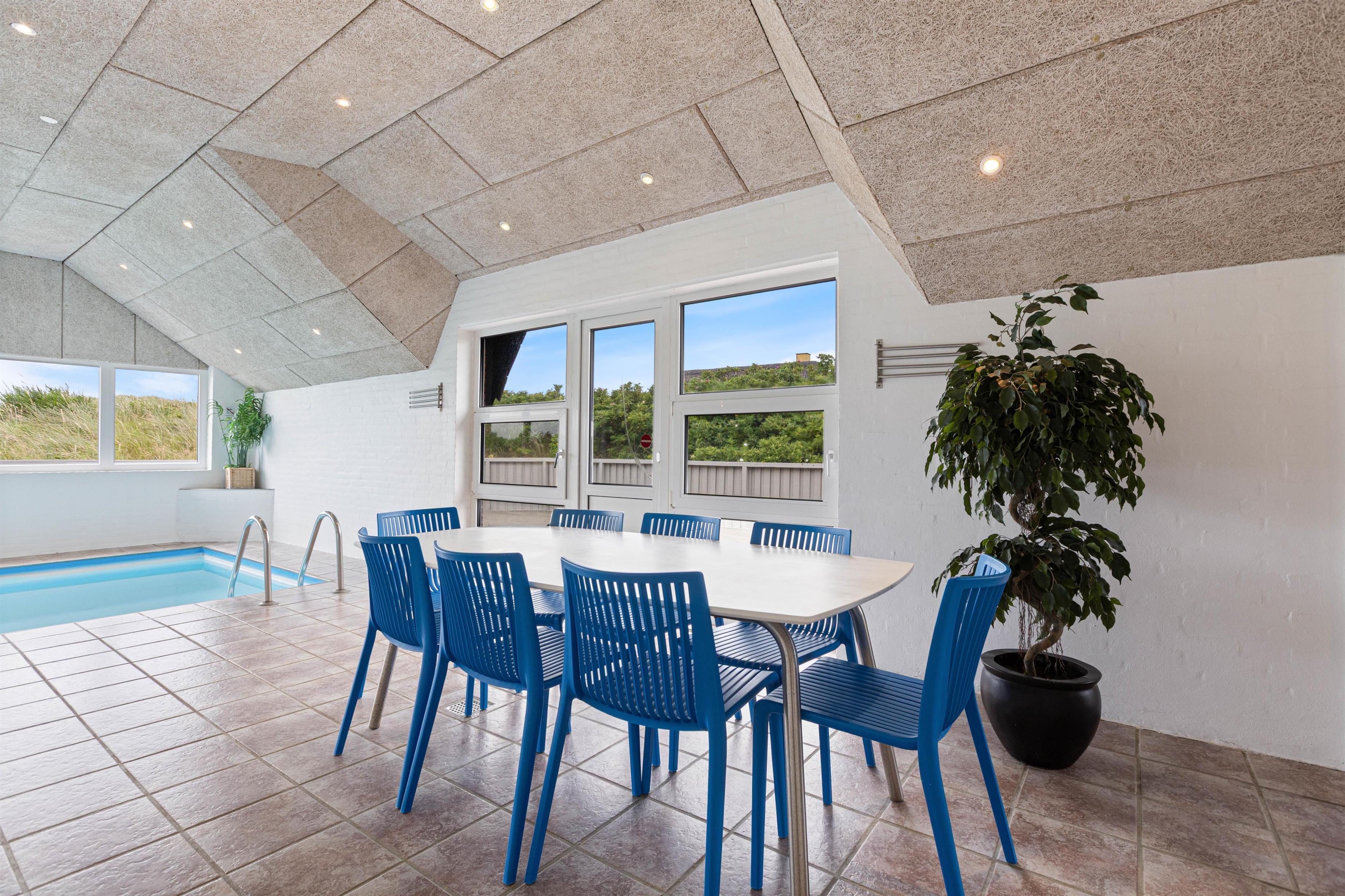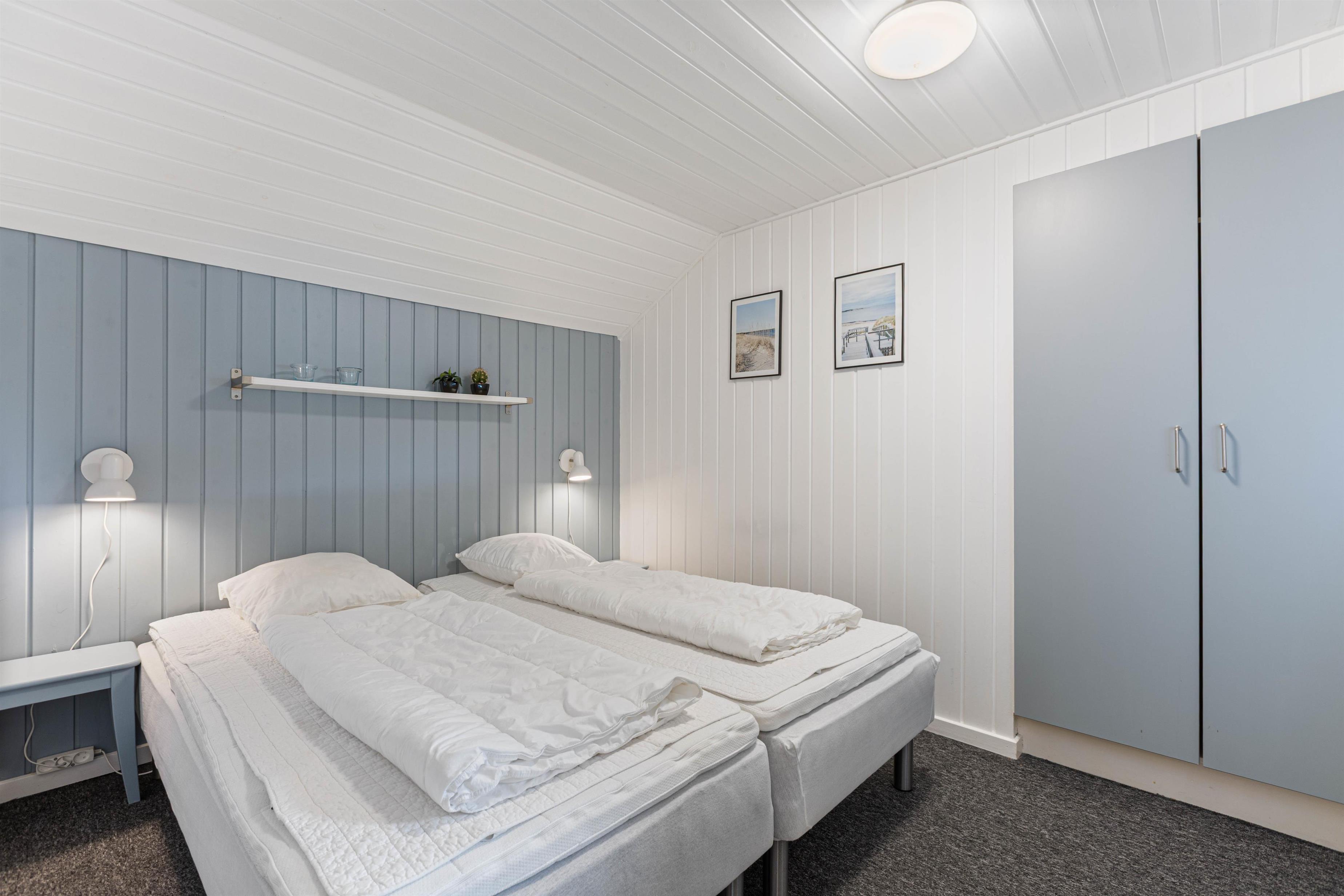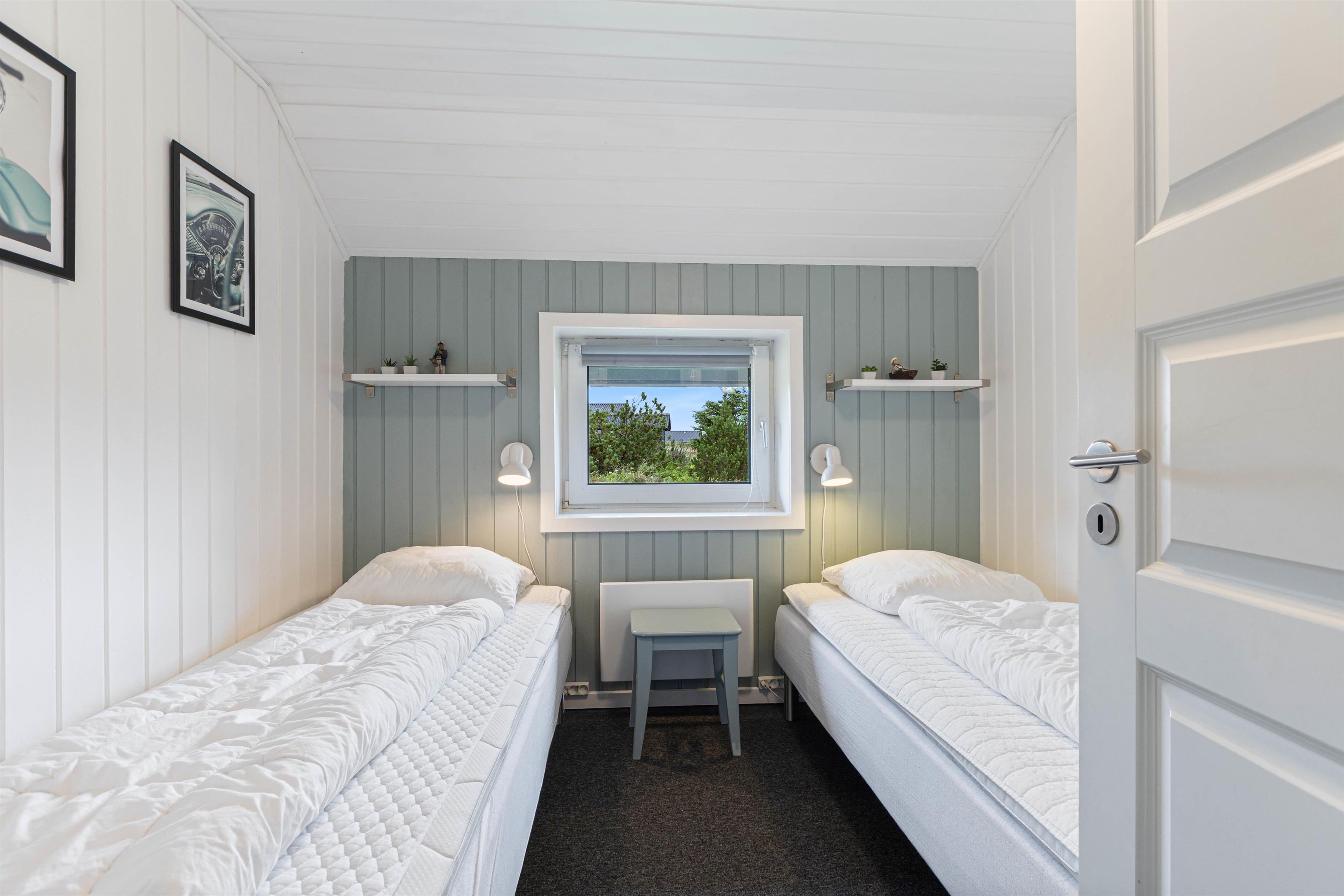Det skønne poolområde gør jer uafhængige af vejret. Børnene kan plaske rundt i swimmingpoolen, imens I nyder boblerne i spaen, og måske derefter bliver rigtig godt gennemsvedte i saunaen. I de 4 soveværelser i stueetagen kan I sove ud i den friske Vesterhavsluft. De 2 har komfortable dobbeltsenge, de 2 andre har hver 2 enkeltsenge. På hemsen er der ”sovesal” med 4 enkeltsenge, det vil børnene elske.