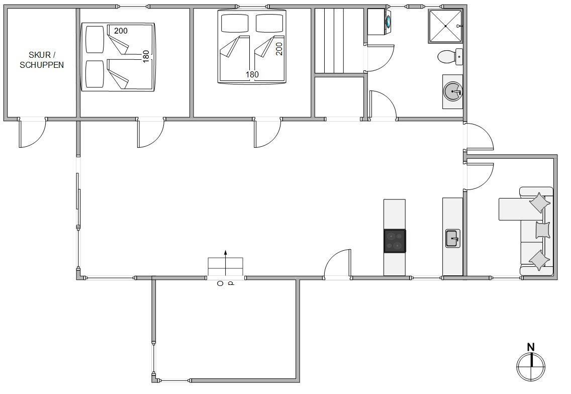 Centrum i sommerhuset er opholdsrummet med gulvvarme, hvor I både finder køkkenafdelingen med bl.a. opvaskemaskine, spiseafdelingen, samt nedgang til TV-stuen med sofahjørne og plads til familiehygge med kortspil eller andet.