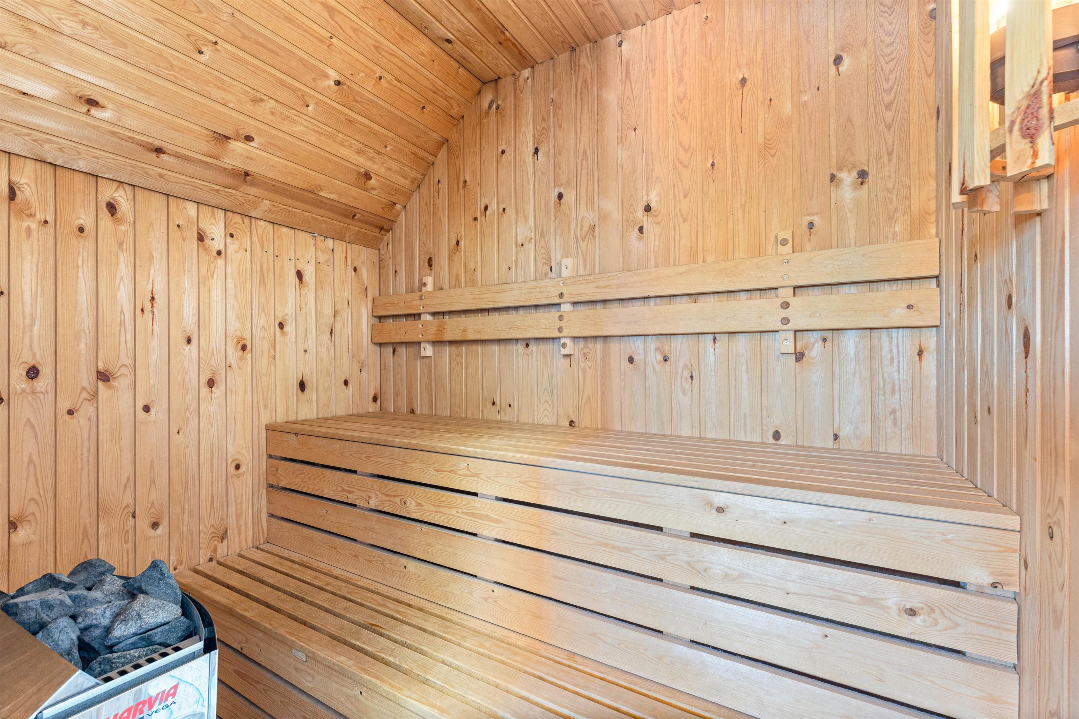 Alle opholdsrum er beklædt med hvidmalede paneler på vægge og loft samt synlige bjælker. Gulvene er belagt med lyst trælaminat, dog er badeværelset belagt med klinker og fliser. I forbindelse med badeværelset er en rummelig sauna samt vaskemaskine og tørretumbler. Til opvarmning er blandt andet en energibesparende varmepumpe.