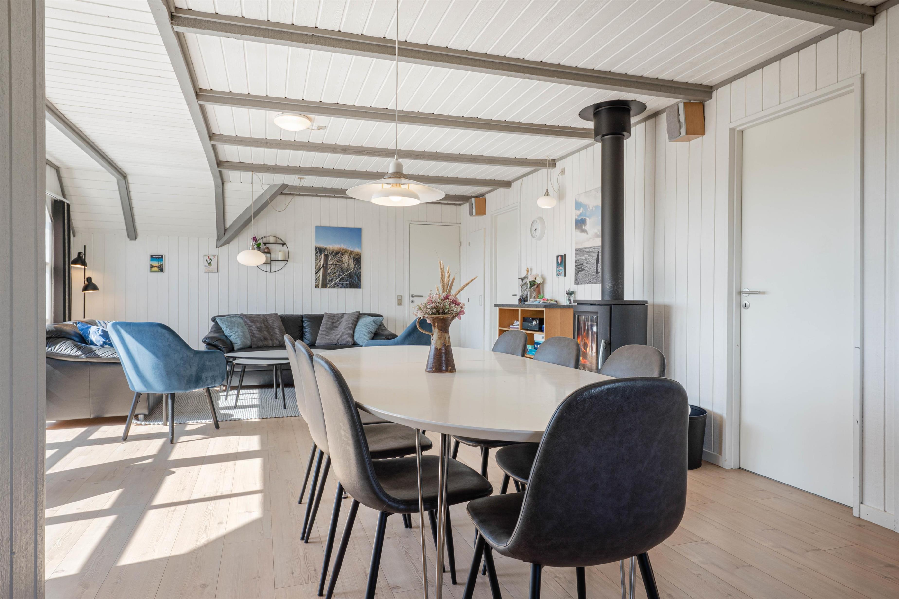 Dette hyggelige feriehus indeholder et funktionelt køkken, åbent til spise- og opholdsafdeling med TV, Chromecast, dvd, radio, trådløst internet og ikke mindst en god brændeovn. Køkkenet indeholder alt, hvad du skal bruge for at tilberede lækre måltider – og især lystfiskeren vil blive glad for den separate fryser på 40 liter. I opholdsstuen kan I samles omkring spisebordet, eller i sofagruppen ved brændeovnen.