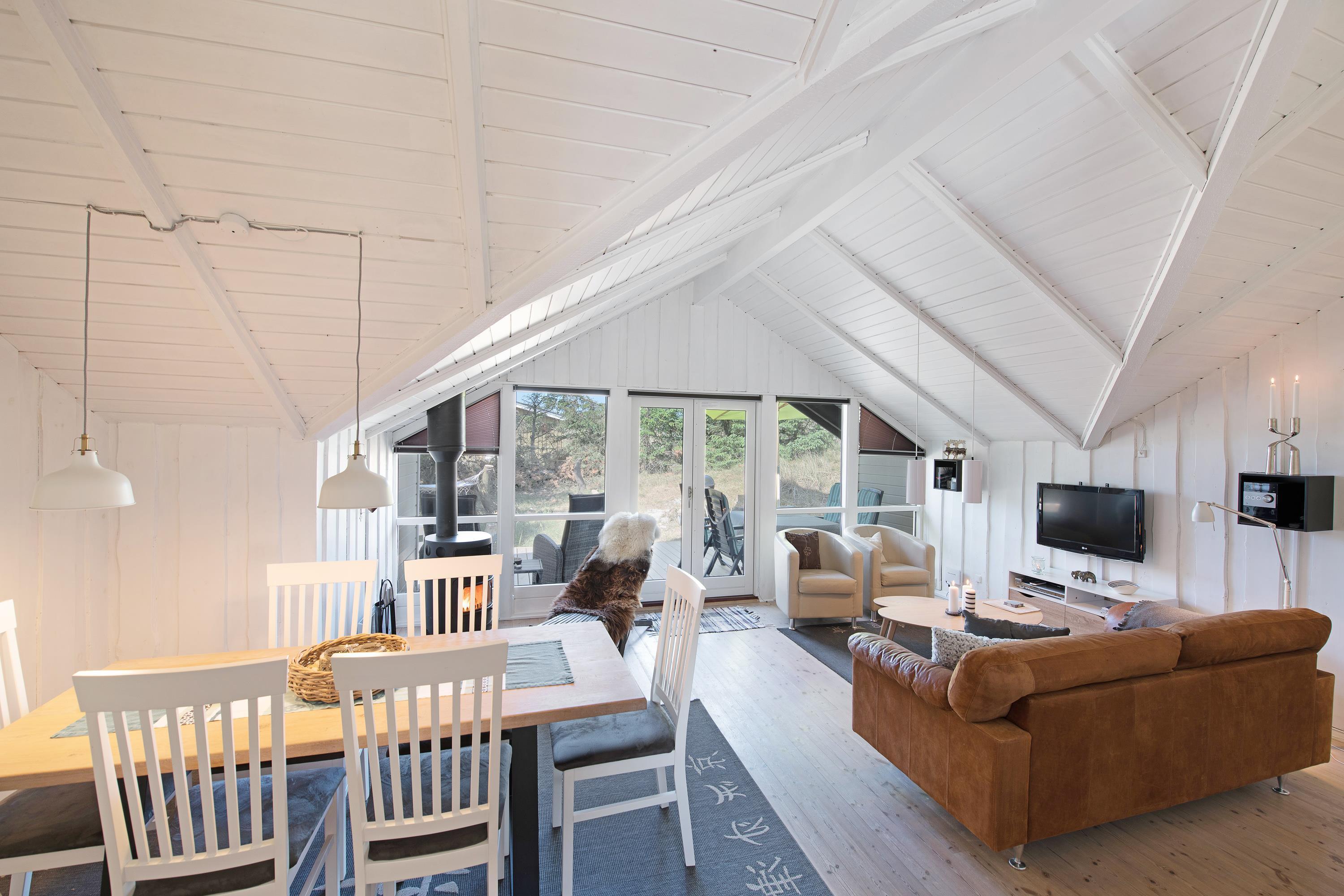 Sommerhuset er lyst og hyggeligt indrettet med stue, køkken og spisestue i åben forbindelse, som virkelig indbyder til mange hyggestunder f.eks. foran den dejlige brændeovn. Trænger du til at lade batterierne op, kan du nyde et par timer i spaen eller saunaen. Toilettet samt endnu en håndvask findes på 'gæstetoilettet' over for.