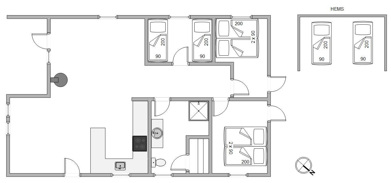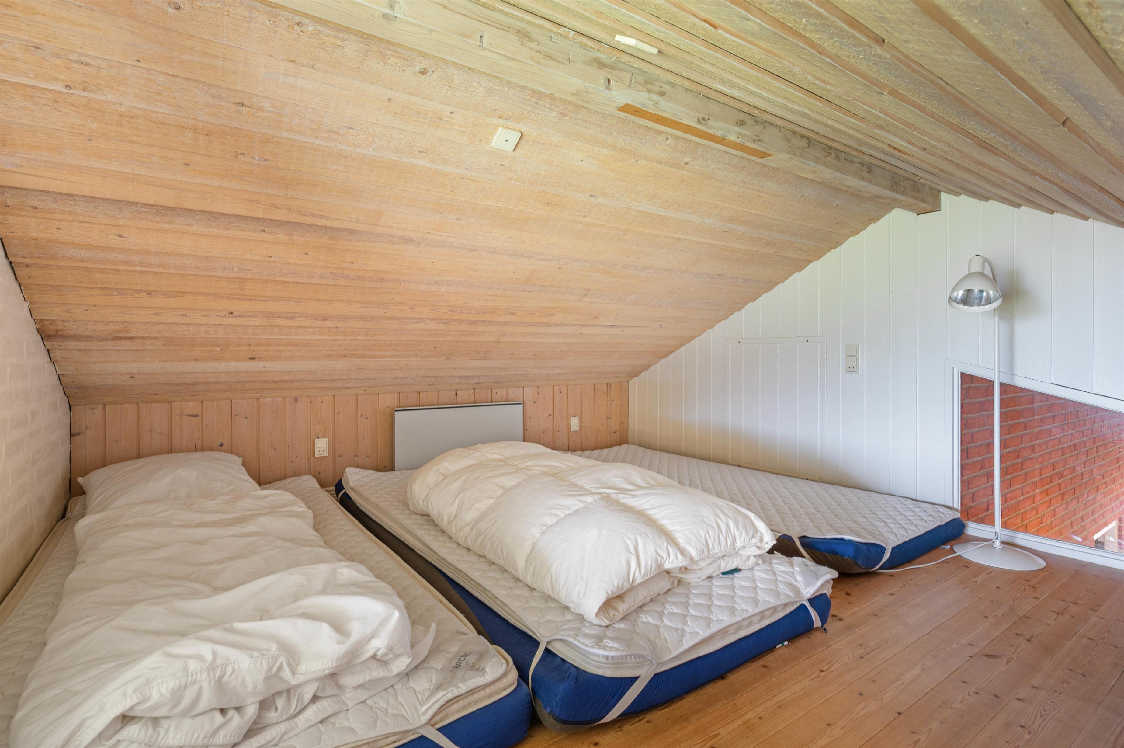 Sommerhuset har 3 gode soveværelser, hvoraf det ene er indrettet med en dobbeltseng. De sidste værelser er indrettet med komfortable enkeltsenge, og fra det ene har I adgang til hemsen, hvor I finder de 2 sidste sovepladser.