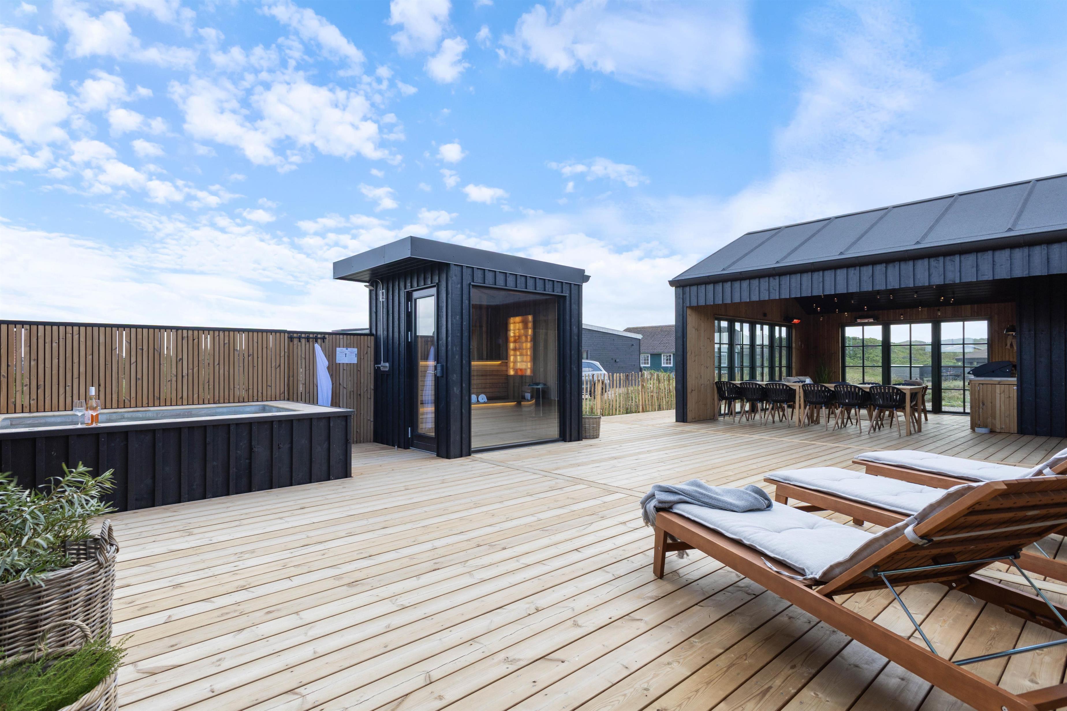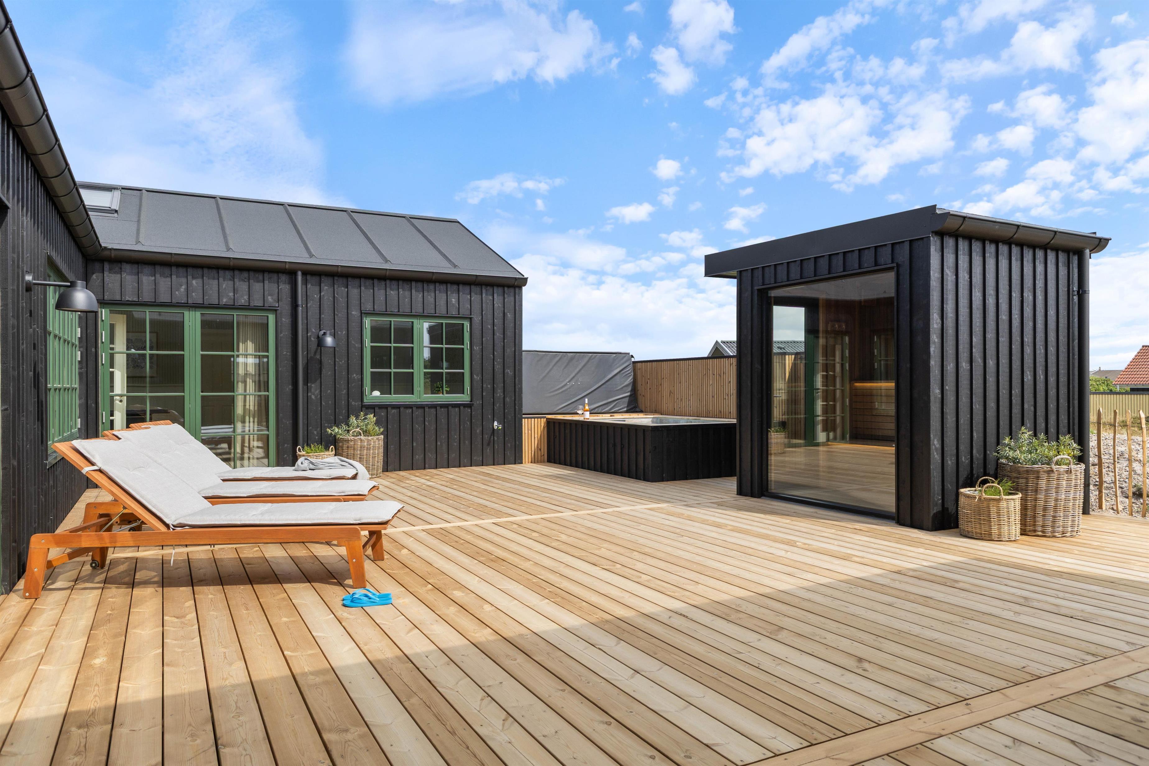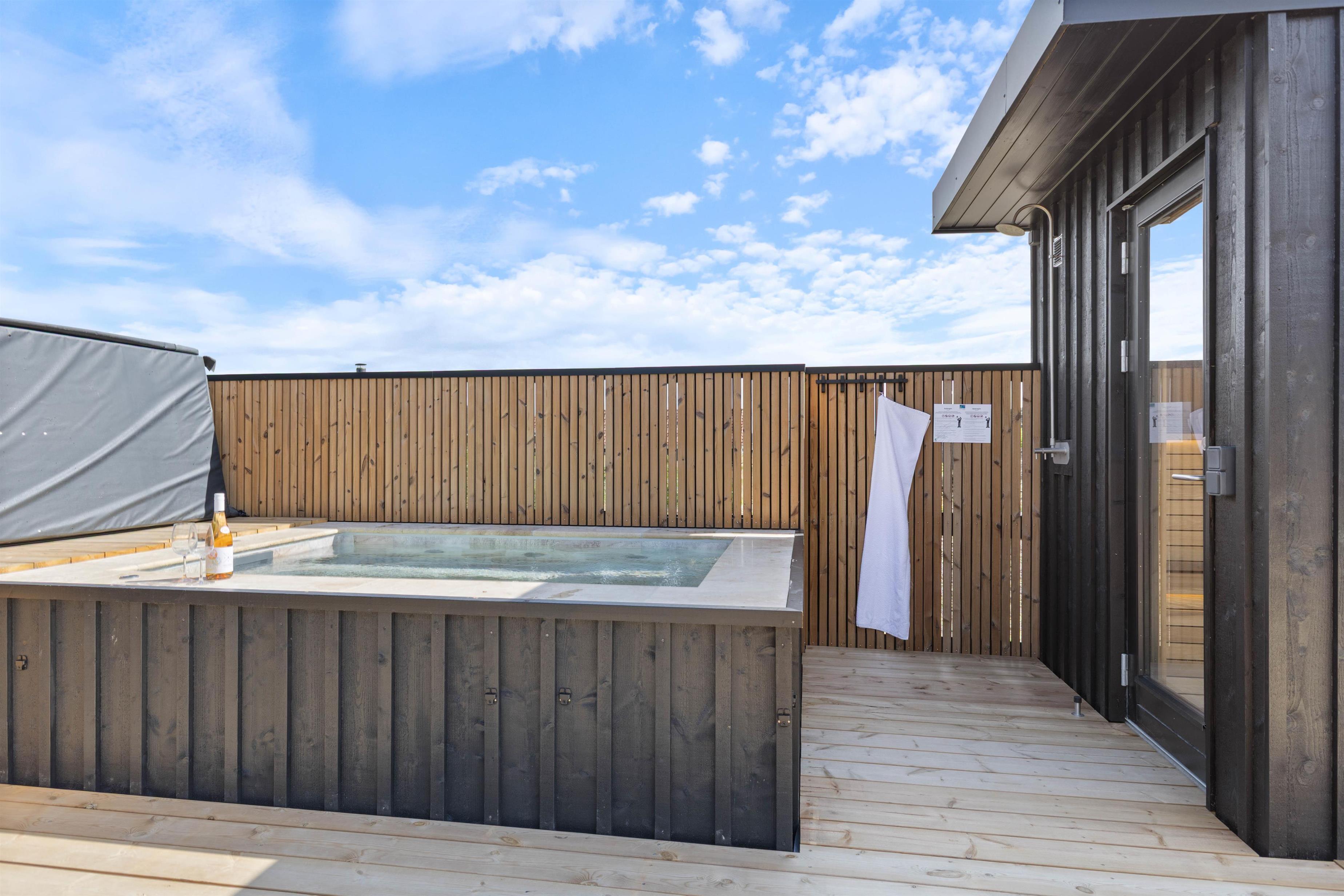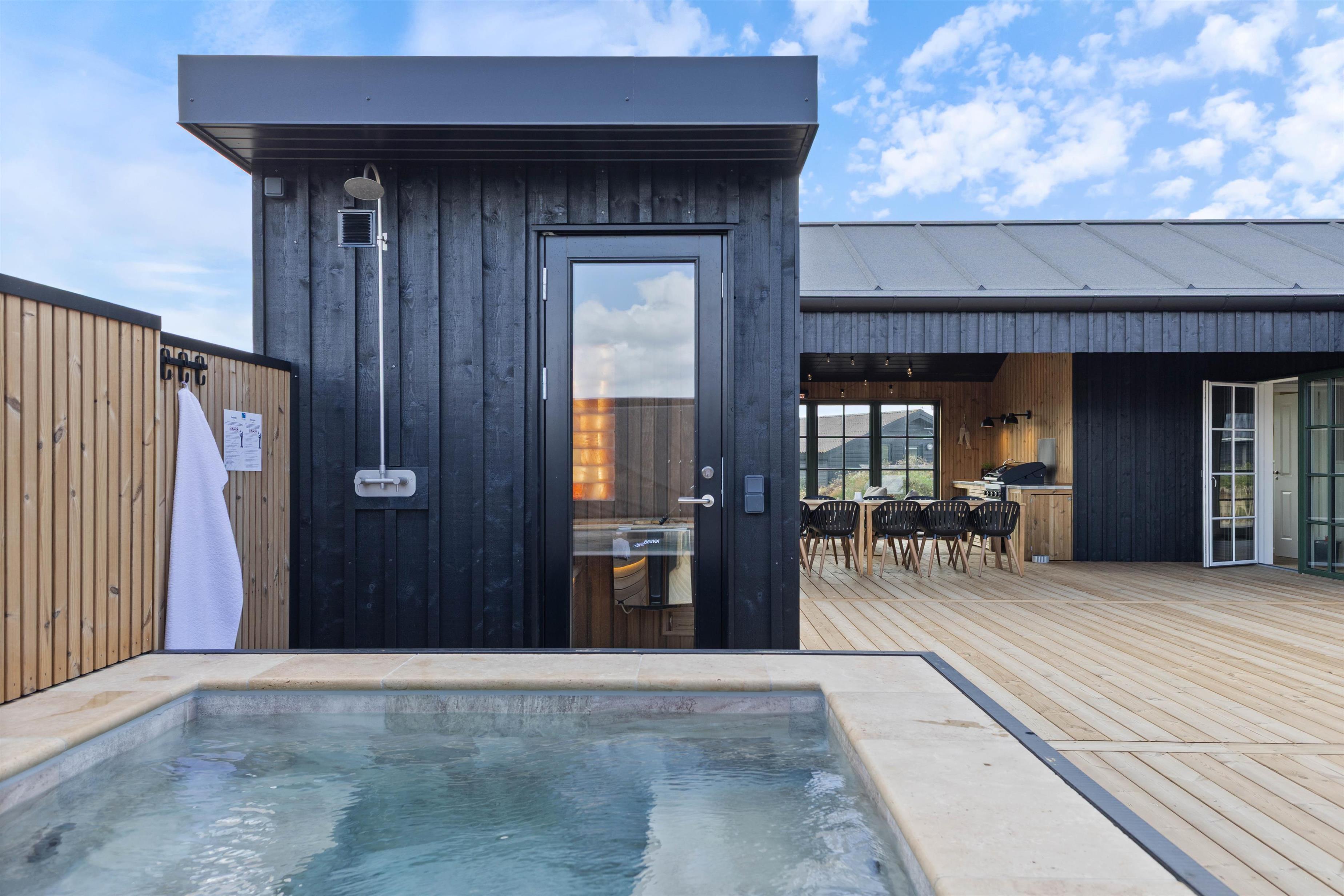 Afslapning er også på programmet - en skøn udespa på den lukkede terrasse byder på wellness i det fri. Spaen opvarmes af varmepumpe, og er derfor billig i strøm. Her finder I også både udesauna og udebruser, som kan benyttes året rundt. Om I benytter faciliteterne i løbet af dagen, eller venter til et spabad under stjernehimlen er helt op til jer selv – der er noget for enhver smag.