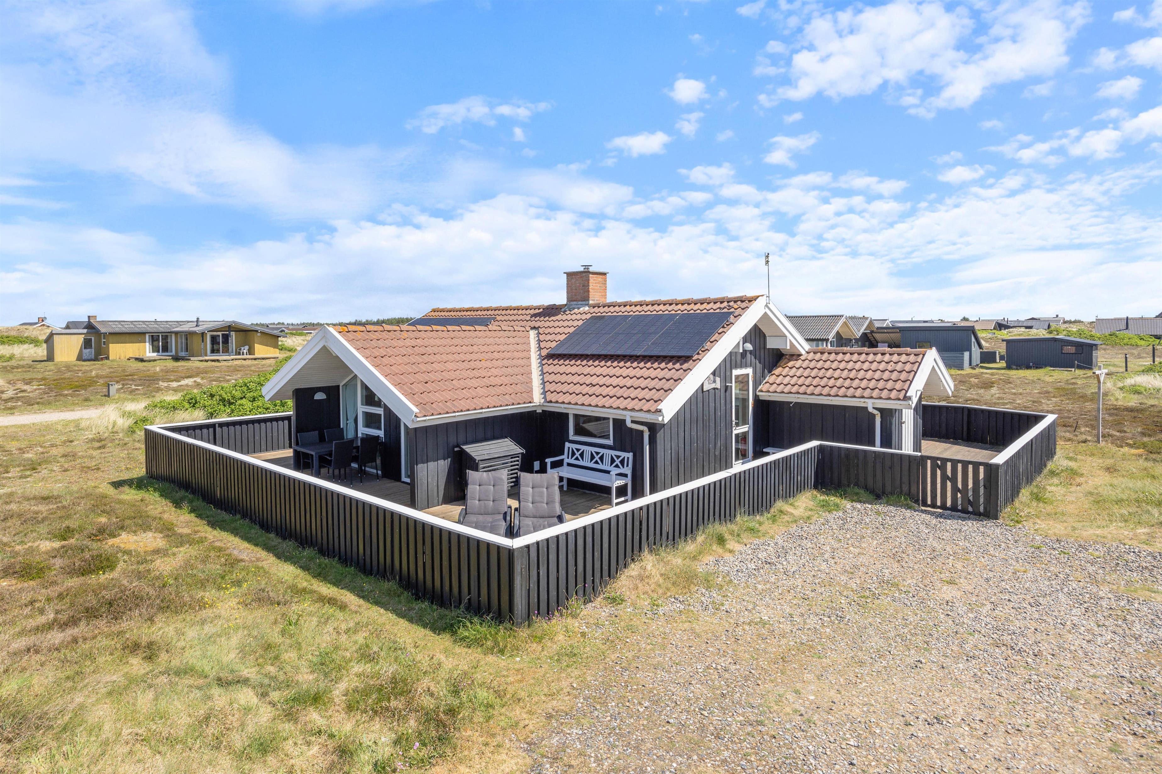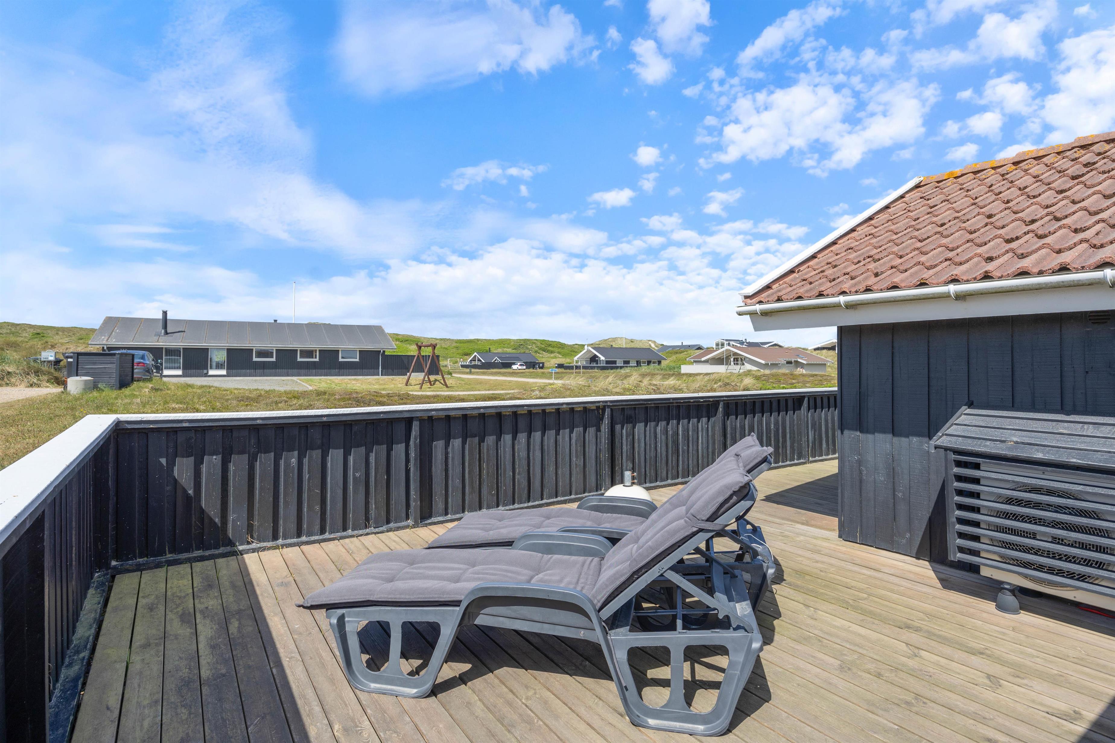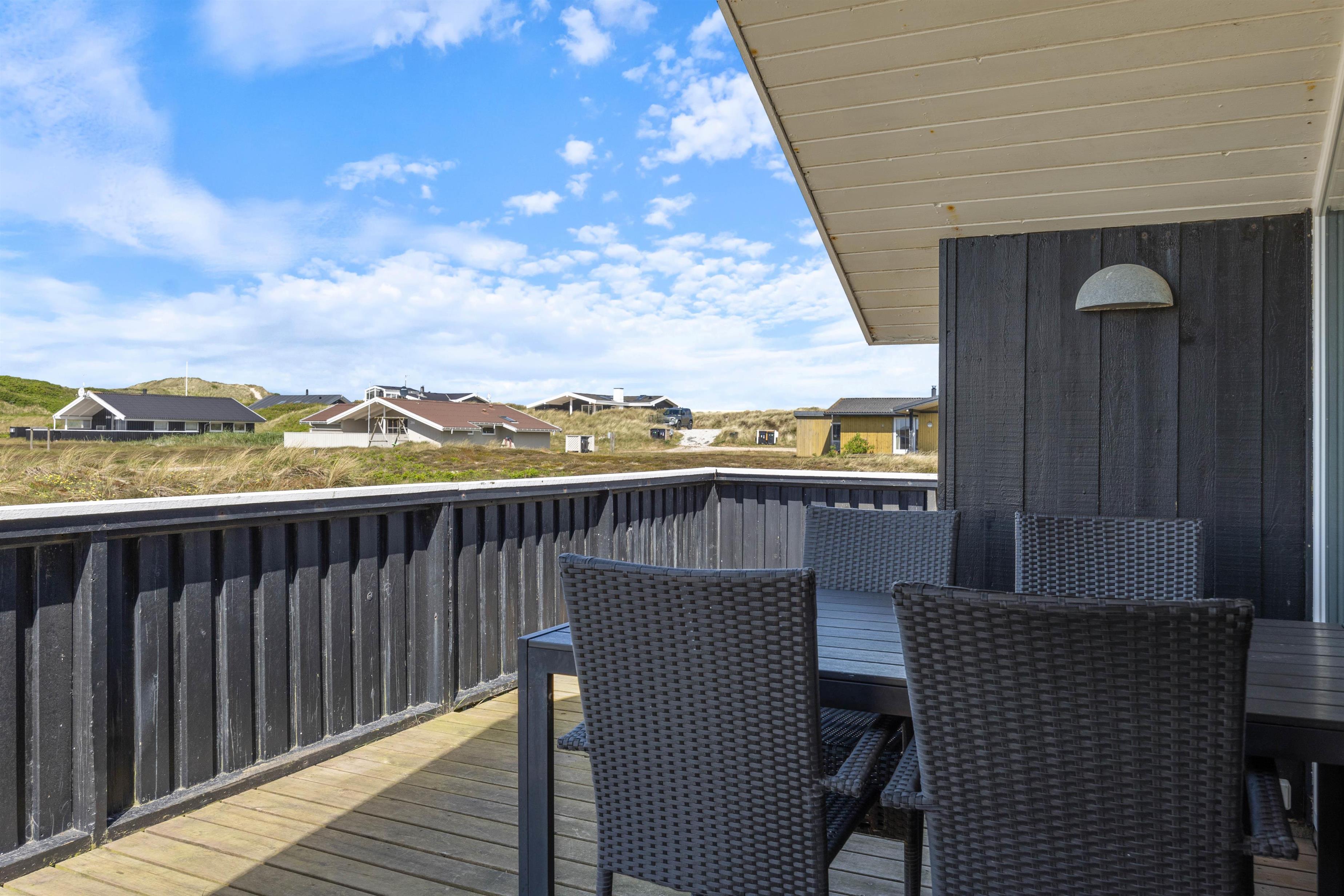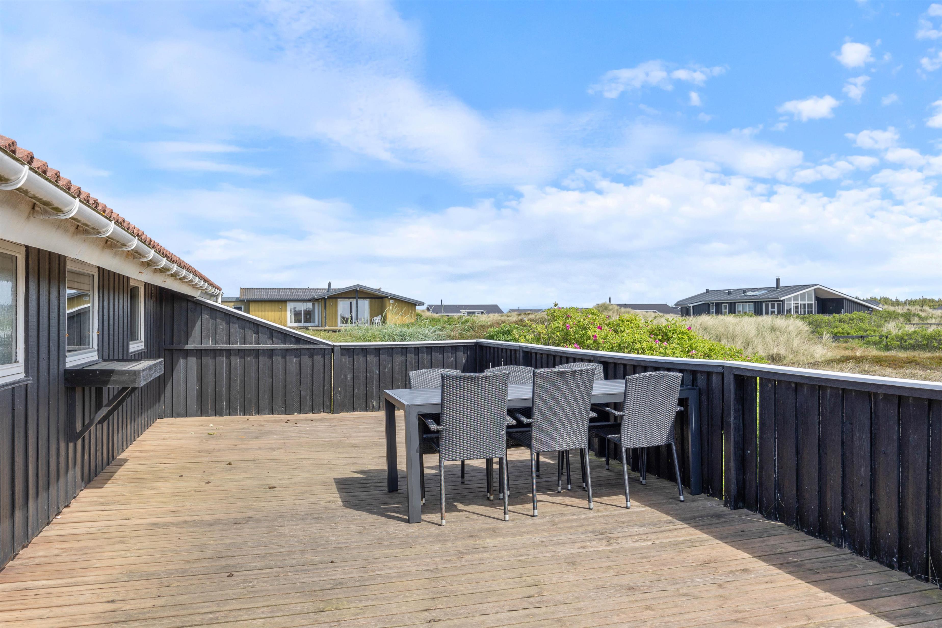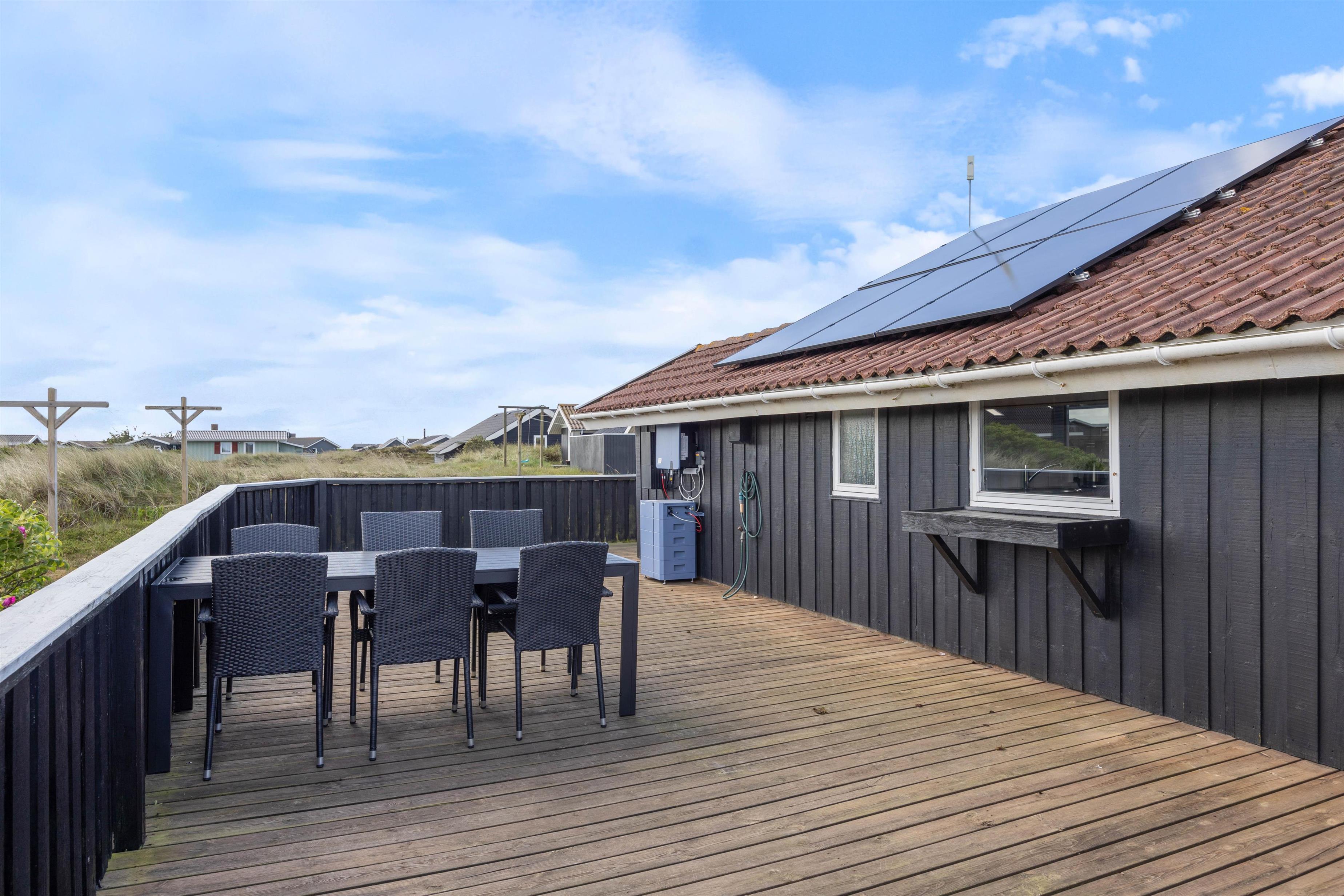 Rundt om feriehuset her på Arvidvej 348 er der en stor, lukket og dejlig træterrasse. Her kan man roligt lade børn og hunde lege frit. Den ultimative nydelse må være en veltilberedt grillmiddag på den vestvendte terrasse, hvor man kan nyde solnedgangen over klitterne og lytte til Vesterhavets afslappende brusen.