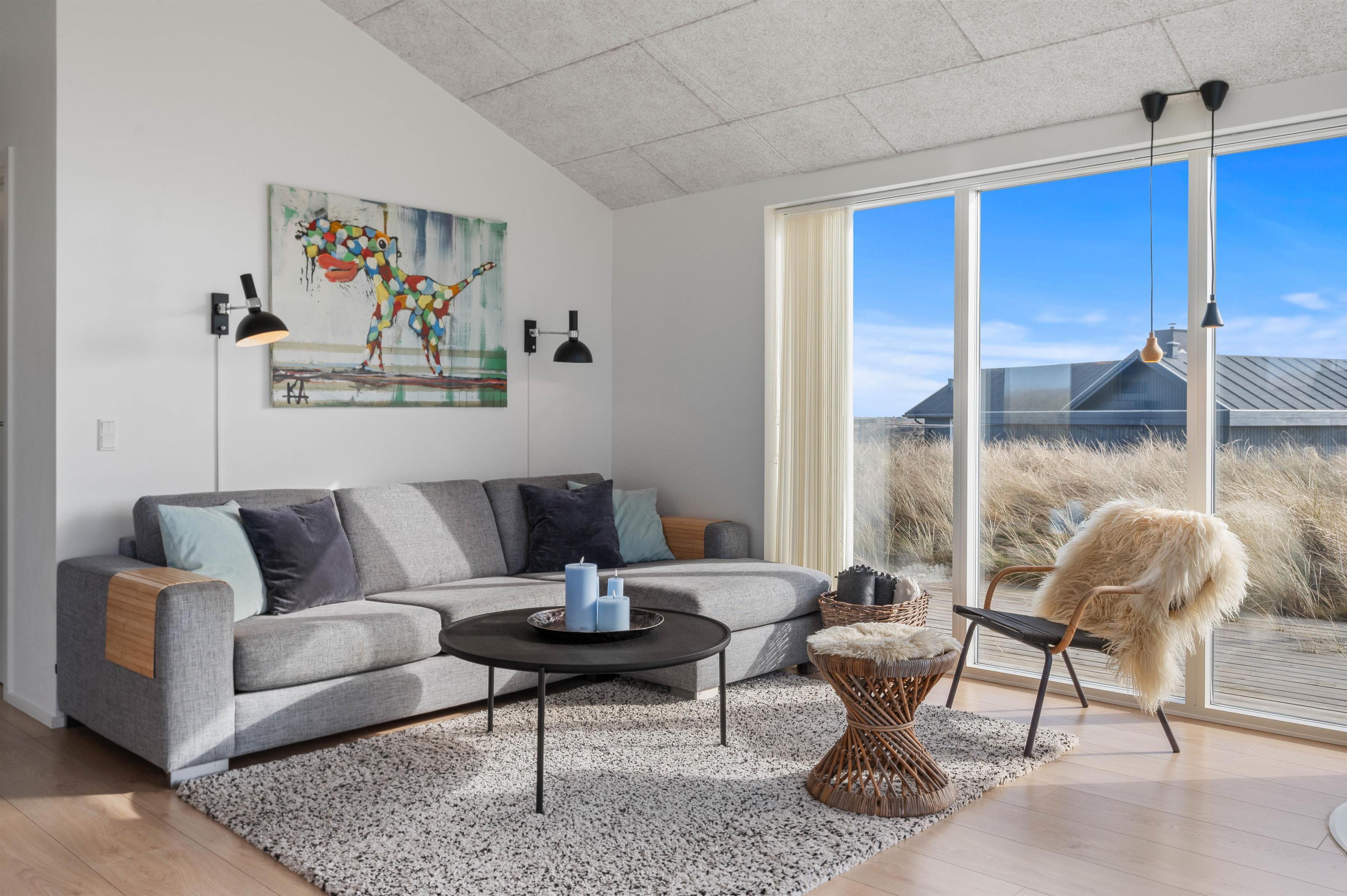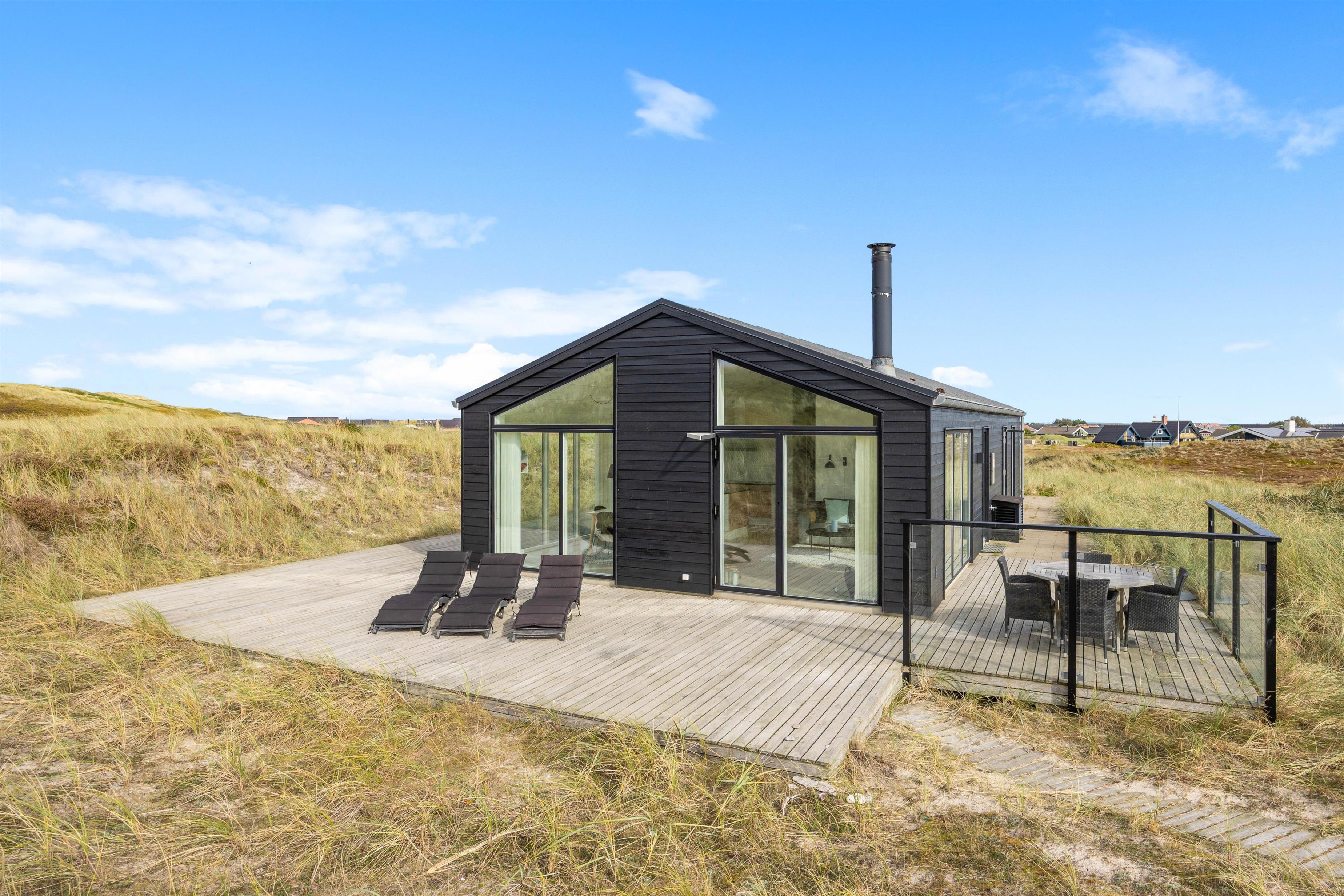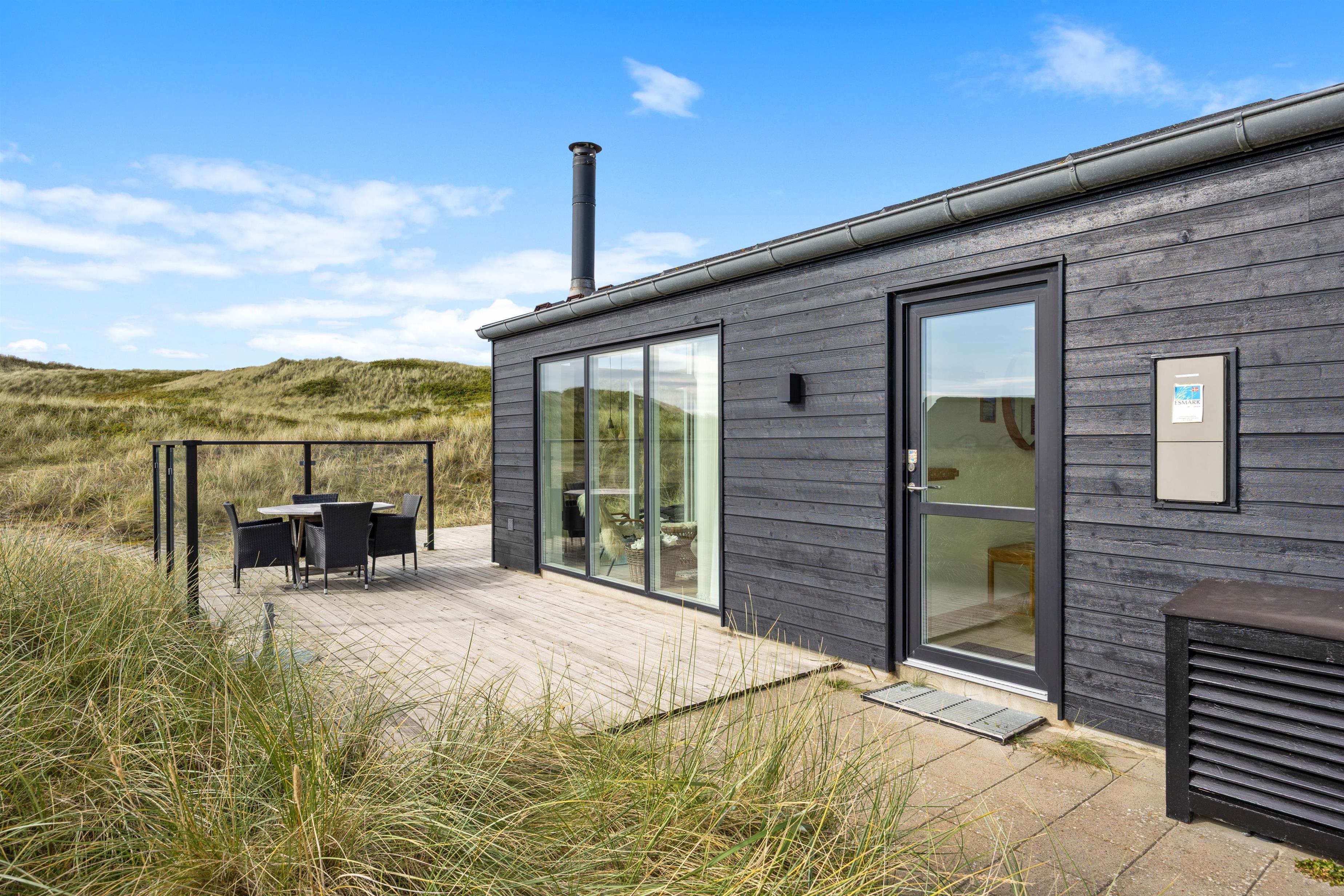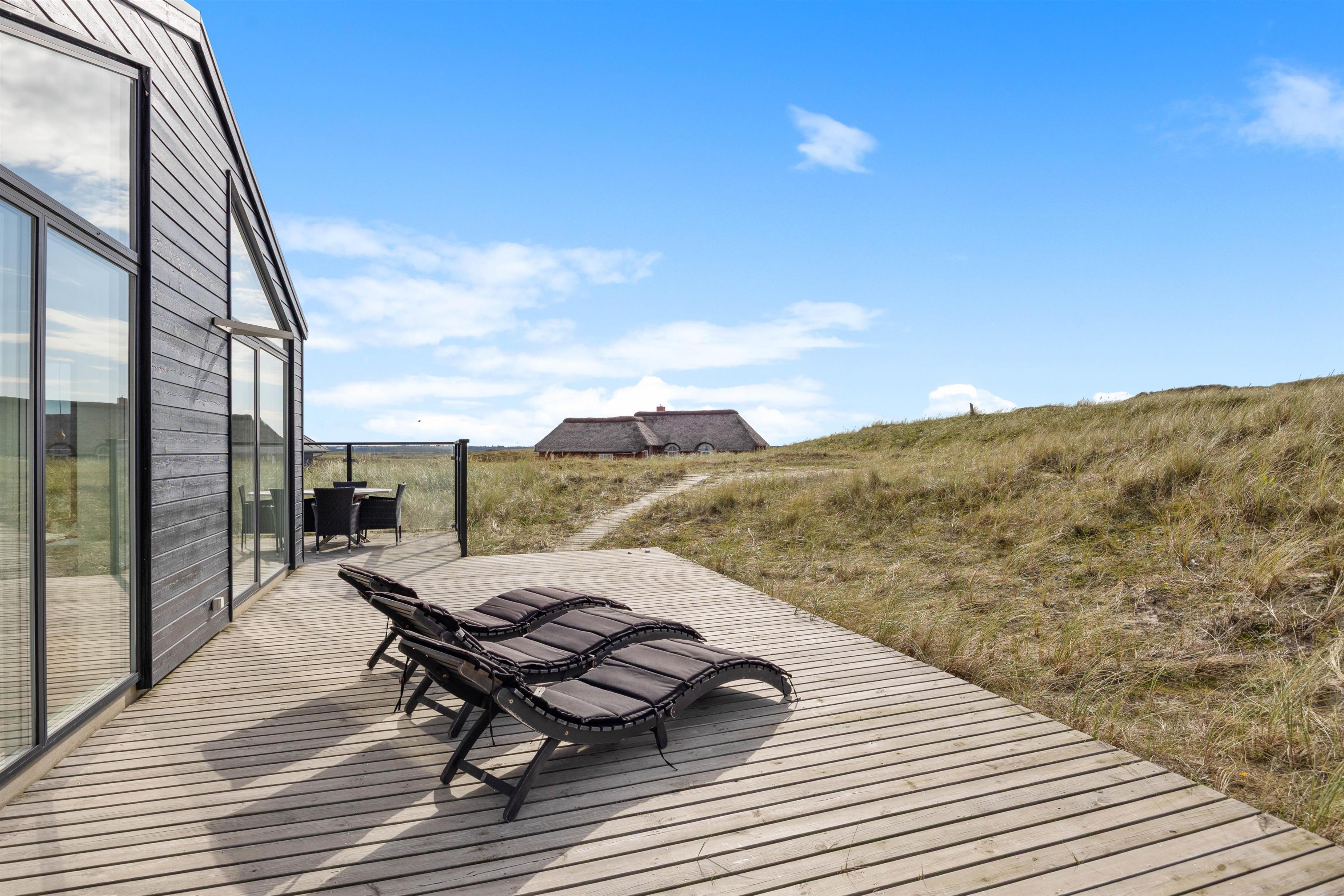 Når du bor i første klitrække, som i dette sommerhus, bliver du nærmest ét med naturen. De bølgende marehalmsklædte klitter og det fredede hedeareal mod syd er ren helse for sjælen. Og du har næsten altid mulighed for at opholde dig på terrassen, idet den strækker sig hele vejen rundt om feriehuset. Fra terrassen er både duften og lyden af Vesterhavet en vanedannende oplevelse – ikke mærkeligt, at mange vender tilbage hertil år efter år.
