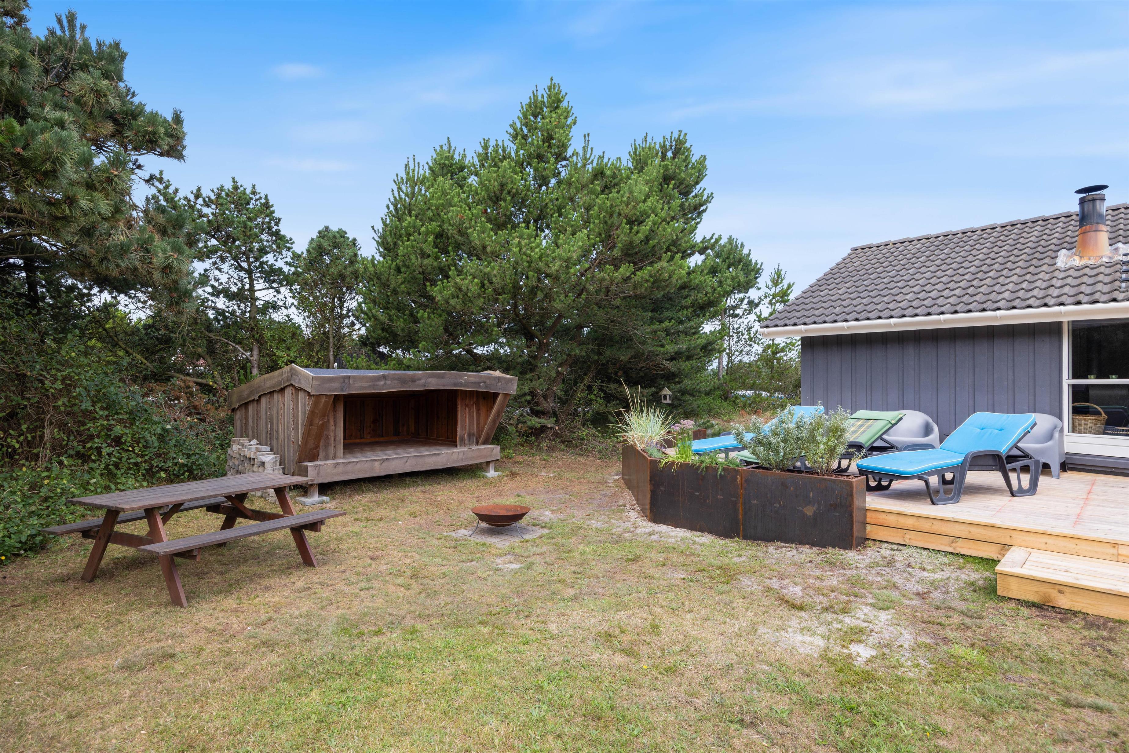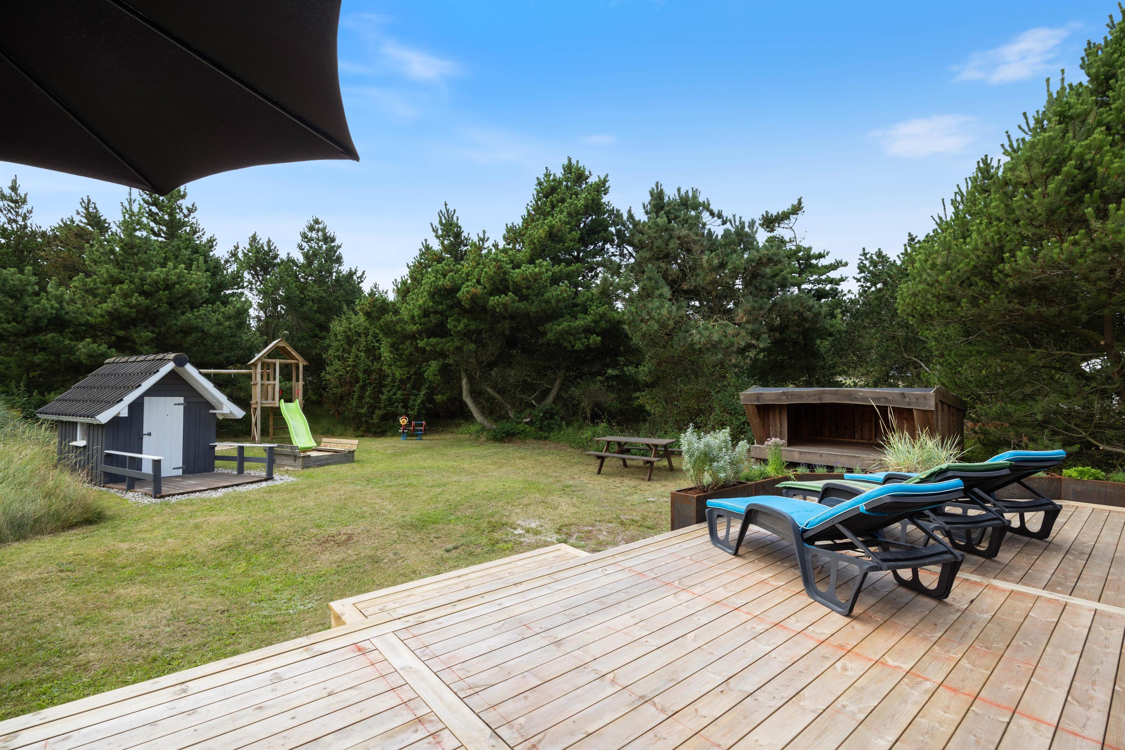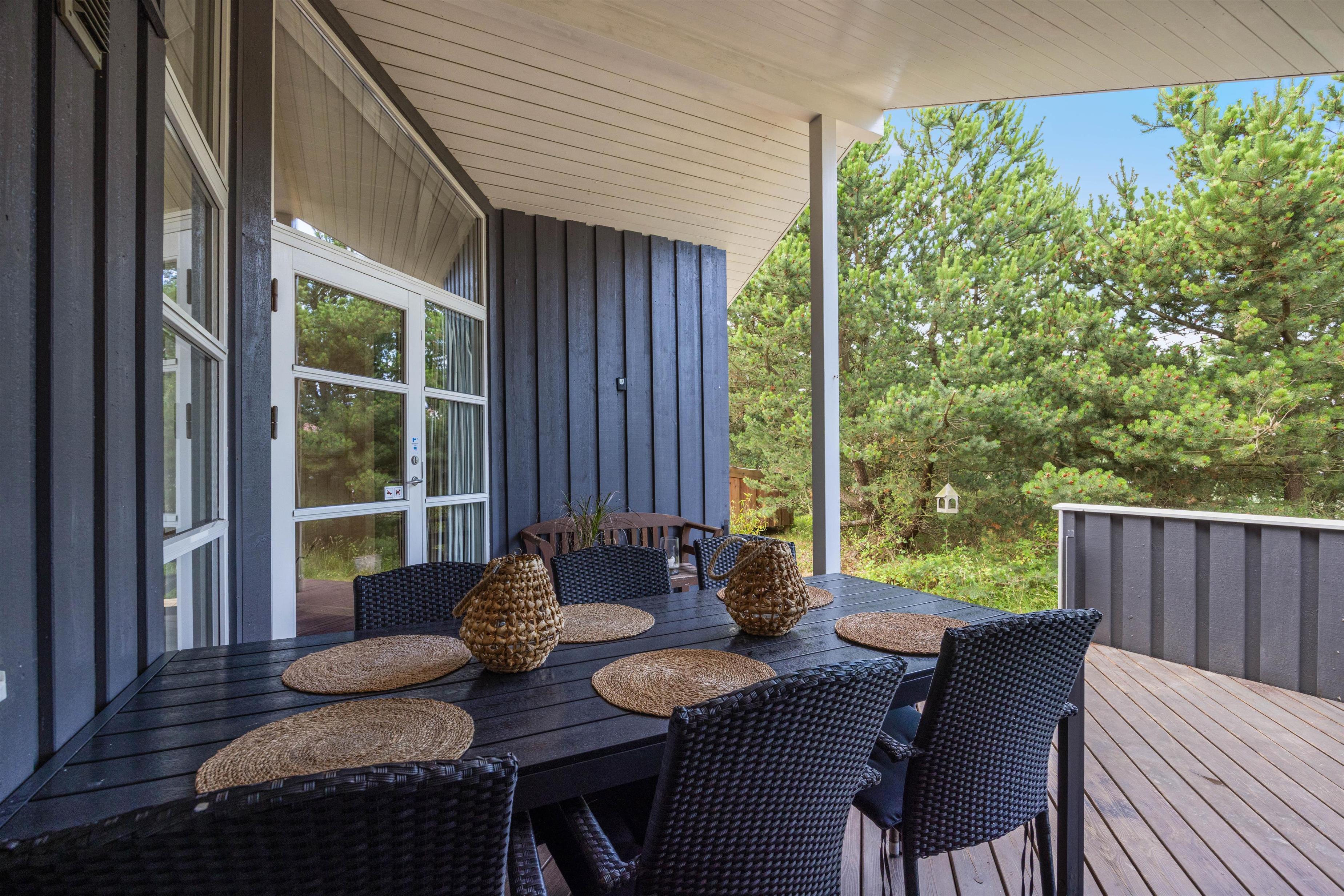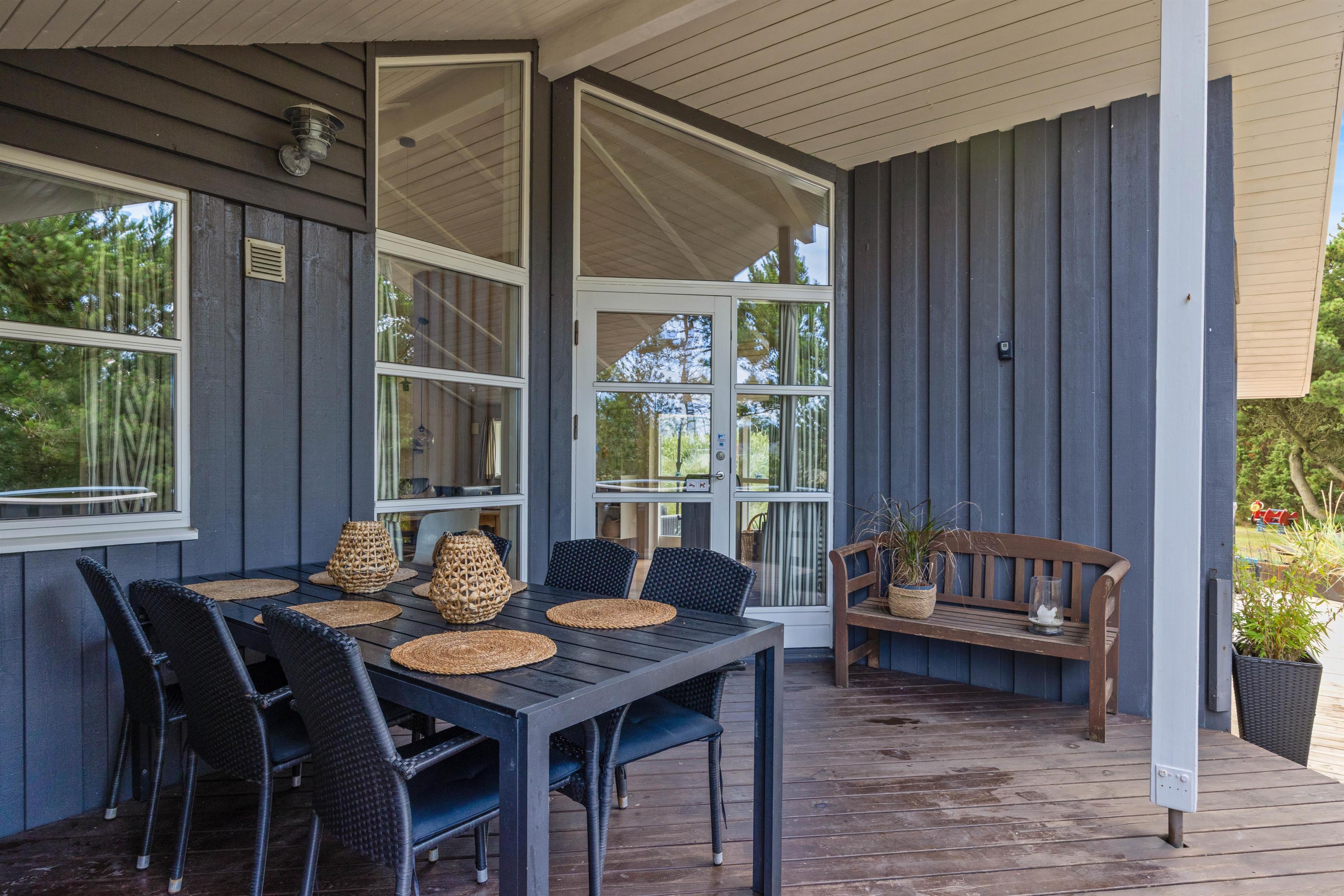Sommerhuset står på en naturgrund og er omgivet af terrasser på 3 sider, så du kan følge solen hele vejen rundt om feriehuset – fra morgenmaden på den østvendte terrasse til aftensmaden på den delvist overdækkede terrasse mod vest. Her er selvfølgelig havemøbler, liggestole og grill, så I rigtig kan slappe af og nyde ferien.