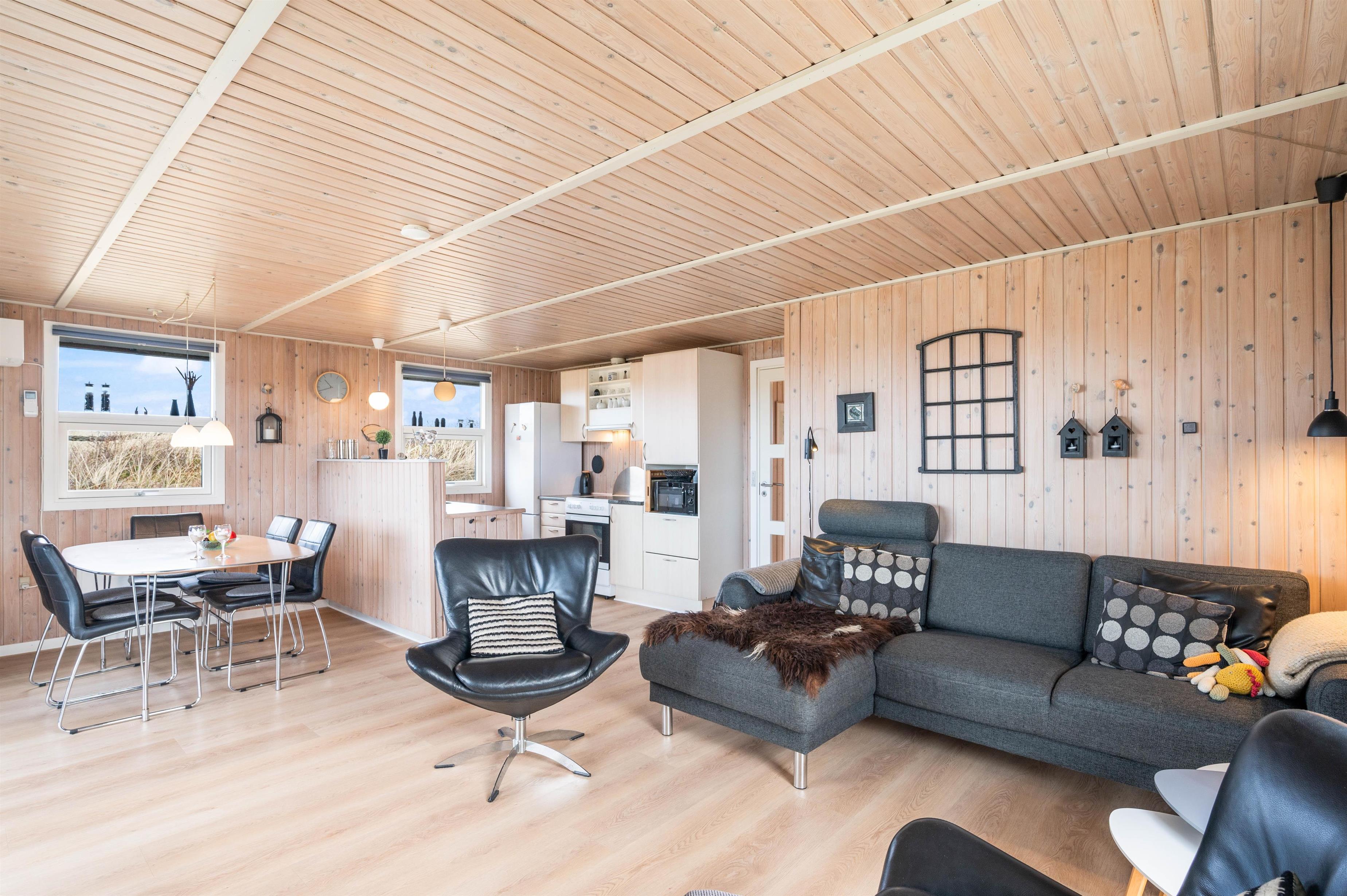Der er terrasse mod øst, mod syd og mod vest, hvilket giver mulighed for at opholde jer udenfor det meste af dagen. Den delvist overdækkede terrasse mod vest er ideel til hyggelige grillaftener. Herfra er der skøn udsigt, der indbyder til en dejlig gåtur igennem klitlandskabet til strand og hav.