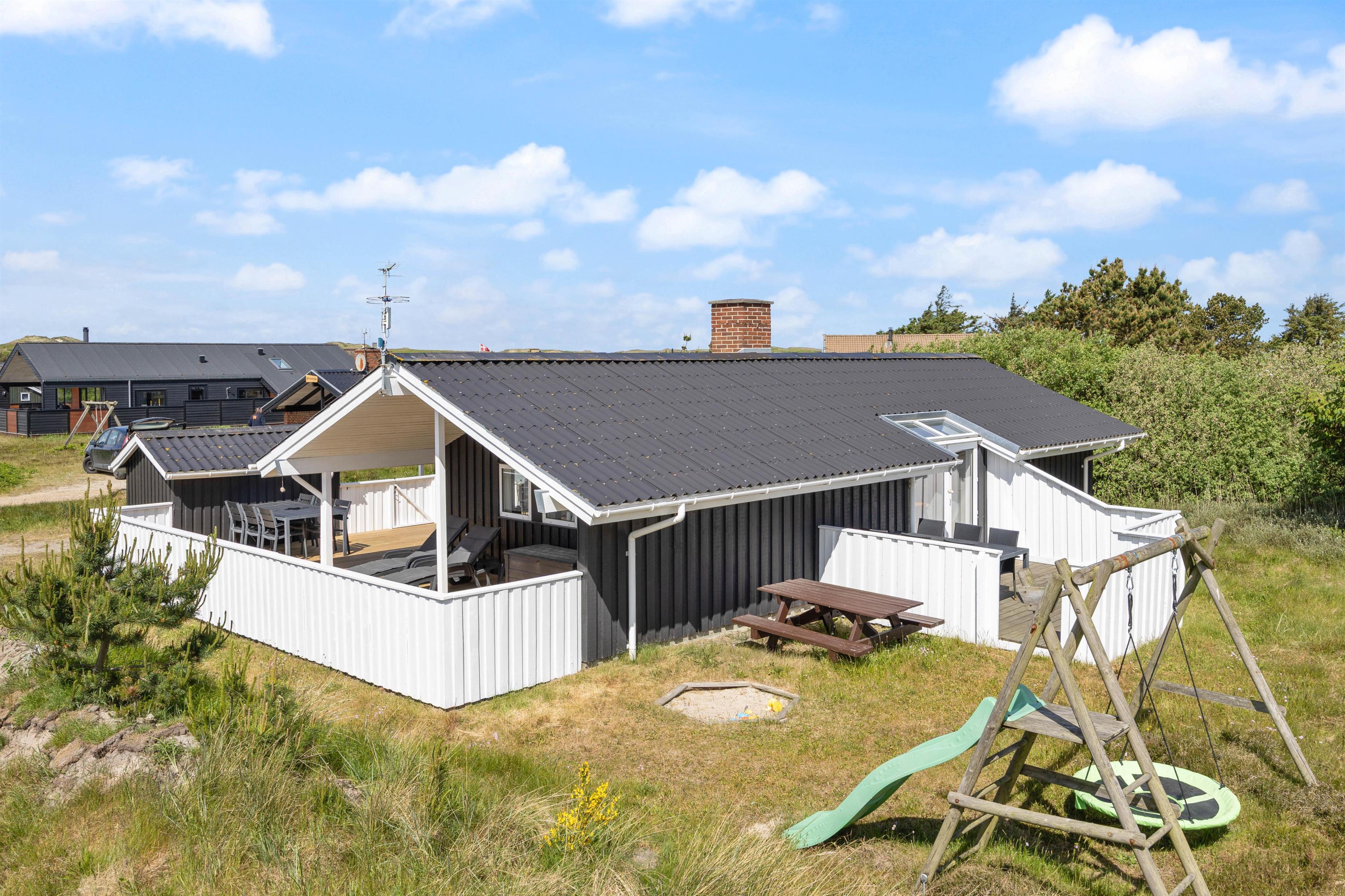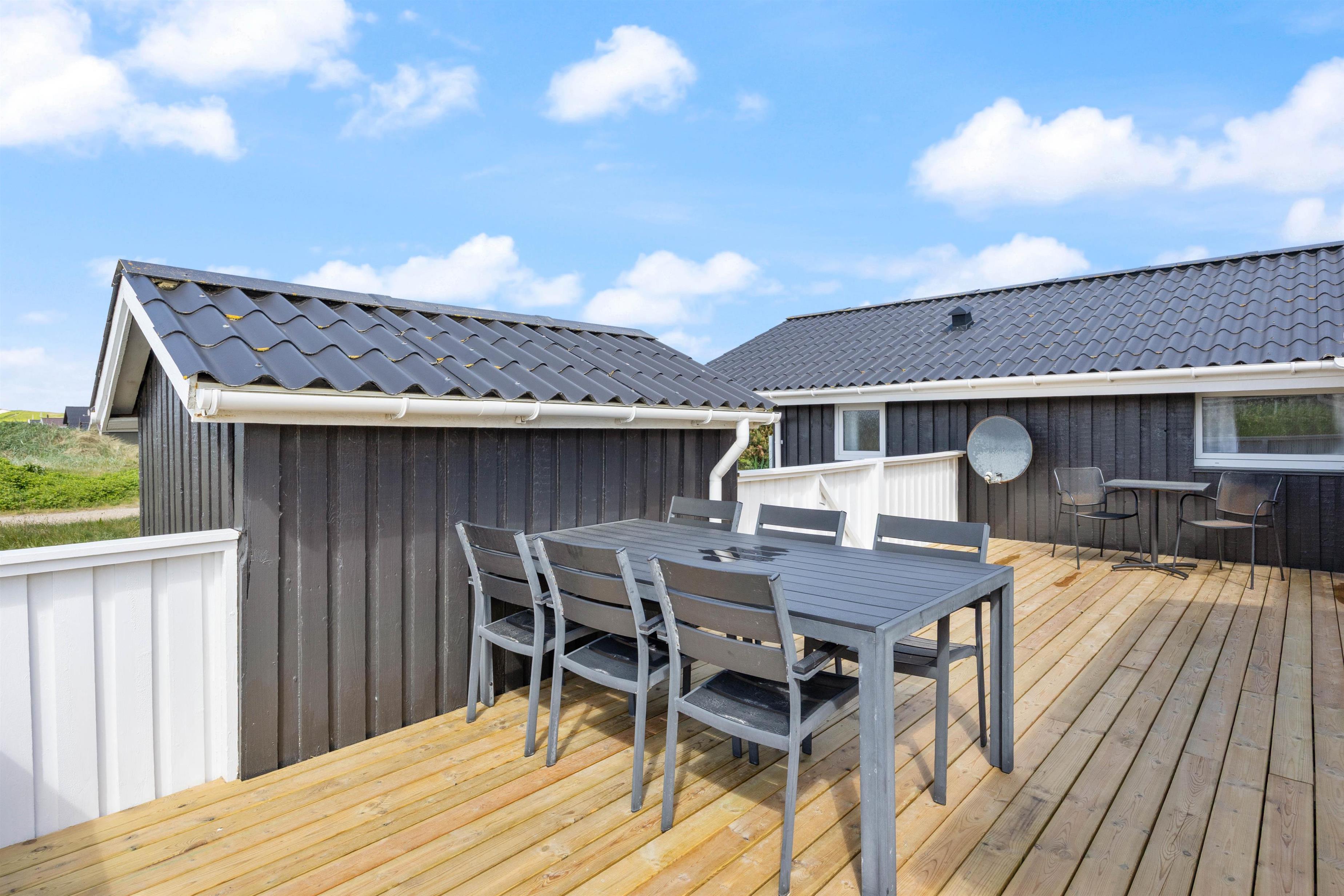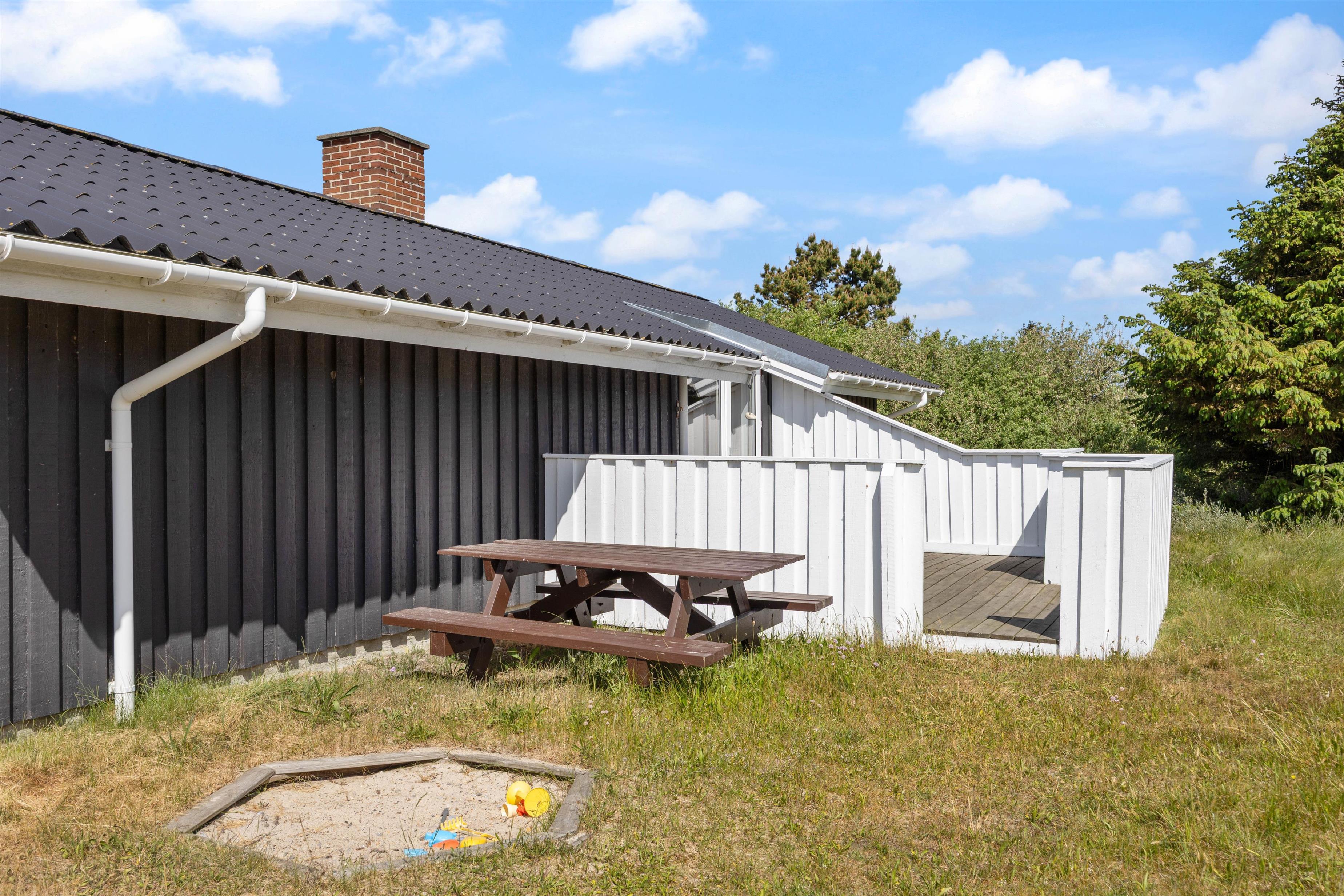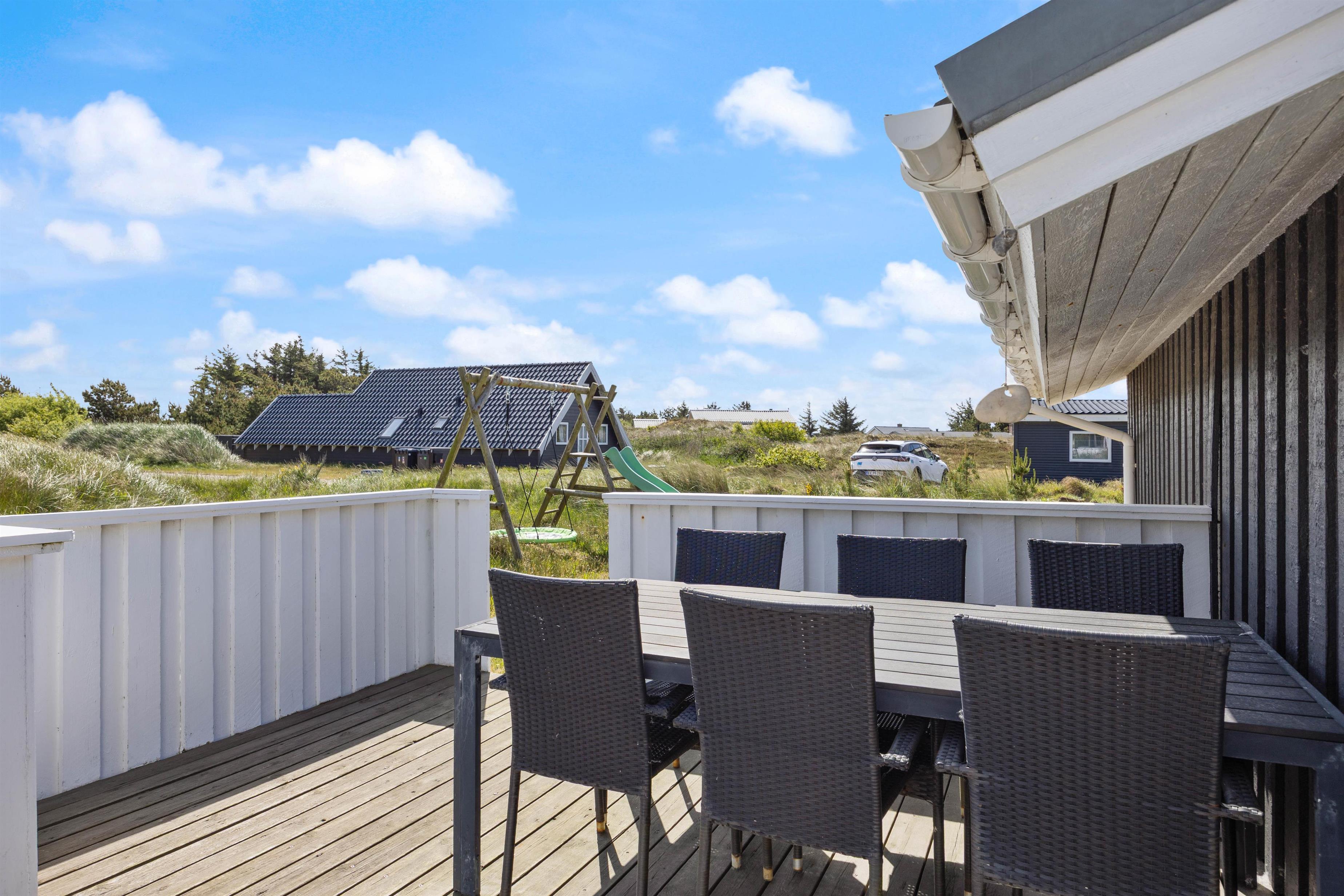 Fra stuen har I adgang til den store lukkede terrasse, der er udstyret med havemøbler, grill og liggestole. Dette er den største terrasse, men på feriehusets østside kan I nyde formiddagssolen og se børnene lege i sandkassen eller gynge.
