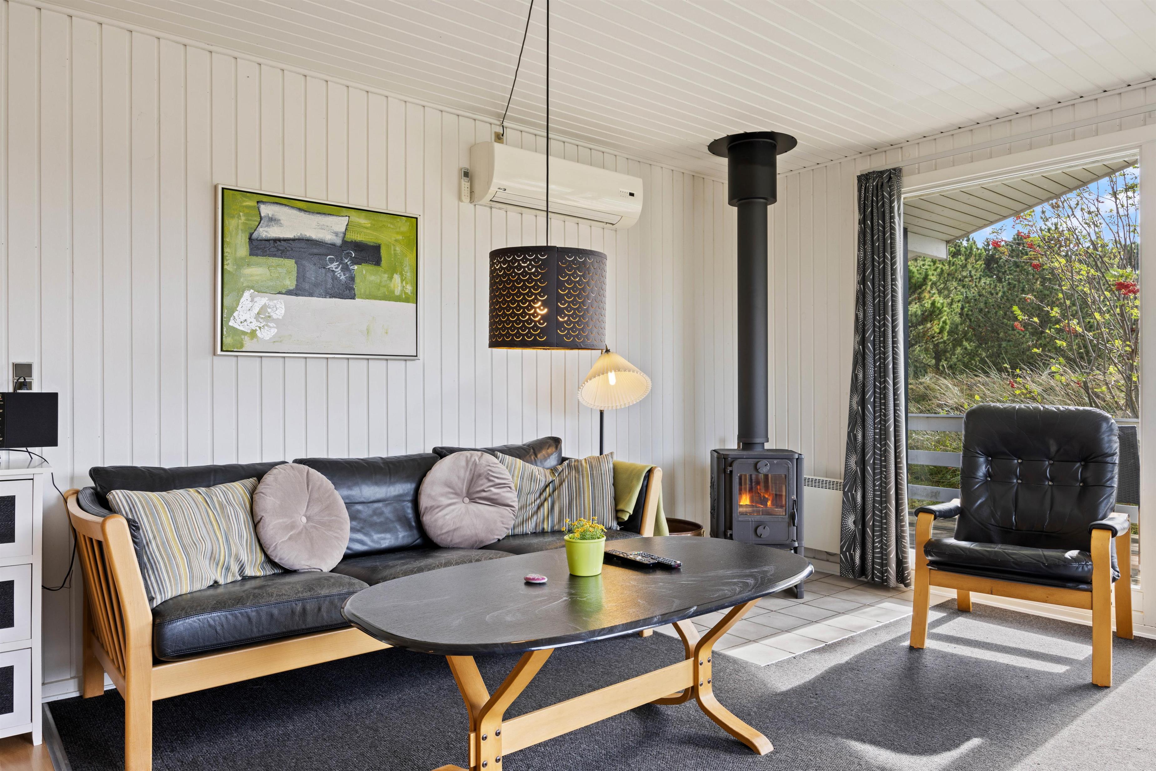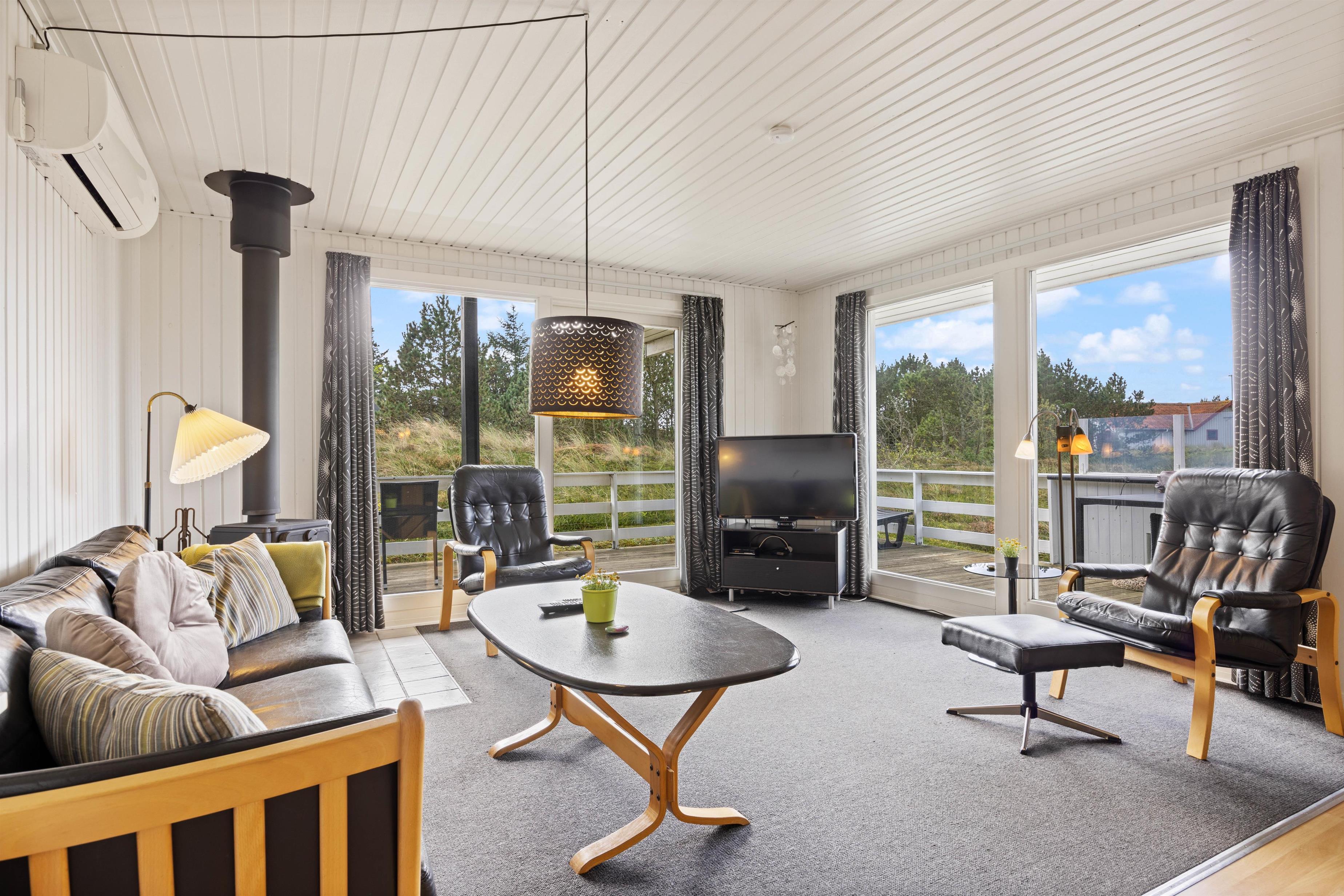 Et velindrettet feriehus med fine lyse rum og gedigen møblering lige fra det lyse og funktionelle køkken over den praktiske spiseafdeling til den hyggelige opholdsafdeling med brændeovn. De lyse trævægge og -lofter emmer af sommerhusstemning, og på værelserne og i stuen er der gulvtæppe. I stuen kan hele familien samles omkring spisebordet til en lækker brunch, mens den om aftenen står på filmaften i sofaen. Find popcornene frem, og stream jeres yndlingsfilm via Chromecast.