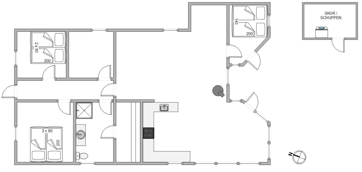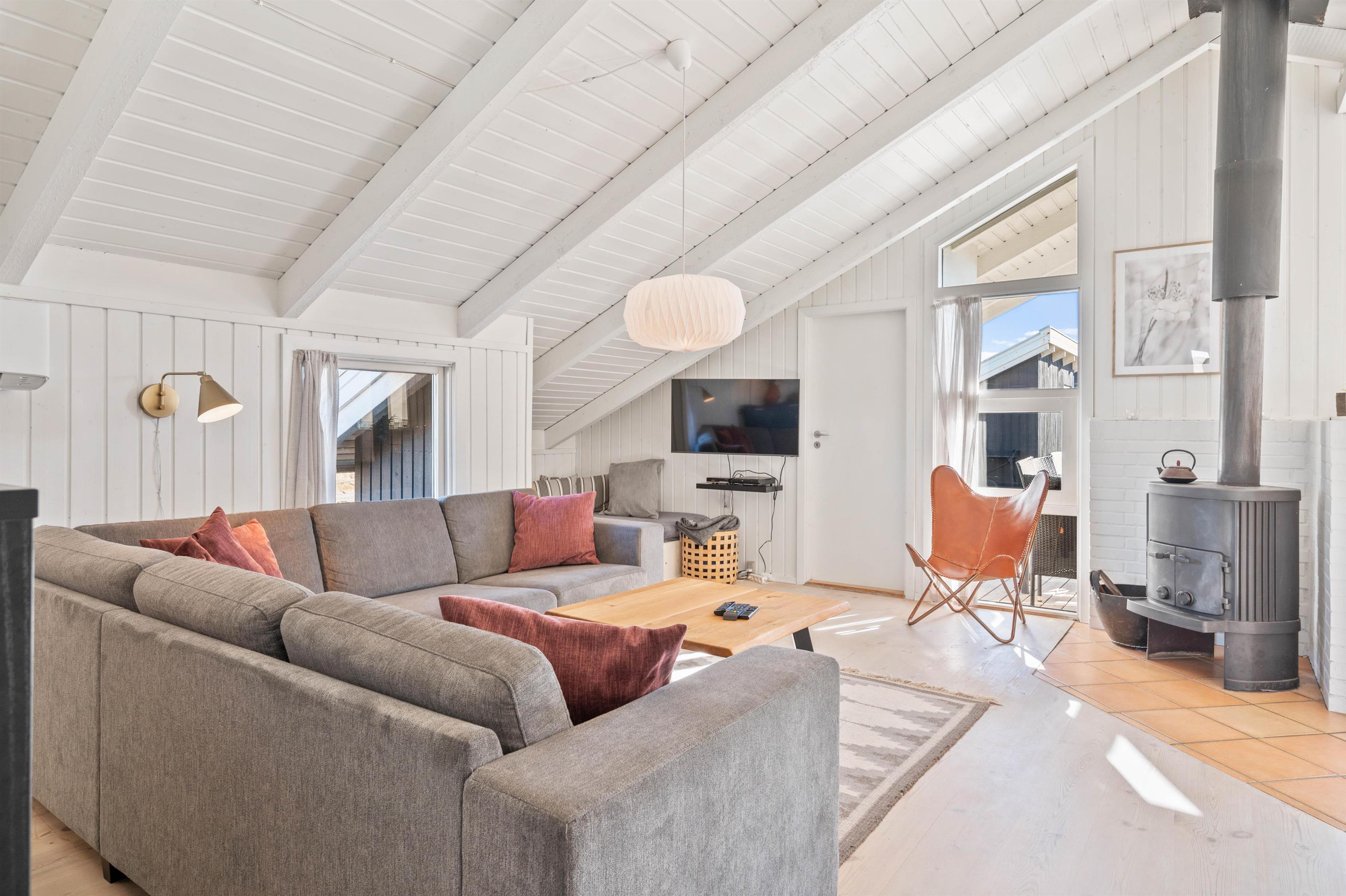 Stuen er som resten af sommerhuset hvidmalet og har et flot fyrretræsgulv. Stuen er indrettet med gode møbler, fladskærm og brændeovn. Her er desuden en rigtig hyggelig alkove, der er perfekt til hygge med en god bog eller måske en middagslur. Her vil børnene helt sikkert også hygge sig med at bygge huler. I sommerhuset er der gratis trådløst internet.
