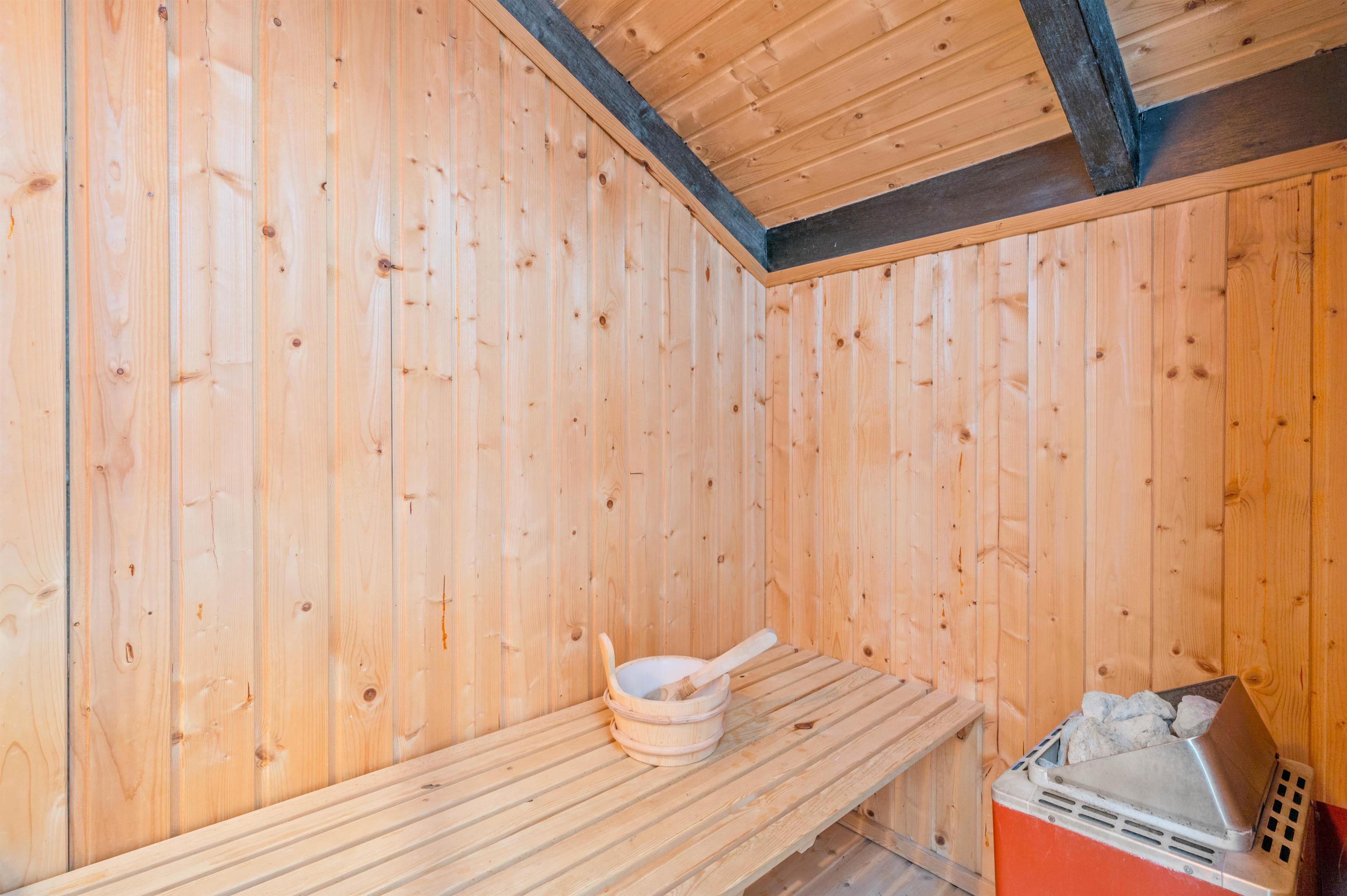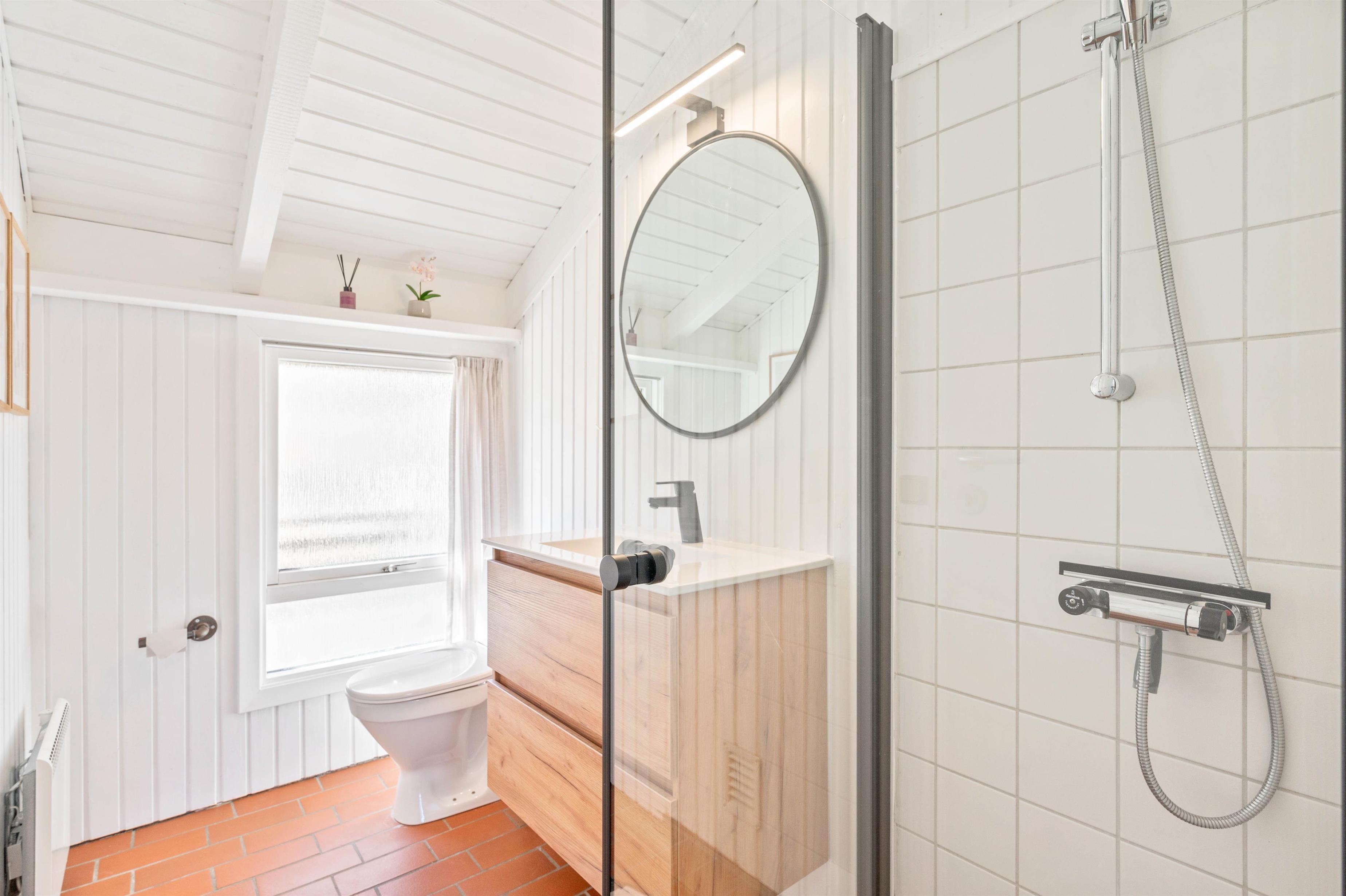 Sommerhuset har et lyst og nydeligt badeværelse med bruseniche og indgang til pæn, stor sauna, hvor I rigtig kan slappe af og nyde roen og varmen efter en god gåtur ved vandet. I sommerhuset er der desuden en vaskemaskine, så I kan vaske lidt tøj eller håndklæder i løbet af ferien.