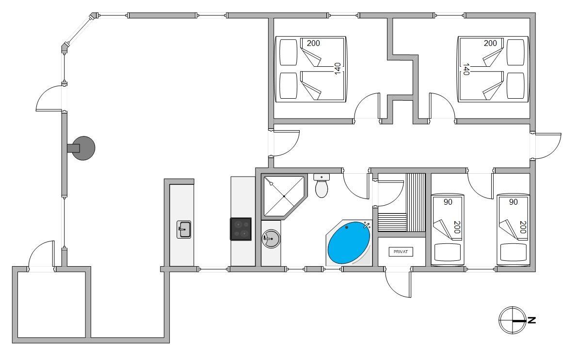Feriehuset har tre hyggelige soveværelser, to med dobbeltsenge og et med to enkeltsenge. Særligt praktisk: sengene har vendbare madrasser, en blød og en hård side, så der er noget for enhver smag.