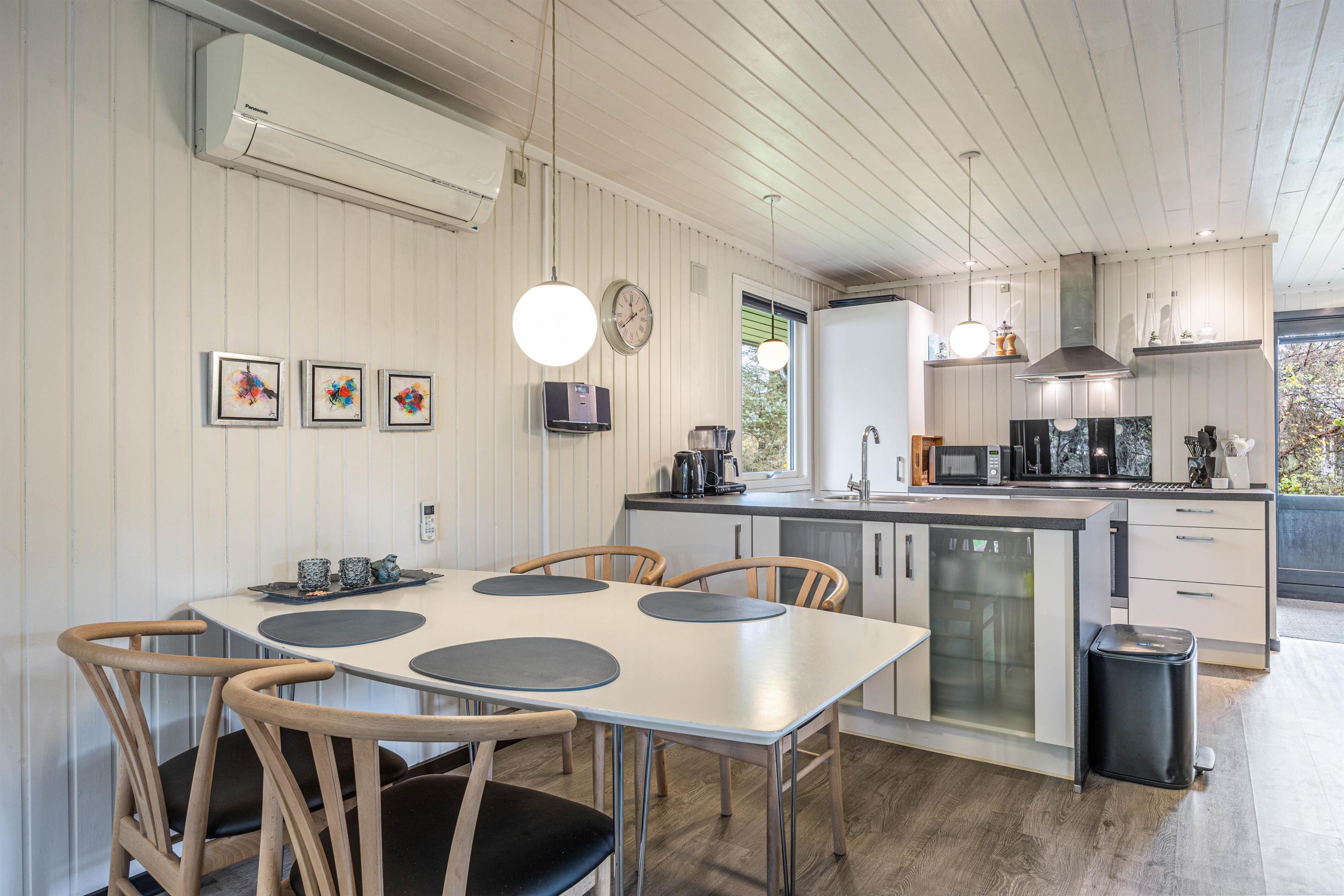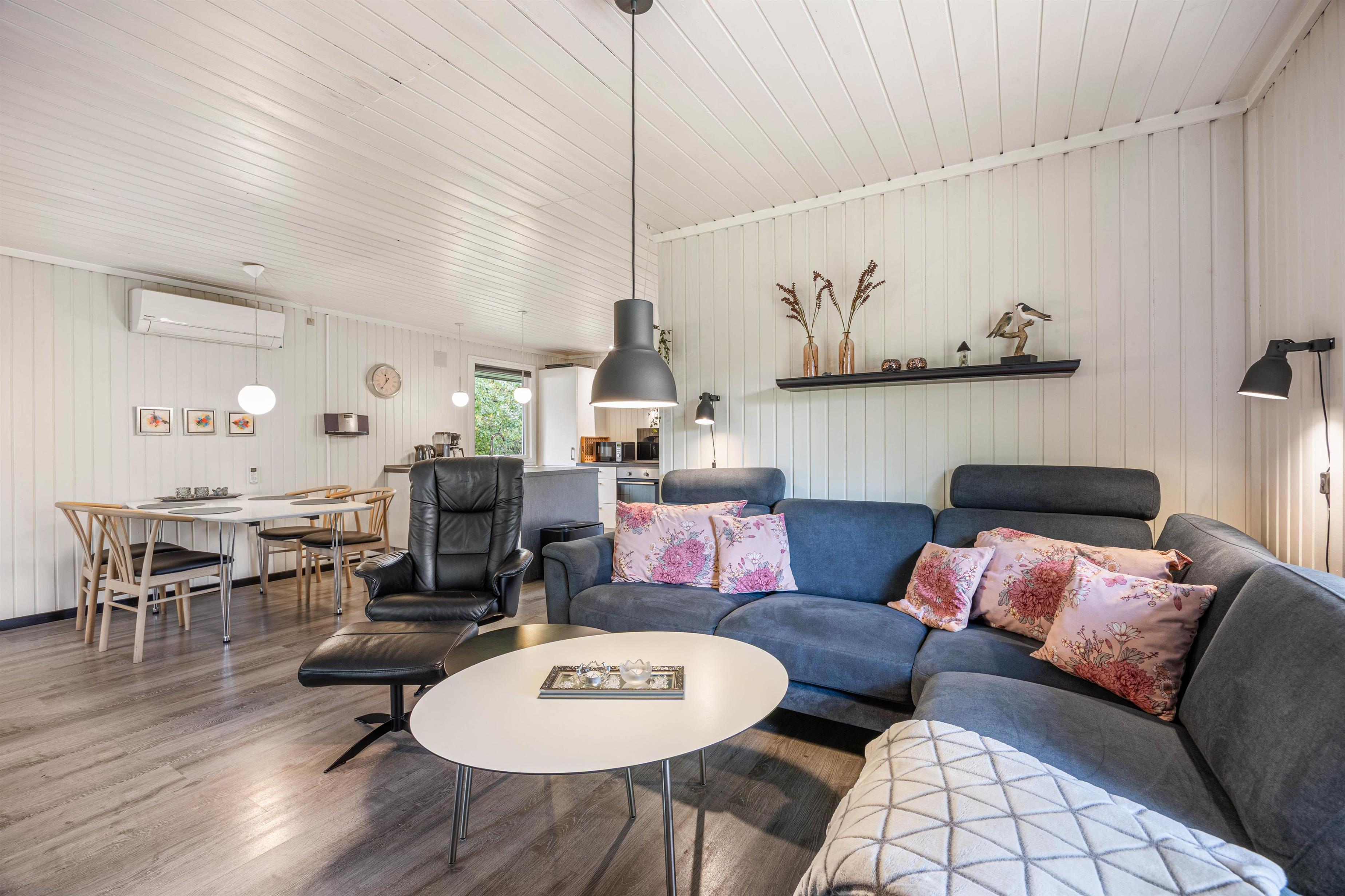 Sommerhusets stue er charmerende indrettet med brændeovn, så I kan nyde ildens dansen og den gode varme efter en frisk gåtur ved Vesterhavet. Brændeovnen skaber en hyggelig og afslappende atmosfære, som indbyder til rolige aftener med brætspil eller en god bog. Der er desuden en energibesparende luft-til-luft varmepumpe, som I med fordel kan benytte jer af, for at holde temperaturen behagelig året rundt. Køkkenet er veludstyret med moderne bekvemmeligheder som opvaskemaskine og en separat fryser på 80L.
