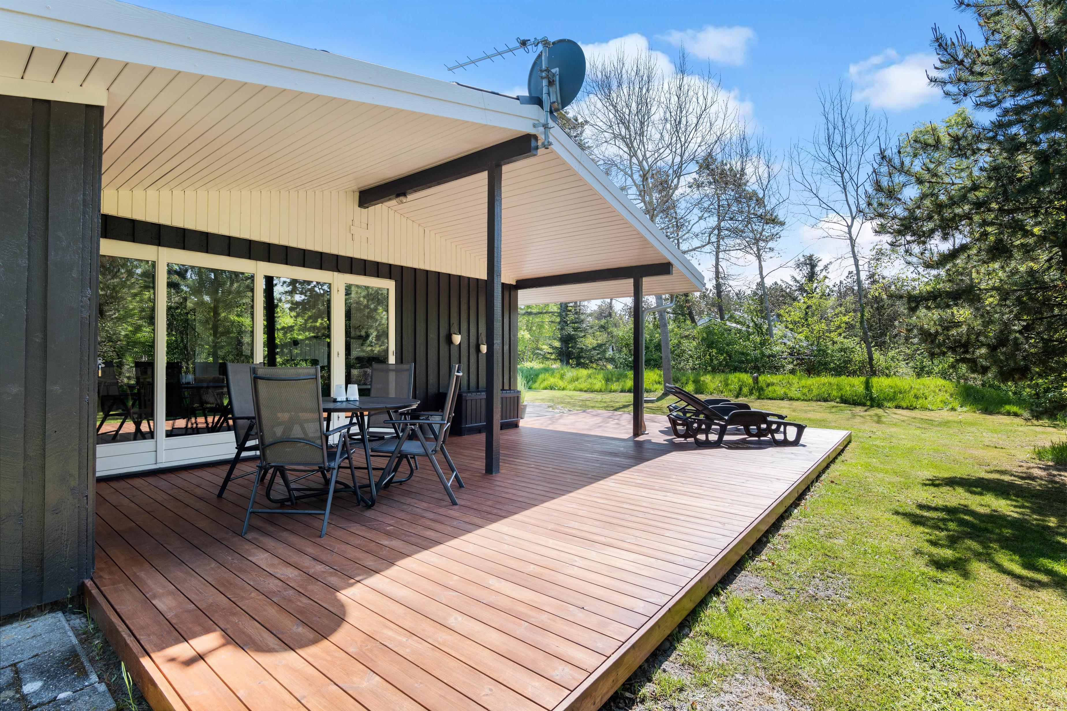 Sommerhuset byder på gode terrasser – mod vest en delvist overdækket terrasse og mod syd en dejlig, åben og stor terrasse, som er velegnet til brug i løbet af dagen. Her kan I solbade, grille eller bare slappe af med en bog i den friske luft.