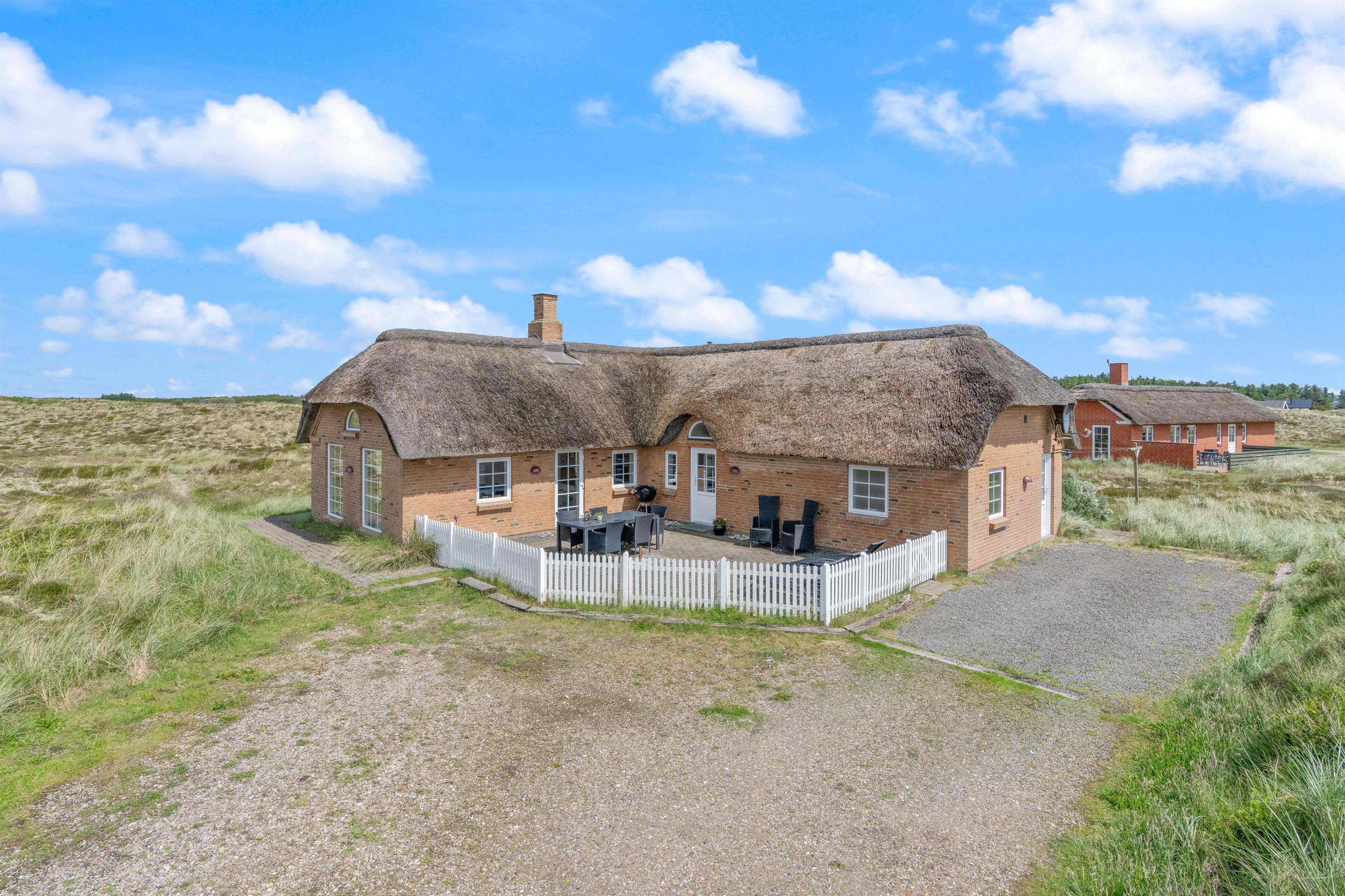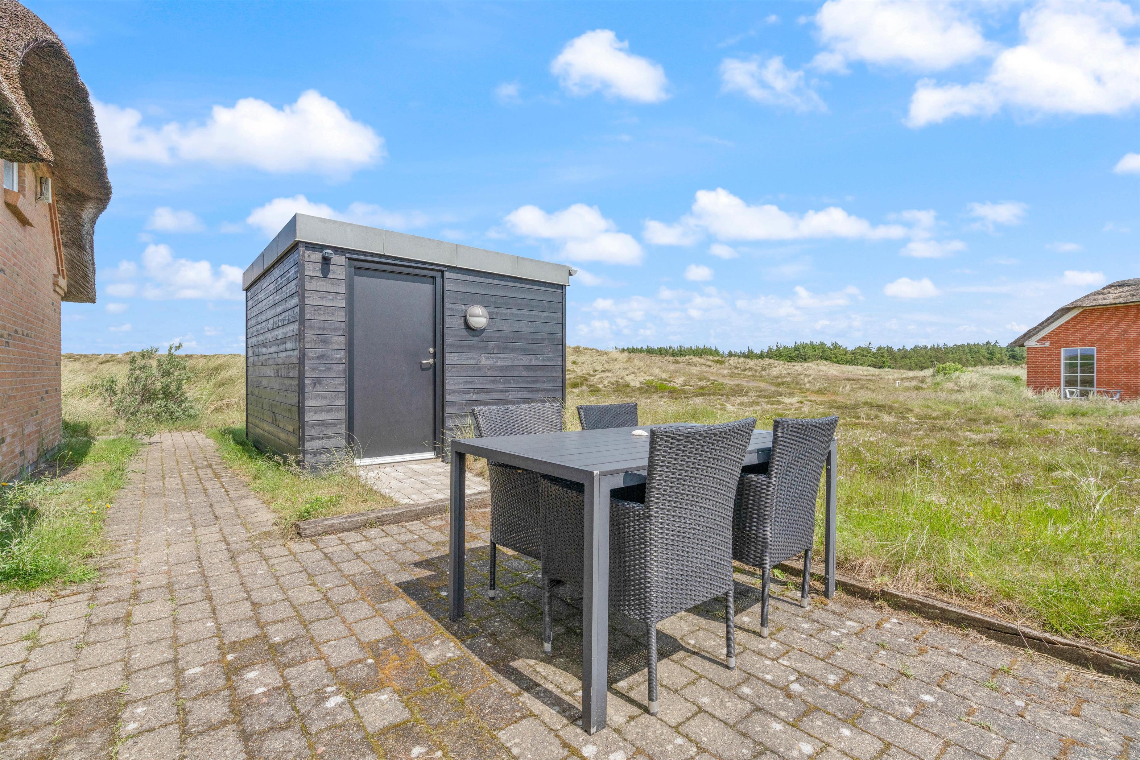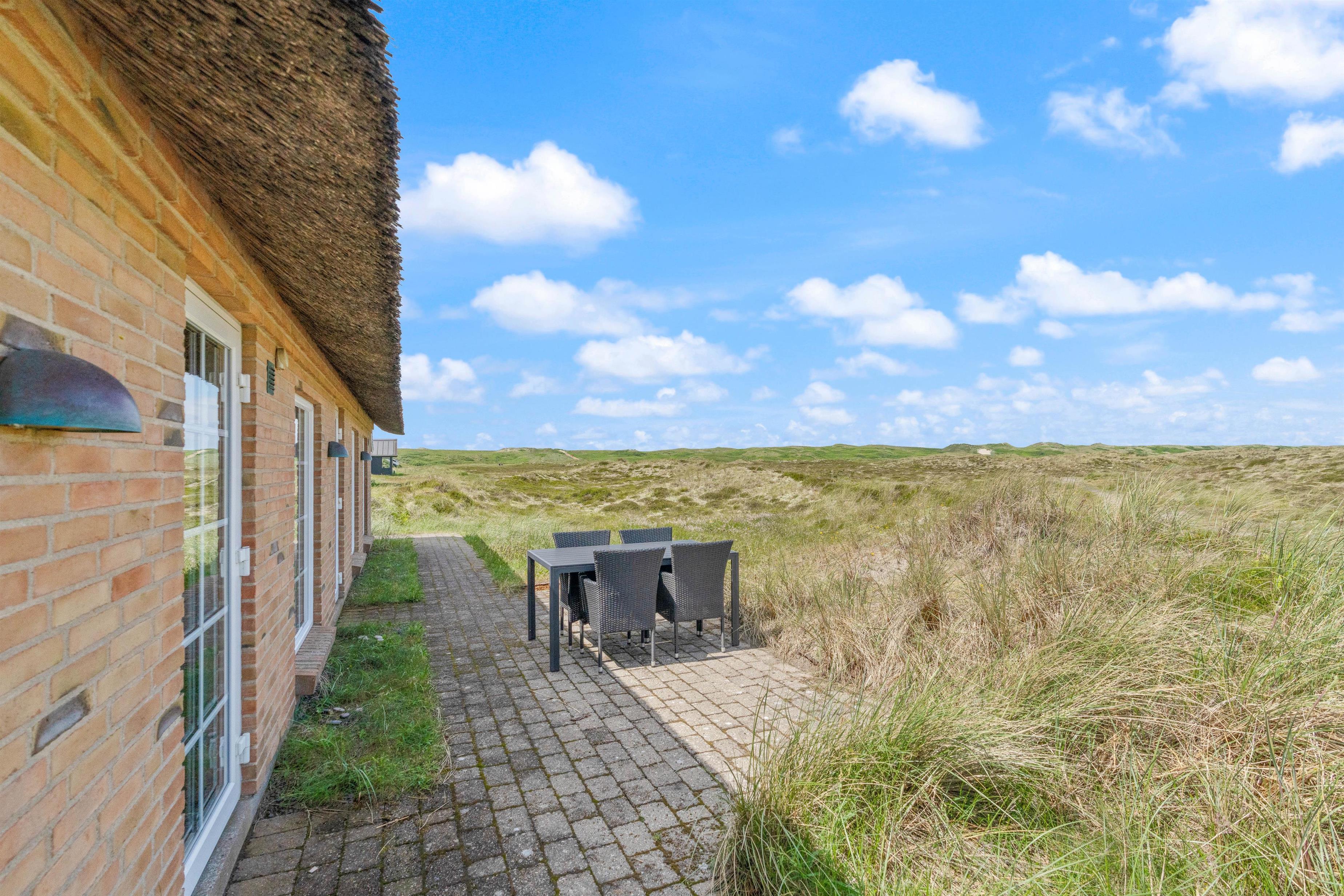 Omgivet af den 1200m² store naturgrund har I forskellige siddemulighed omkring sommerhuset og kan nyde udsigten ud over naturen med hede- og klitlandskabet omring jer. På den lukkede terrasse er der komfortable havemøbler og liggestole, som indbyder til afslapning. Her kan du også lade dine små børn og dine hunde løbe frit omkring, uden at de udforsker omgivelserne uden dig.
