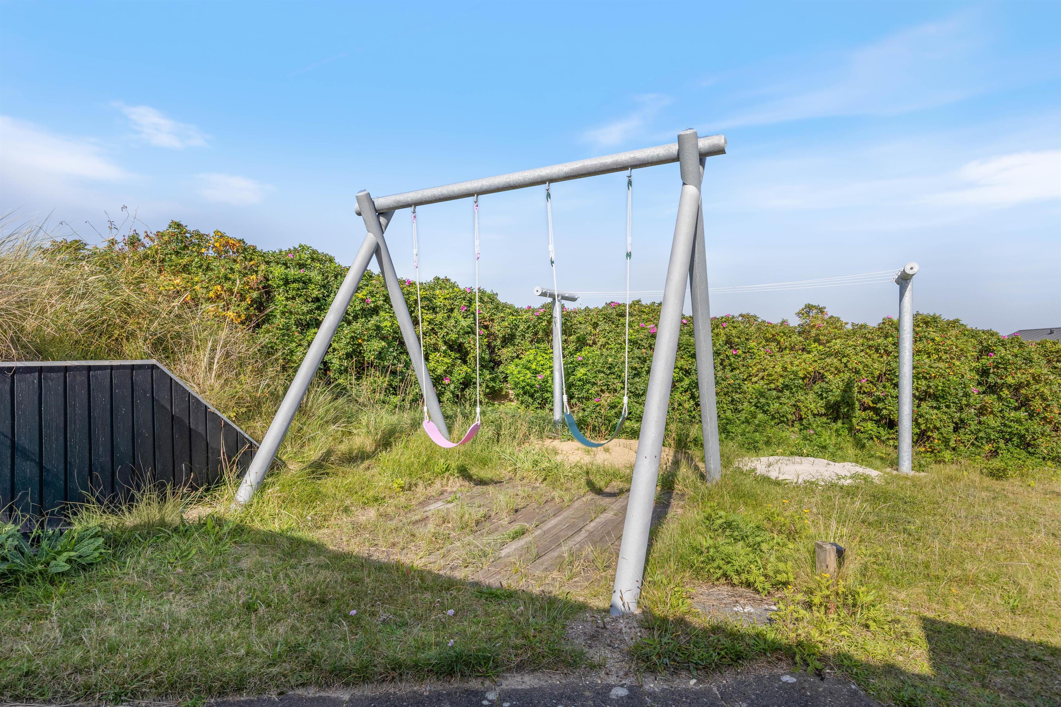 Der er gode terrasser tilhørende sommerhuset, som strækker sig rundt fra øst, mod syd og mod vest. Mod øst er terrassen særdeles anvendelig i morgen og formiddagstimerne og til hen på eftermiddagen. Herefter kan I benytte den sydvendte del, hvor I er helt uforstyrret, ligesom I er på den vestvendte terrasse. Mod vest er terrassen endvidere delvis overdækket, ligesom den er delvis afskærmet både mod syd og mod vest. Der er en sandkasse og en gynge til de små.