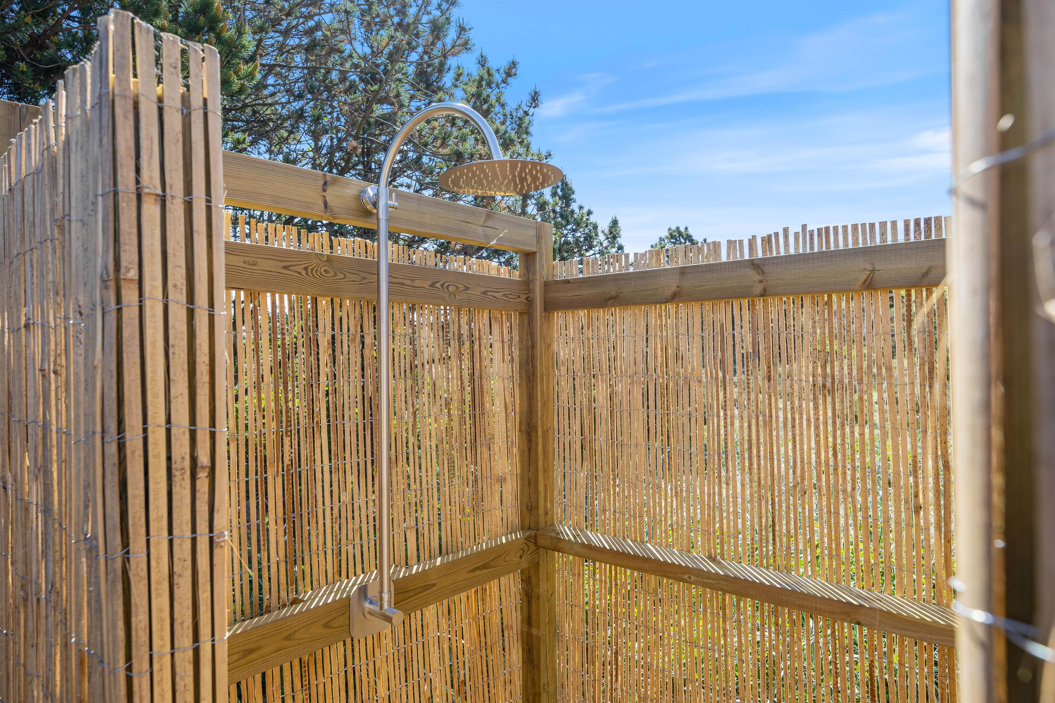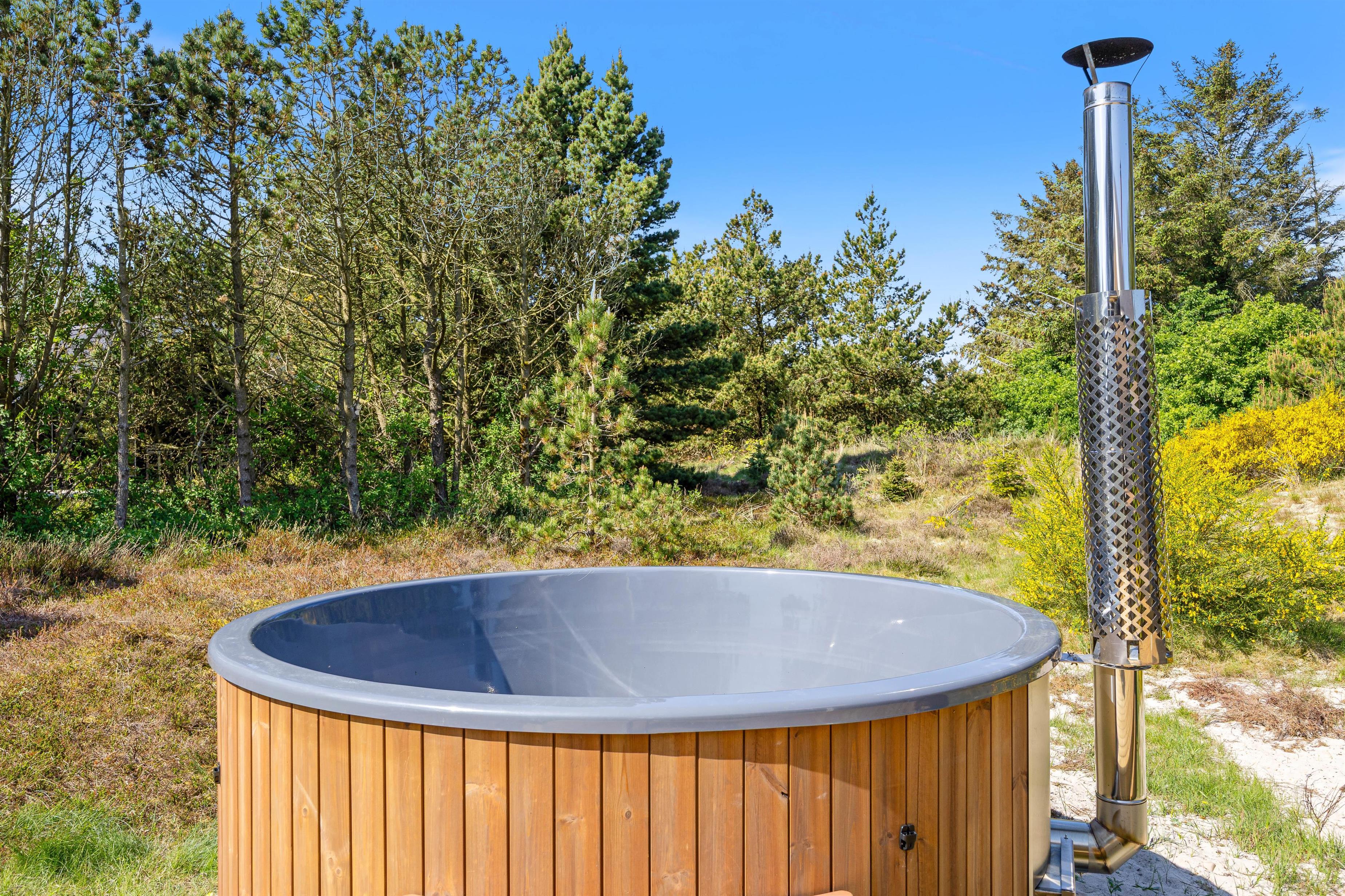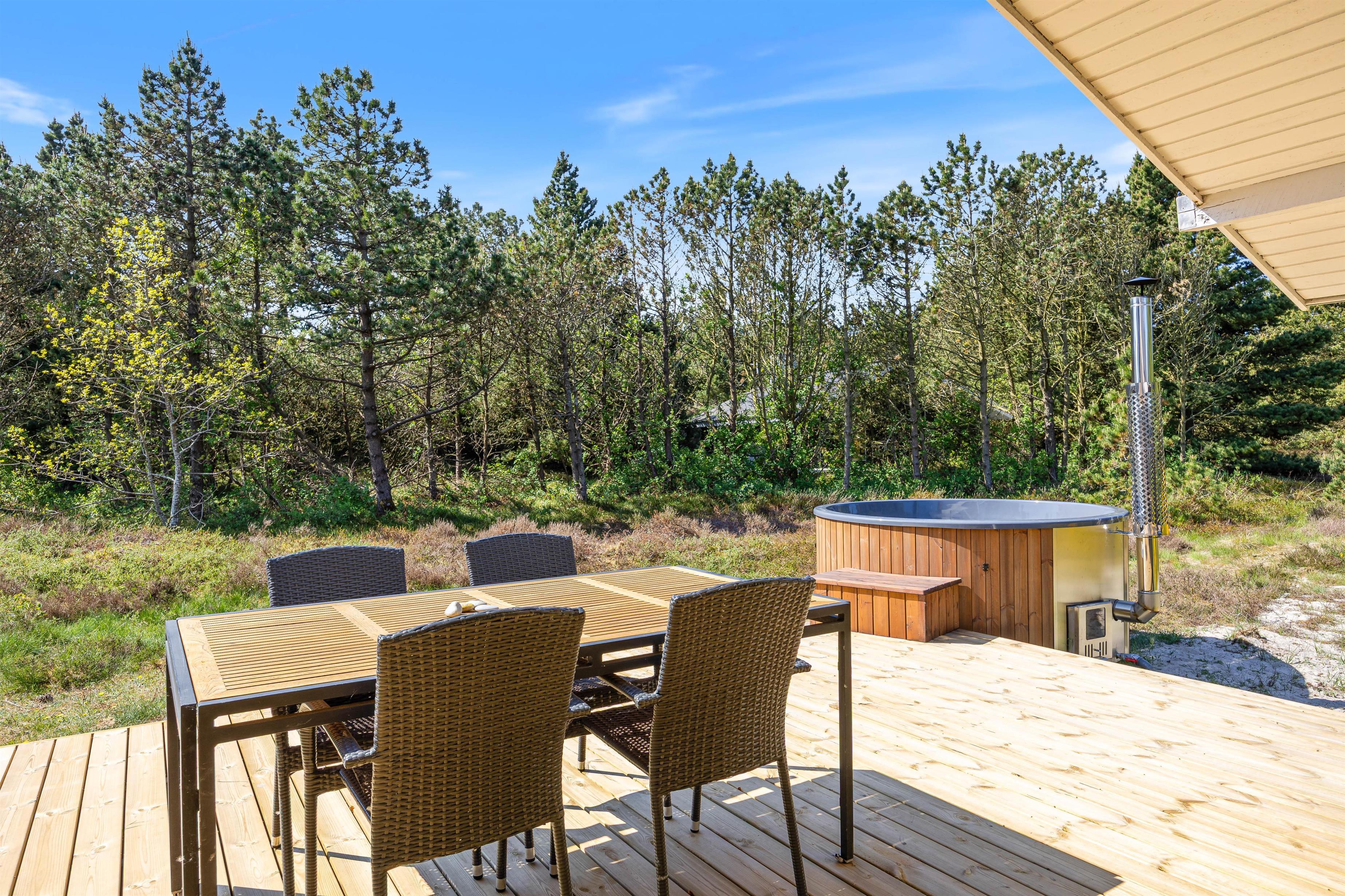 På den 1456 kvadratmeter store naturgrund kan alle feriegæster boltre sig og slappe af. Udeområdet er udstyret med havemøbler, liggestole og en grill, ideel til hyggelige aftener. Den rummelige terrasse, der delvist er overdækket, indbyder til ophold i al slags vejr. Tænd op i grillen, mens skyggerne bliver lange, og nyd et lækkert grillmåltid sammen. Bagefter kan I hoppe en tur i vildmarksbadet eller gå en tur til stranden og opleve solnedgangen ud over Vesterhavet. Sommerhuset har desuden en udebruser med koldt vand, der kan benyttes fra april til november.