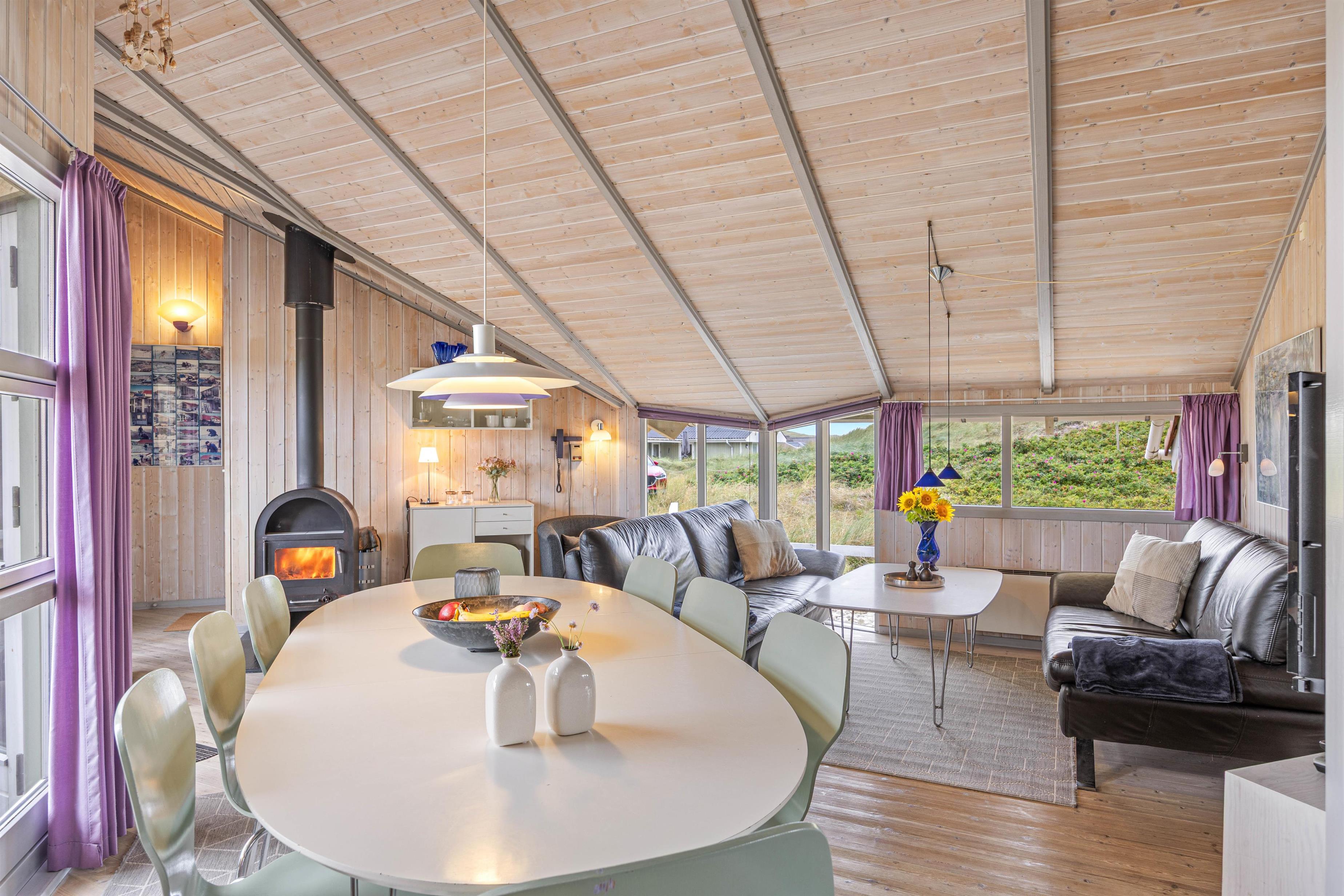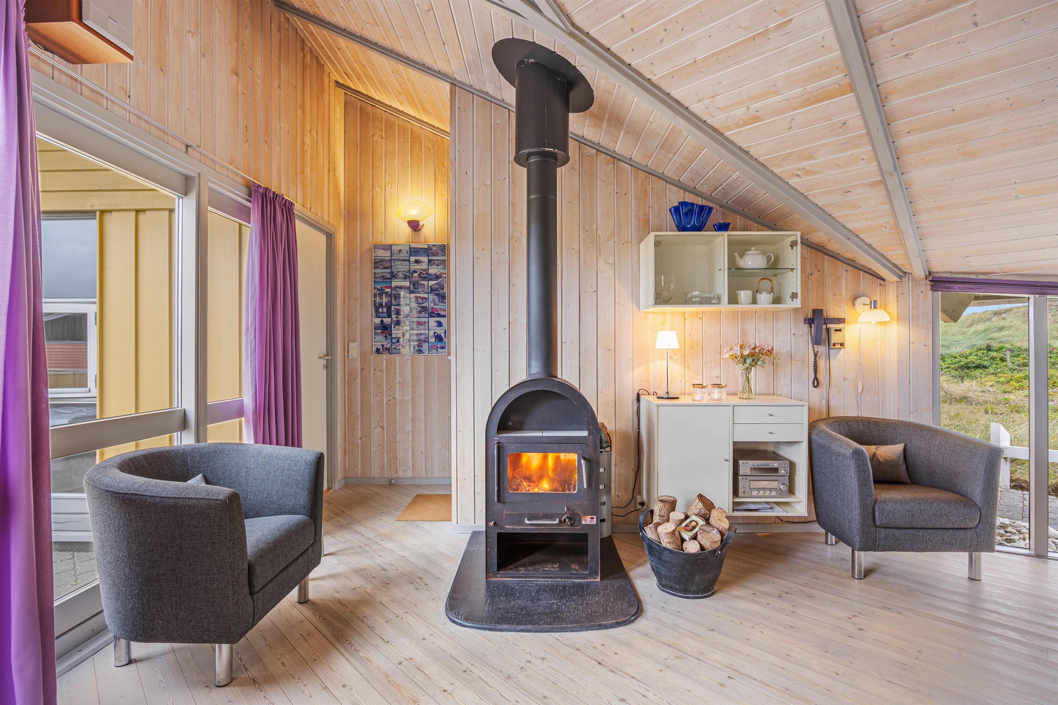 Sommerhuset råder over 4 soveværelser, indrettet med 3 dobbeltsenge og 2 enkeltsenge, så der er plads til hele familien eller flere par. I opholdsrummet kan I samles efter en dag ved havet og nyde varmen og hyggen fra brændeovnen. Varmepumpen sørger samtidig for et behageligt indeklima året rundt.