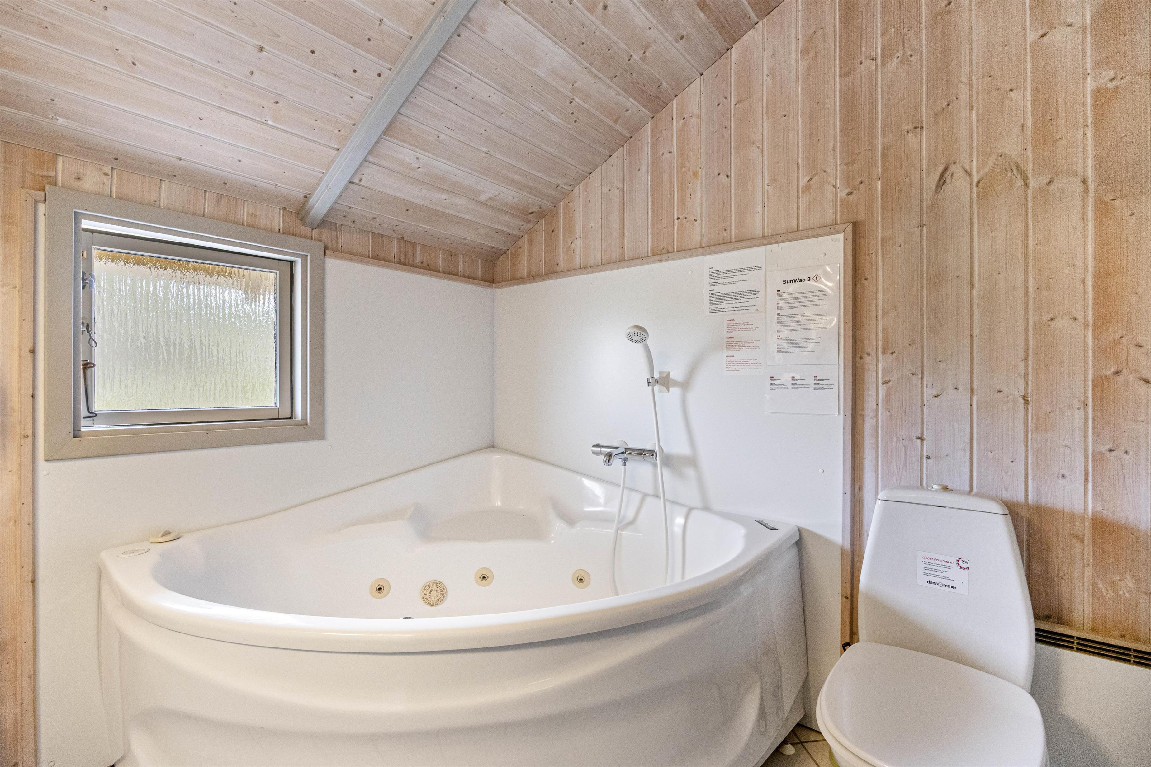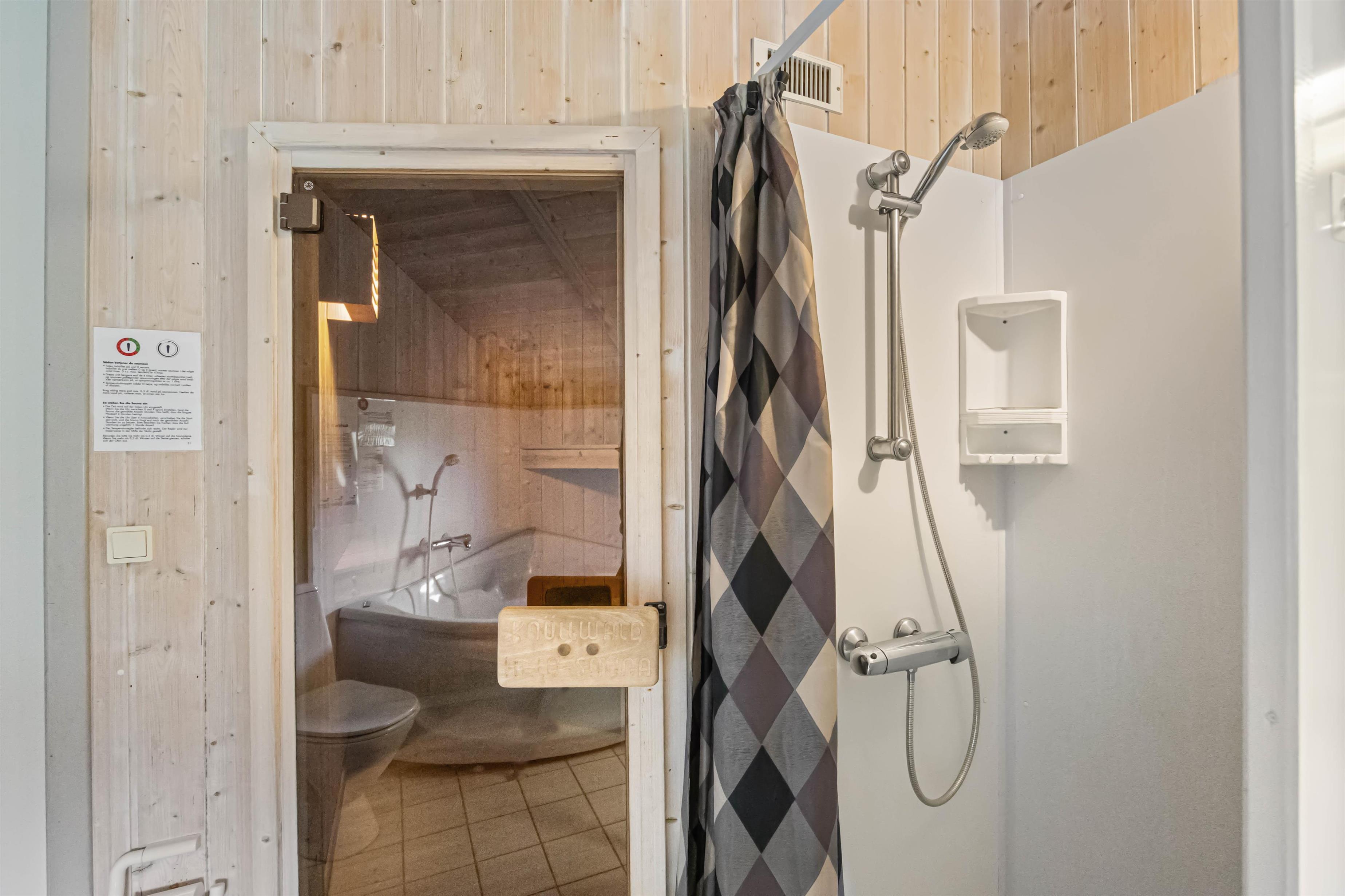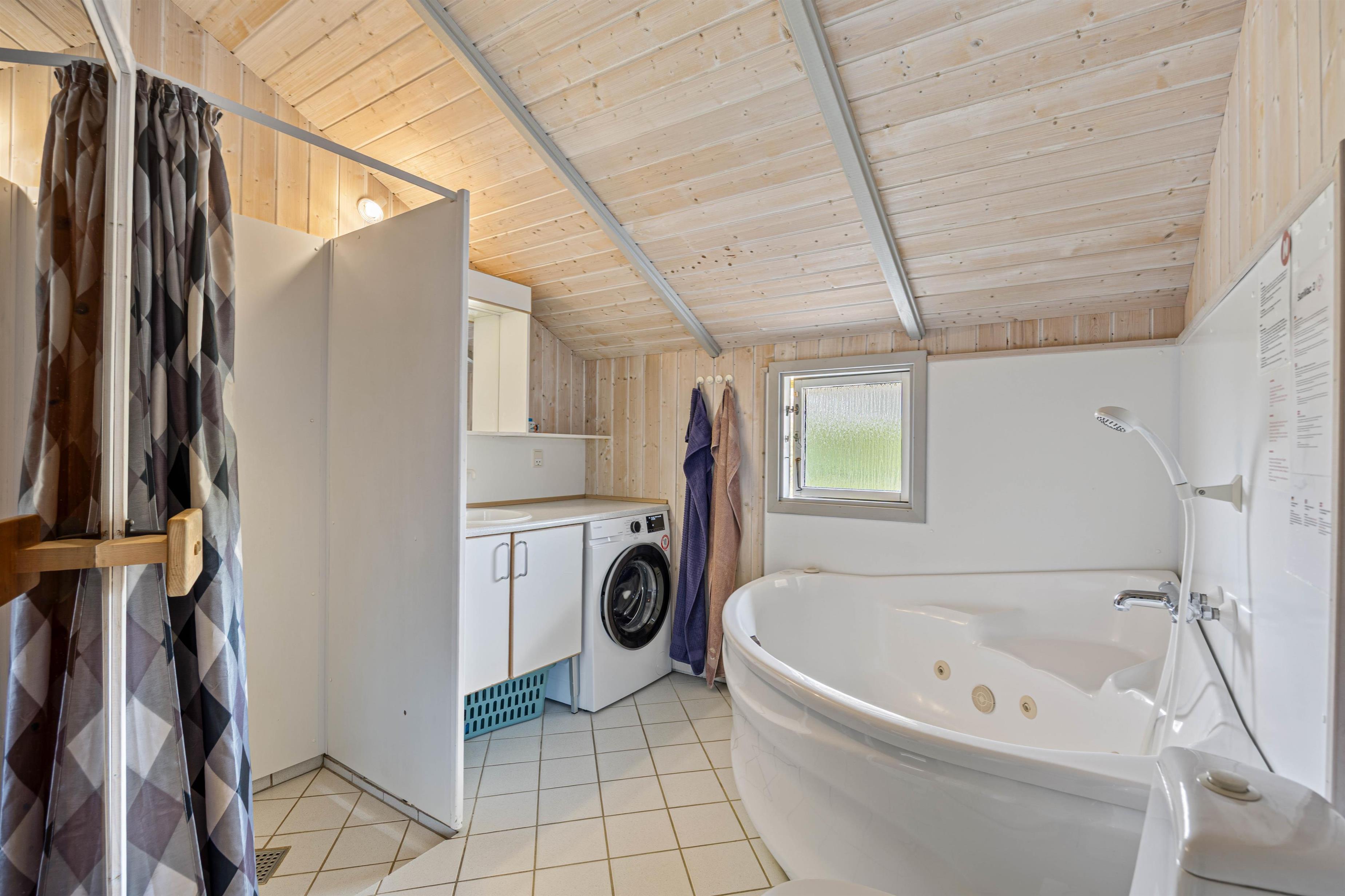 Det åbne køkken er praktisk indrettet og udstyret med opvaskemaskine, og i sommerhuset findes også en vaskemaskine, så ferien bliver ekstra komfortabel – også hvis I bliver her i længere tid. Badeværelset er udstyret med gulvvarme, spabad og sauna, hvor I kan forkæle jer selv og slappe helt af. Derudover har I et ekstra gæstetoilet, som gør det bekvemt, når man er mange samlet under samme tag.