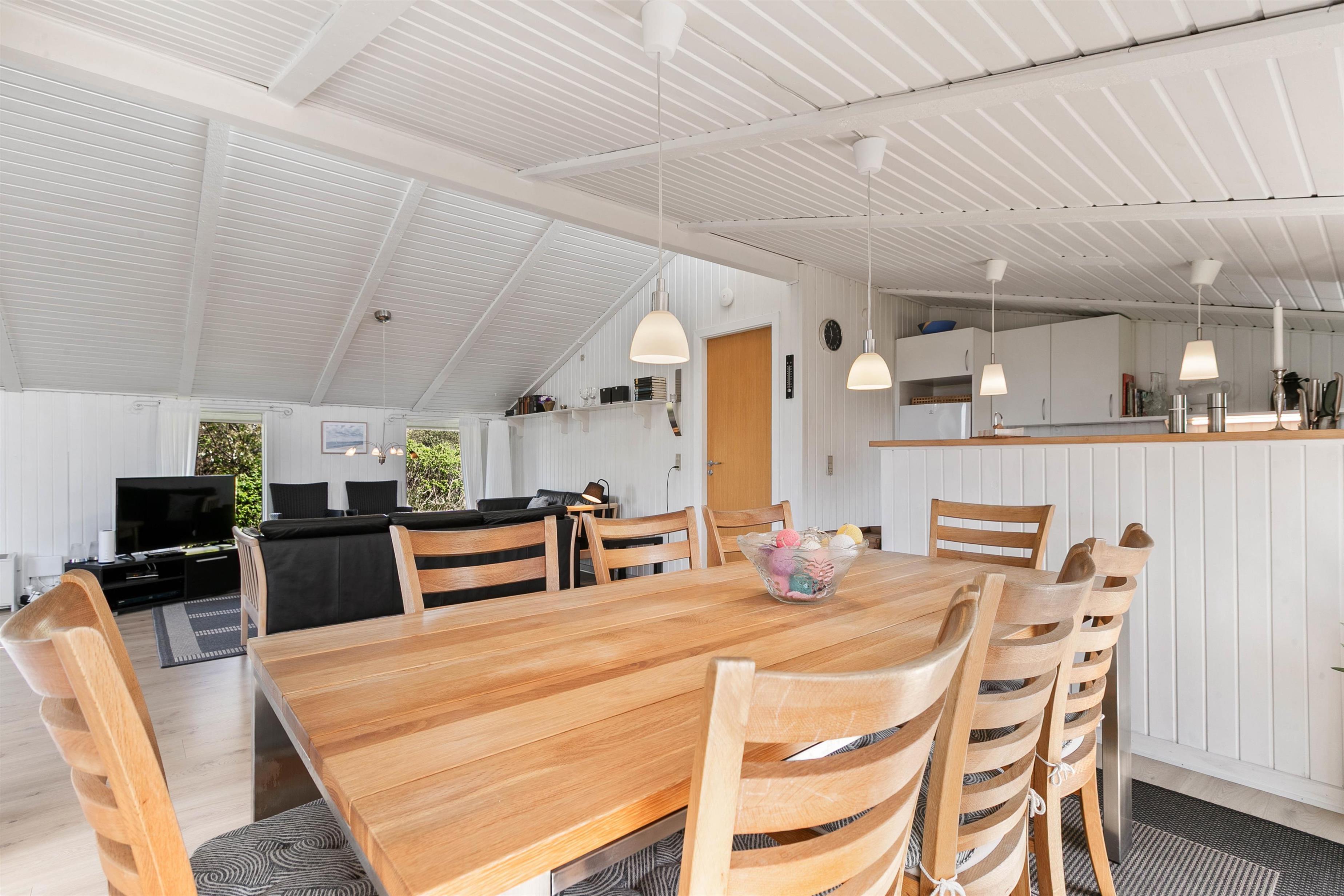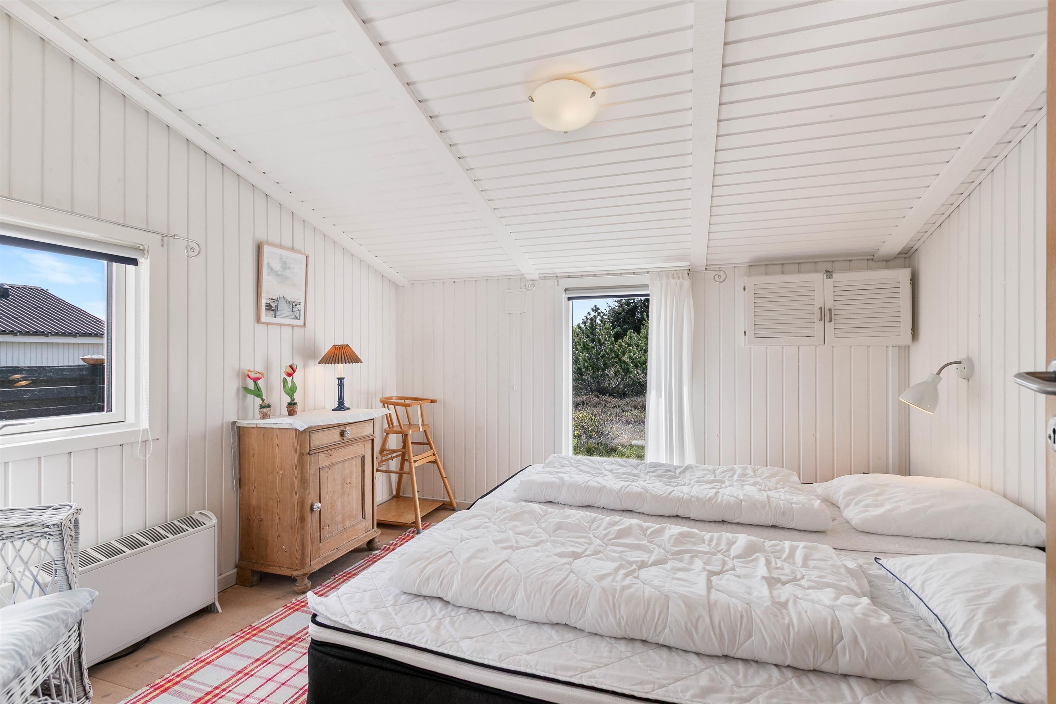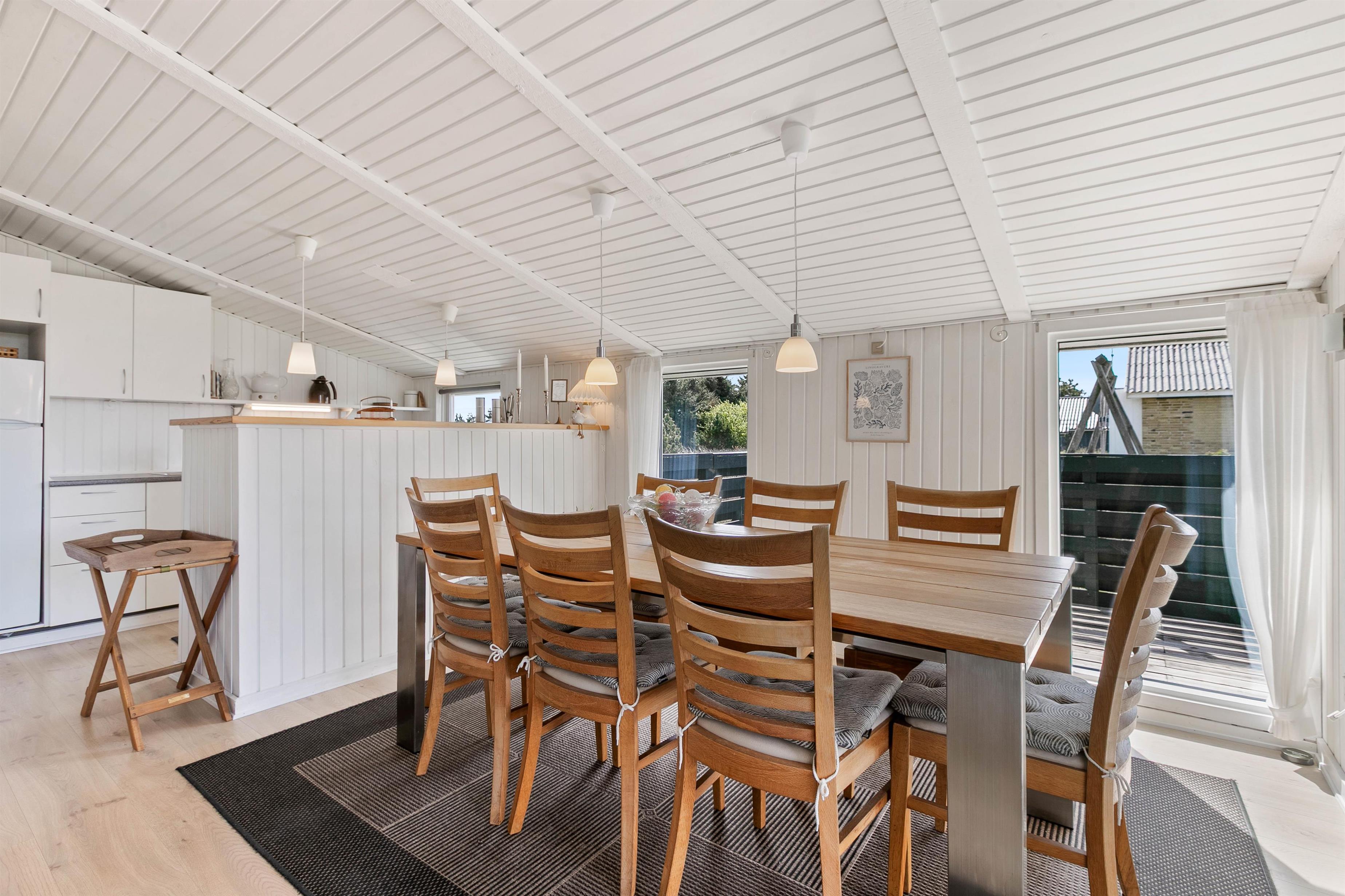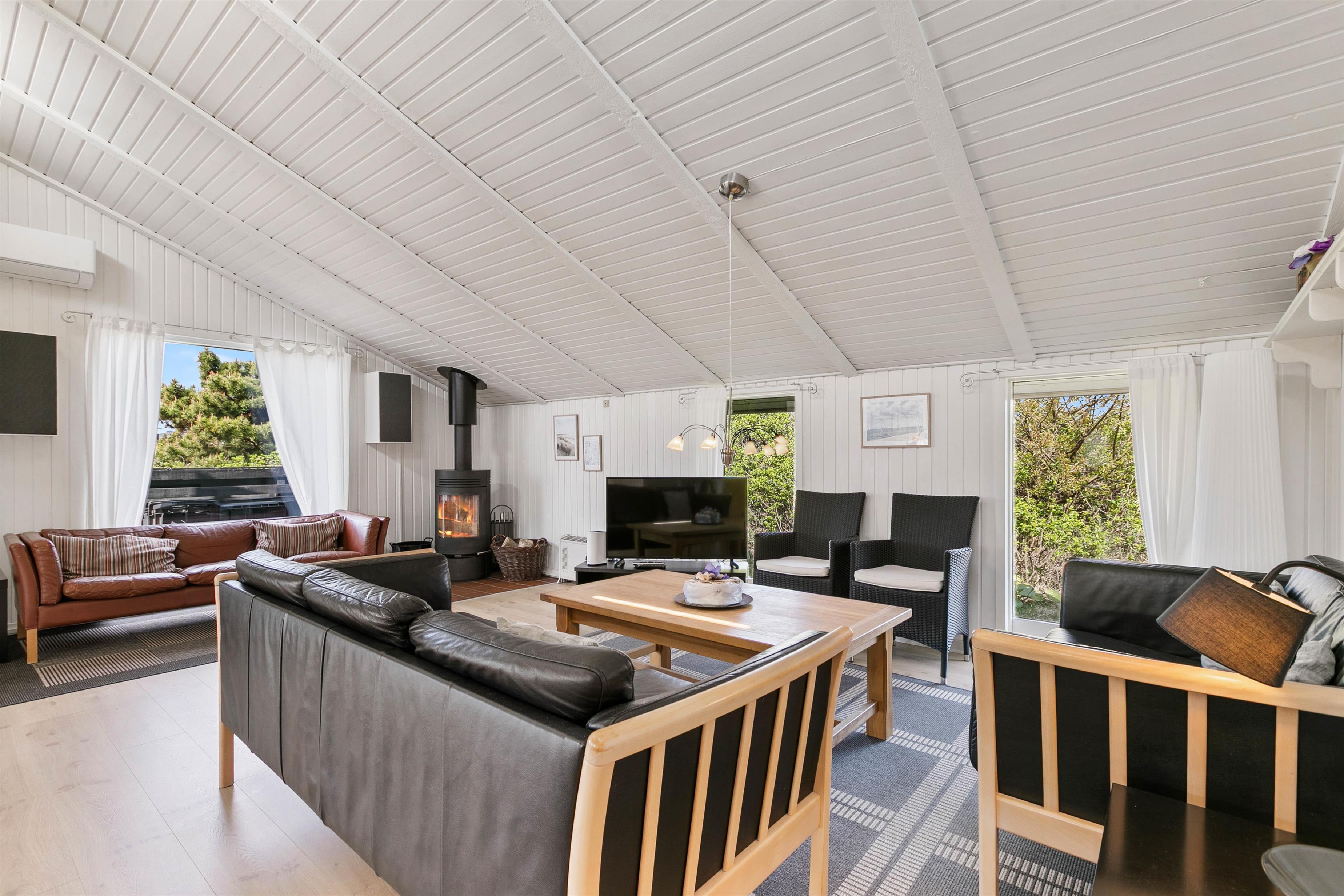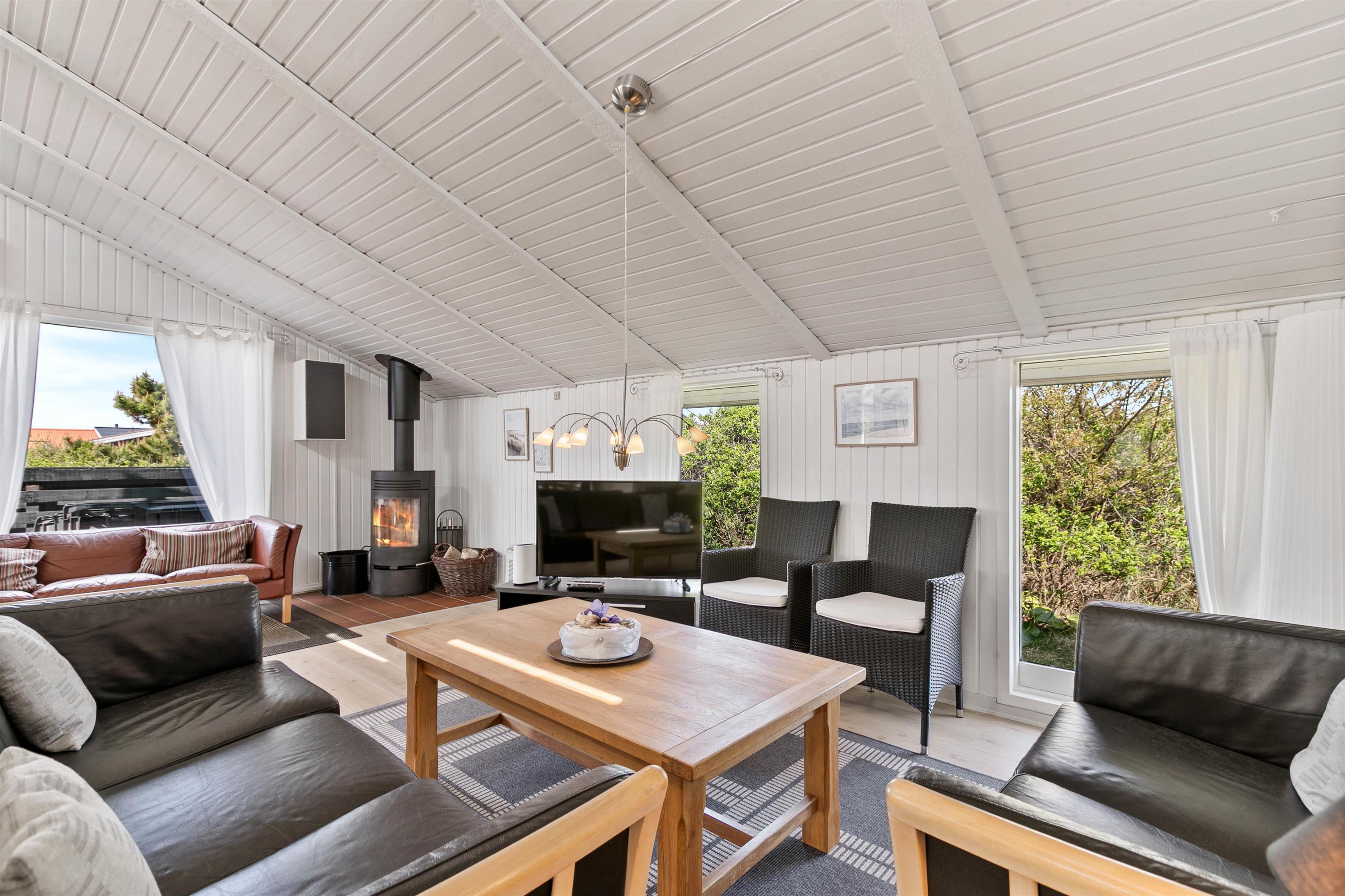 Sommerhuset er godt opdelt med de 4 soveværelser i den ene ende, og køkkenalrummet og stuen i den anden. Køkkenalrum og stue danner sammen sommerhusets hjerte. De store vinduer giver udsyn til det vestjyske klitlandskab, og brændeovnen varmer jer på selv de koldeste vinterdage.