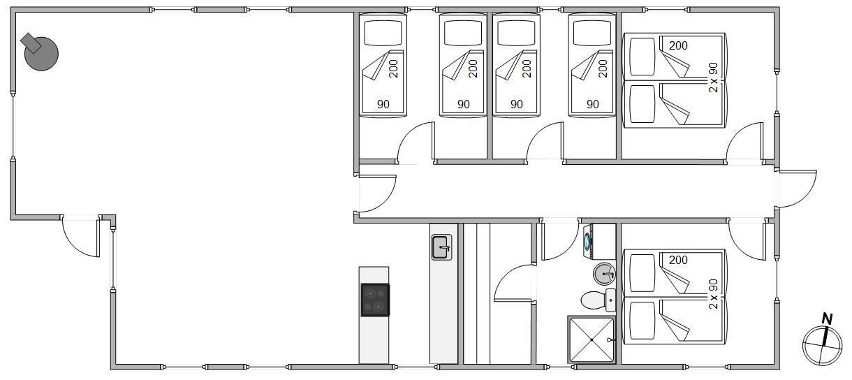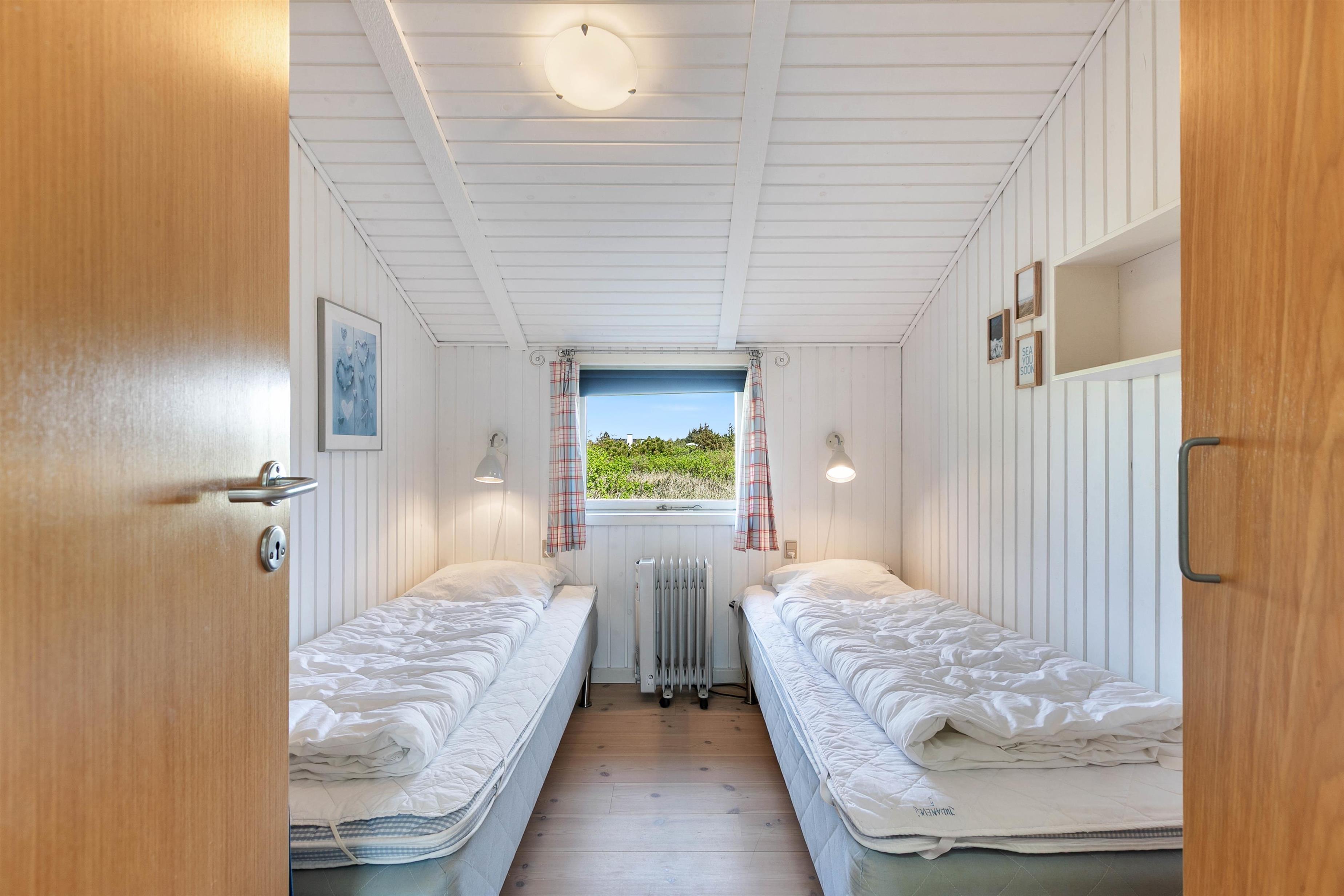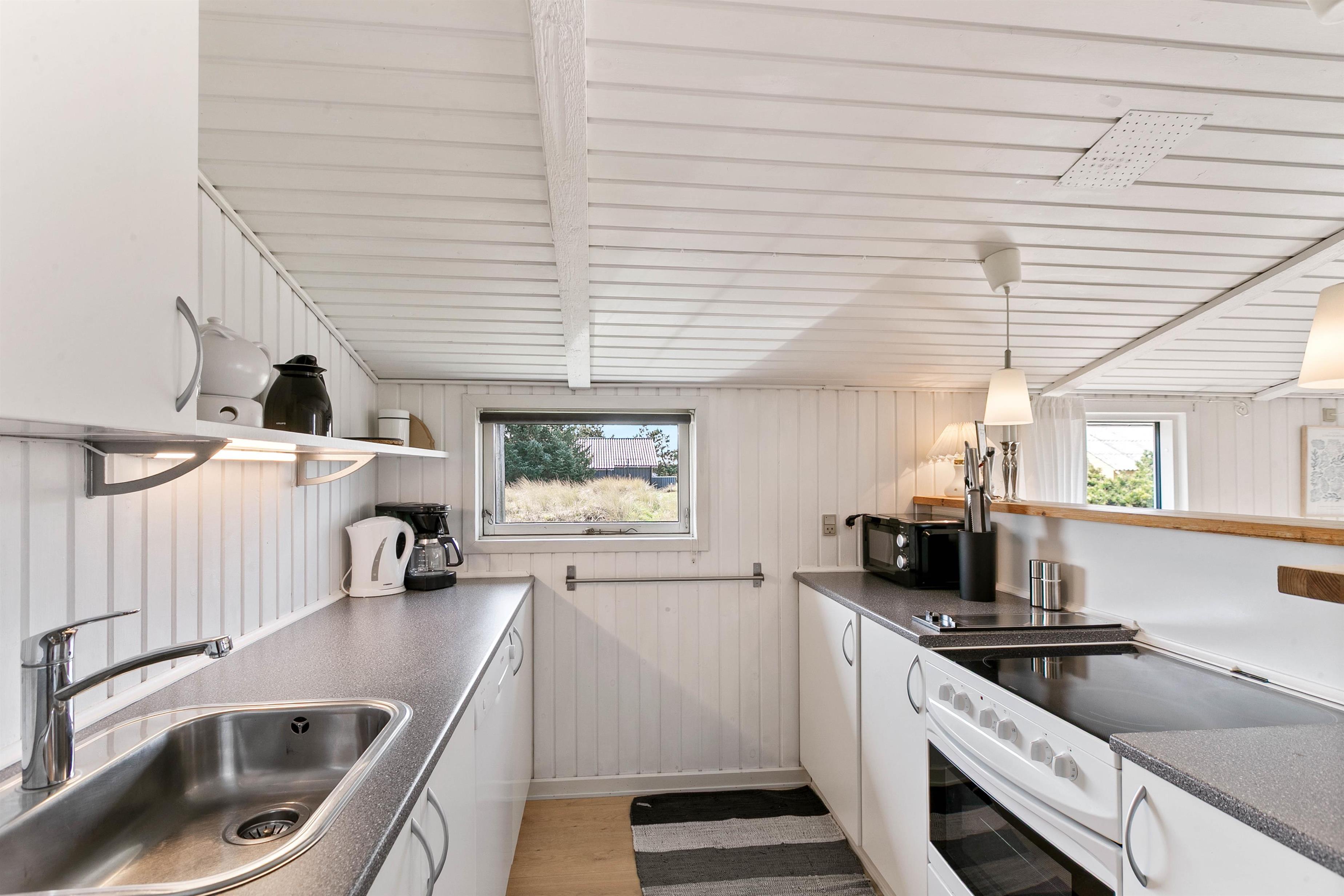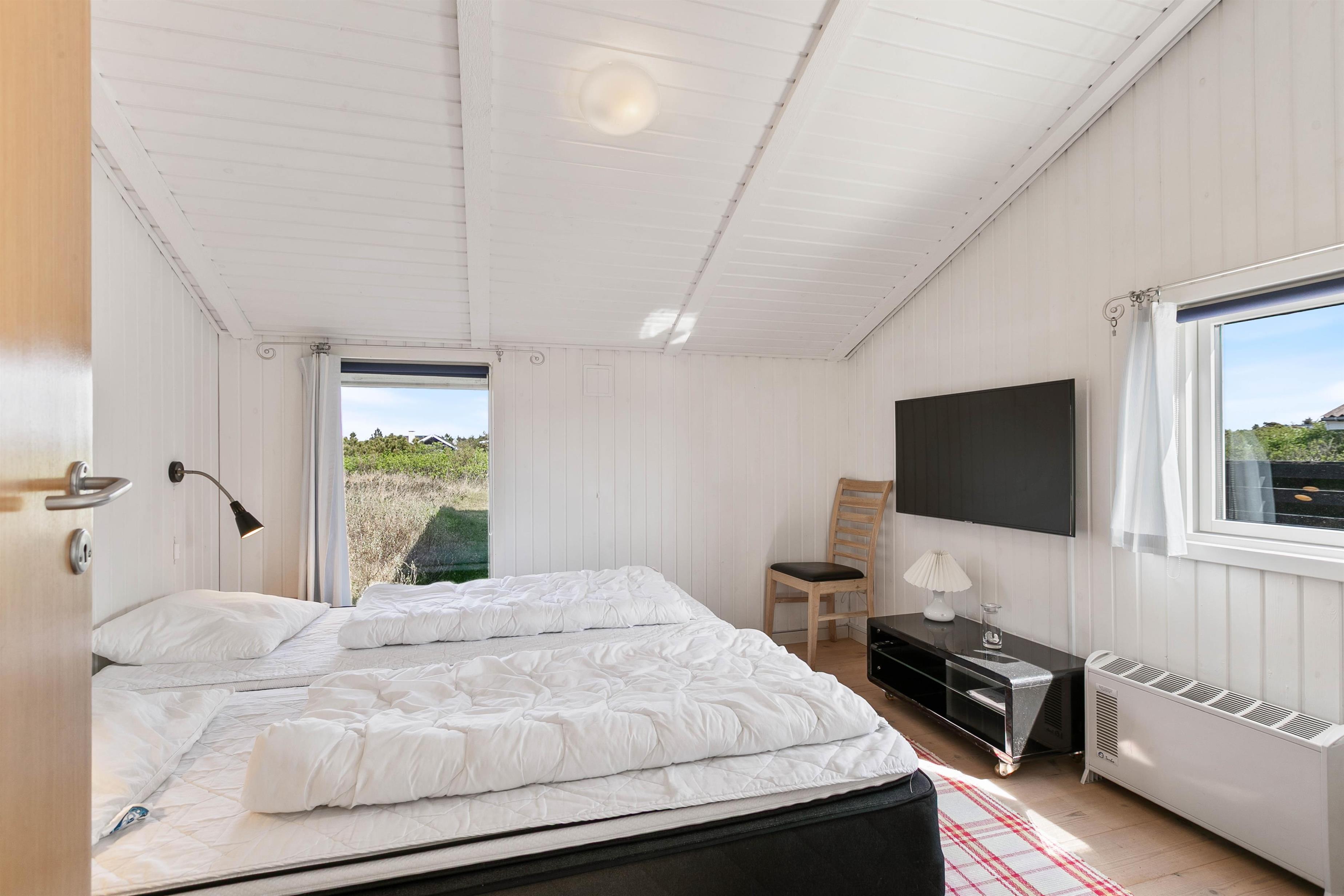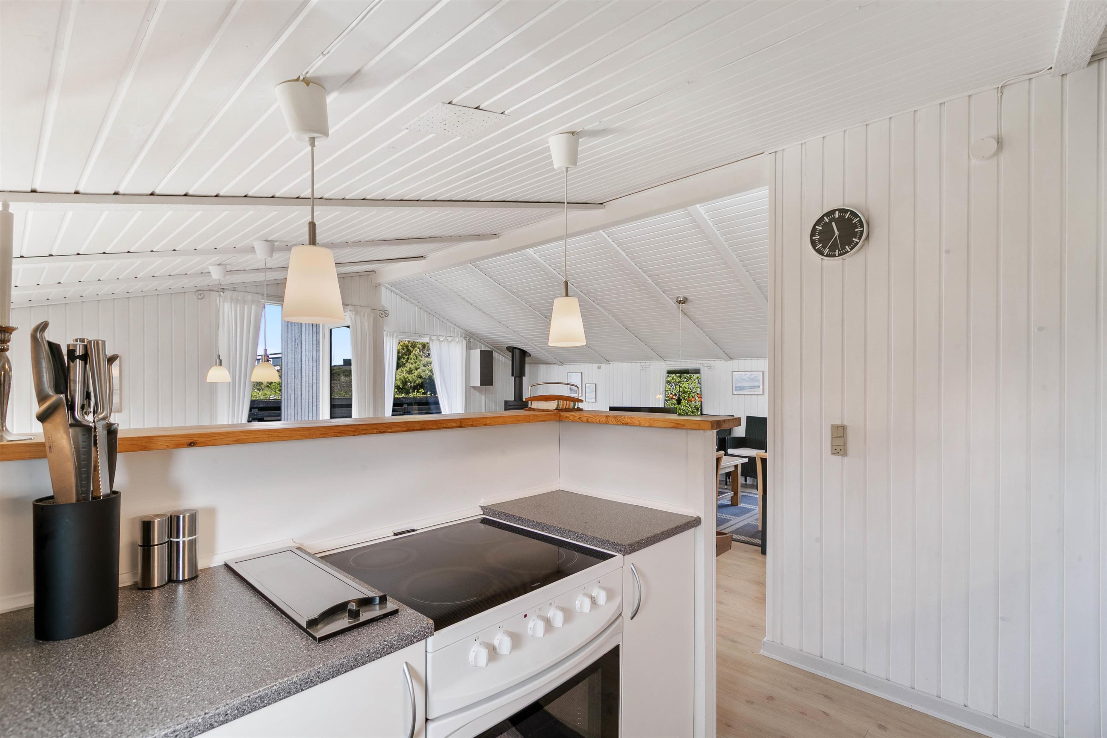 Sommerhuset er godt opdelt med de 4 soveværelser i den ene ende, og køkkenalrummet og stuen i den anden. Køkkenalrum og stue danner sammen sommerhusets hjerte. De store vinduer giver udsyn til det vestjyske klitlandskab, og brændeovnen varmer jer på selv de koldeste vinterdage.