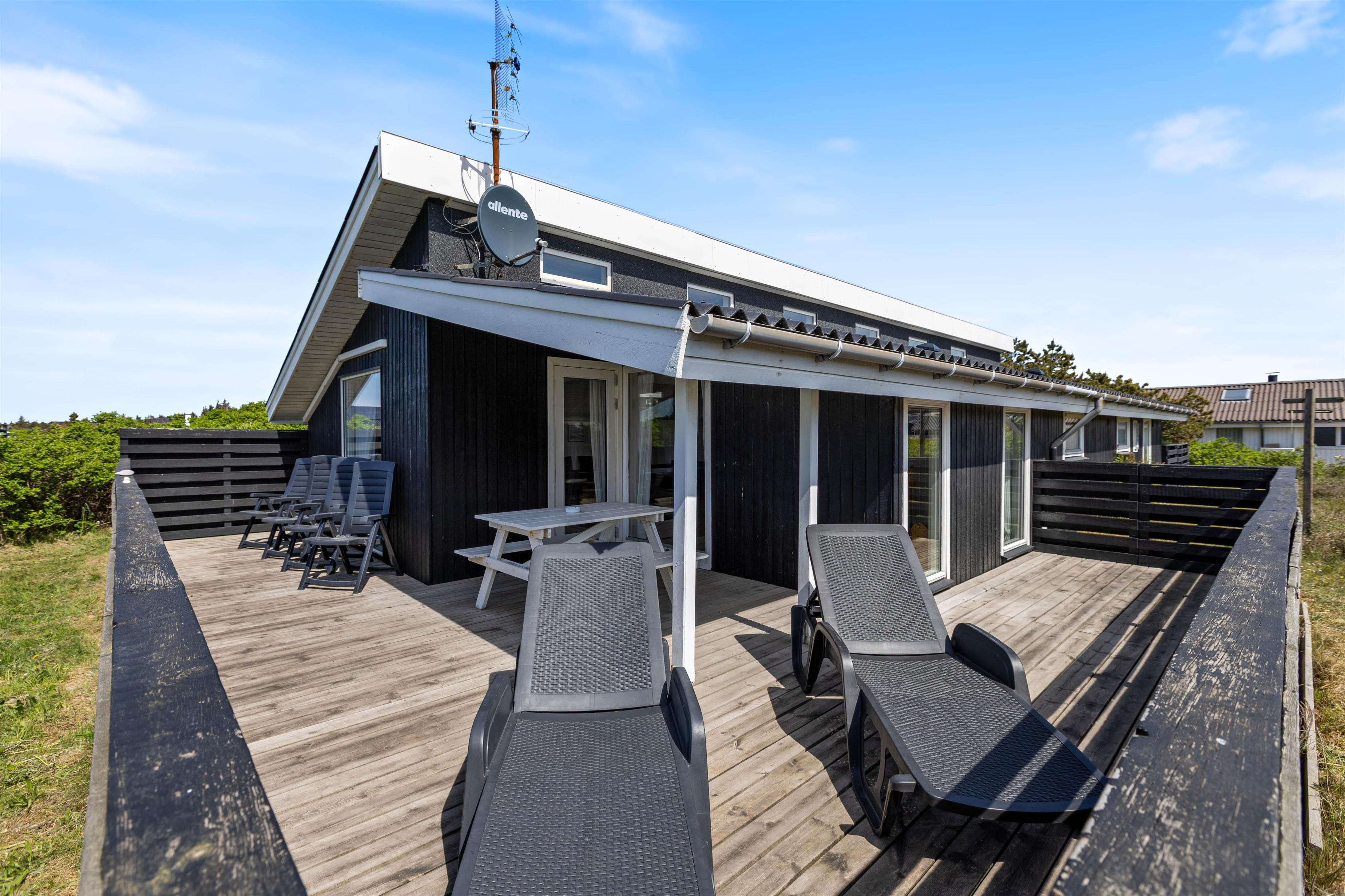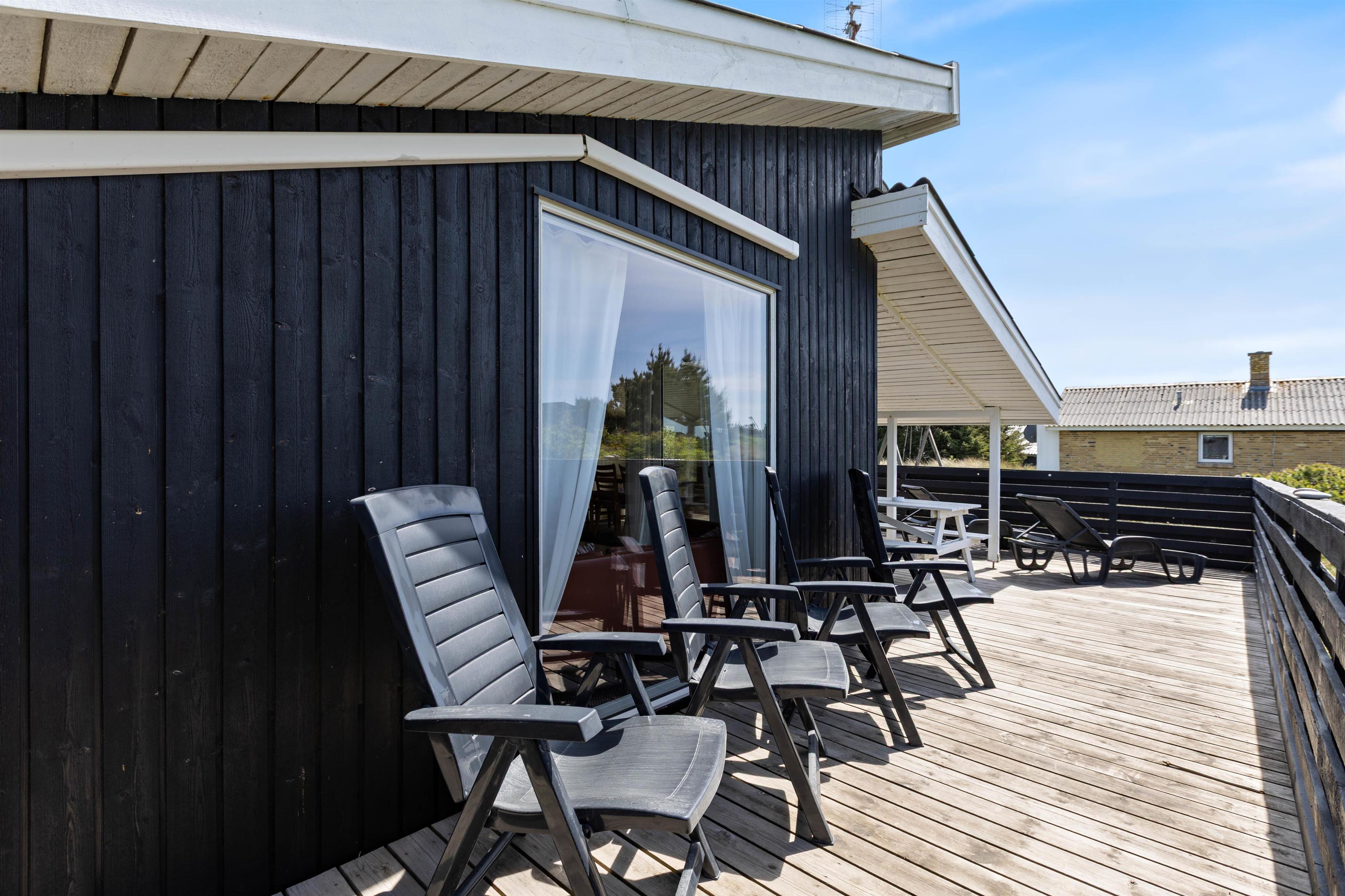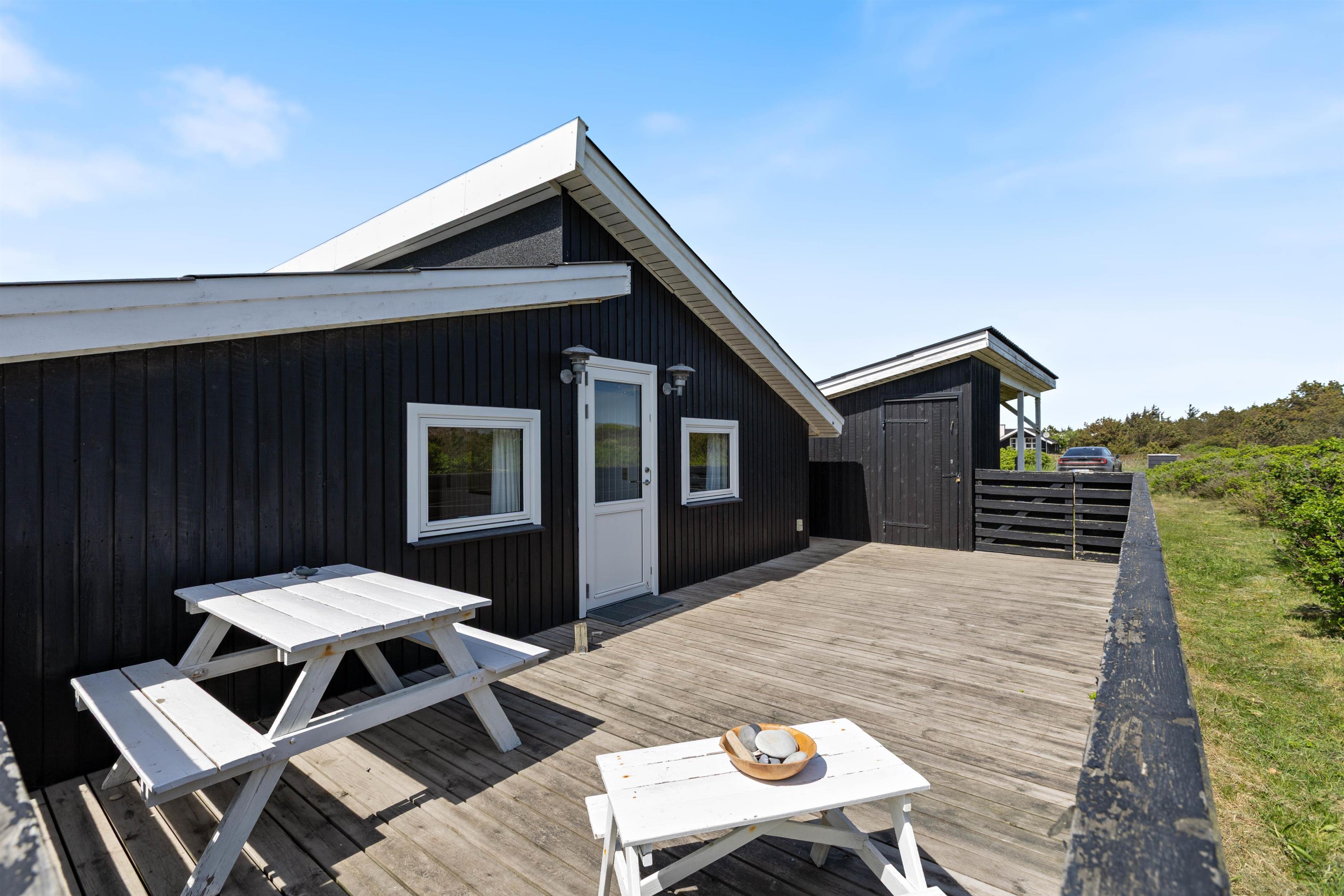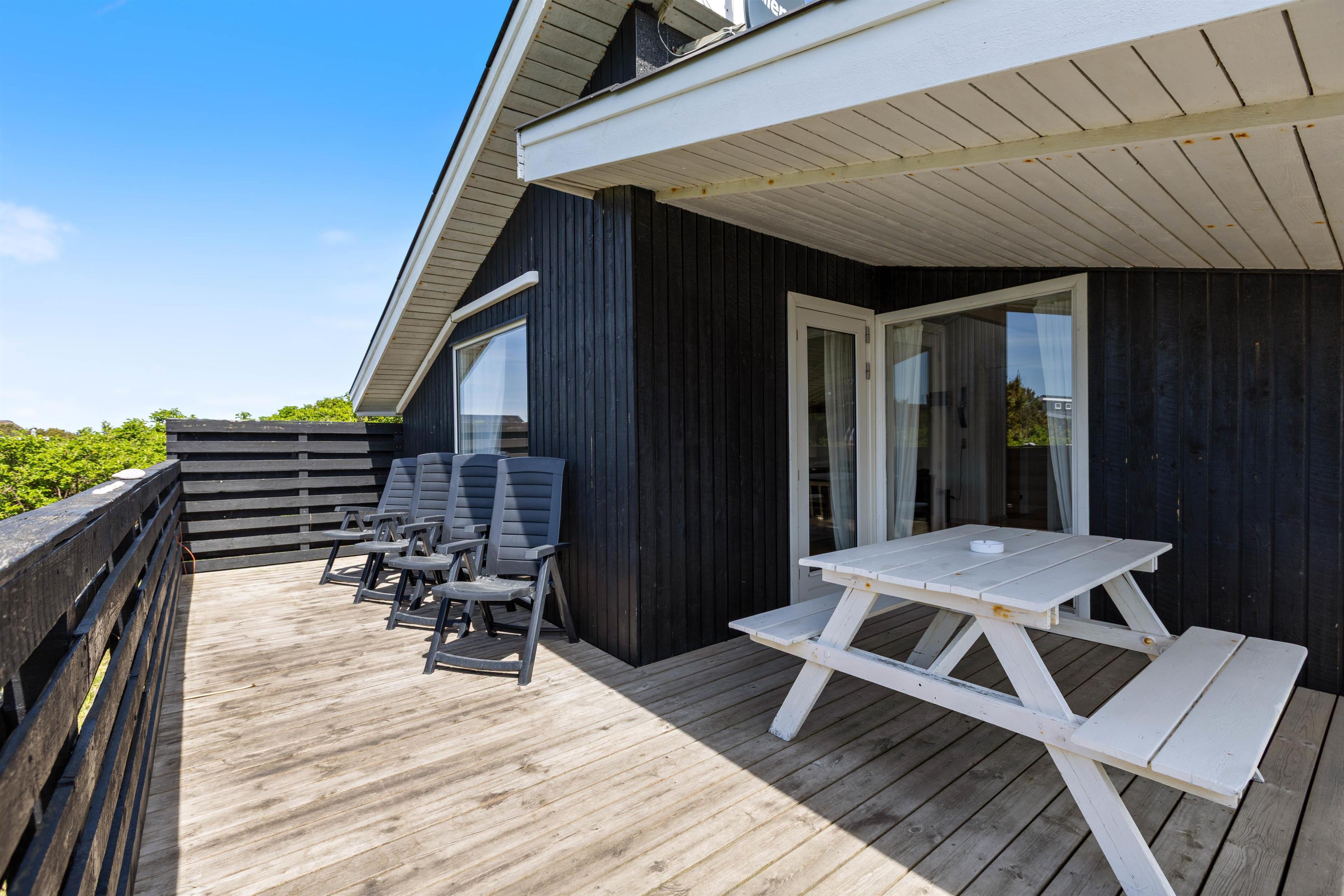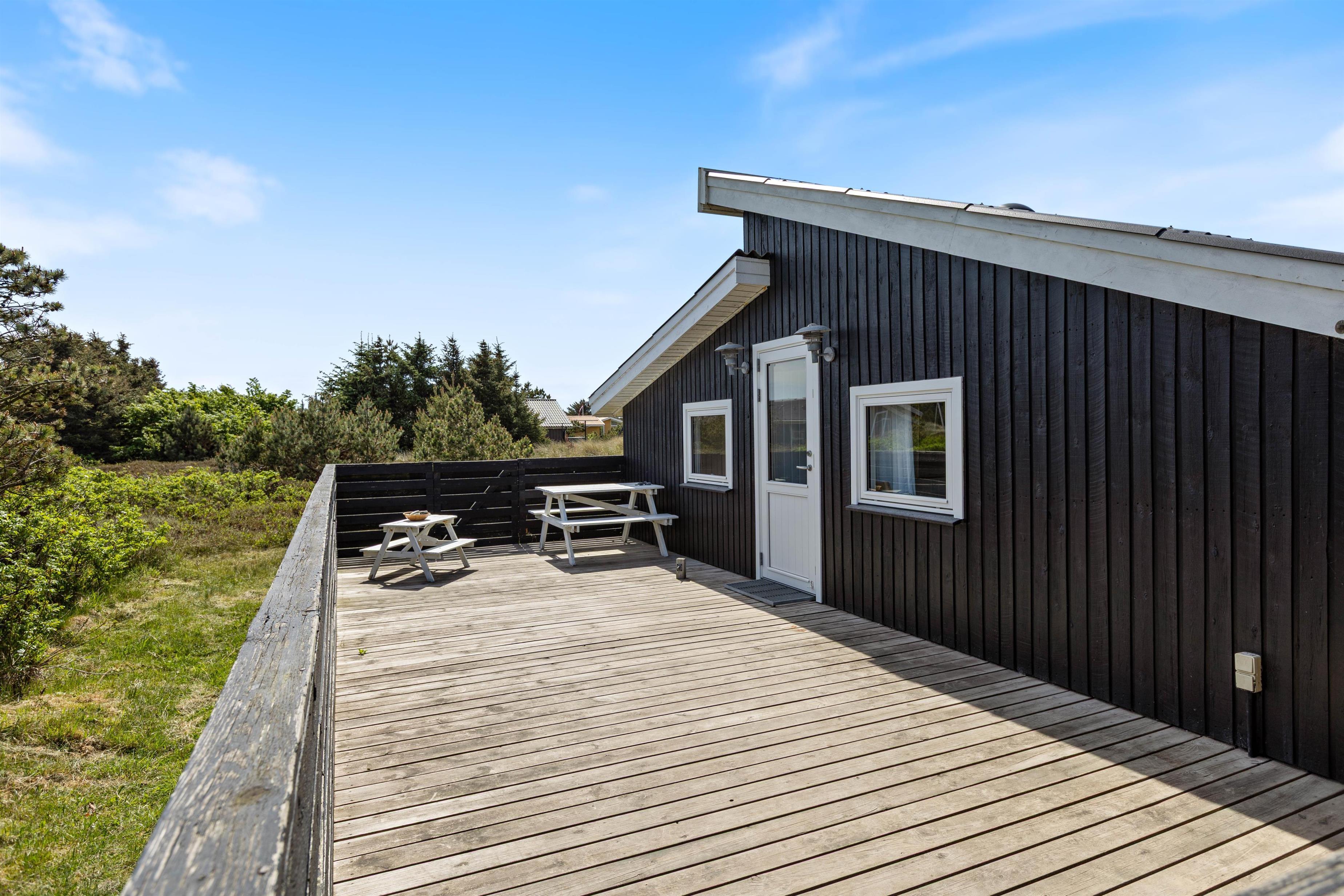 2 lukkede terrasser ligger i forlængelse af sommerhuset mod øst og vest. Her er der plads nok til, at alle familiemedlemmer kan finde en plads i solen, og I kan roligt lade børnene lege udenfor, mens I laver aftensmad i køkkenet eller steger bøffer på grillen.