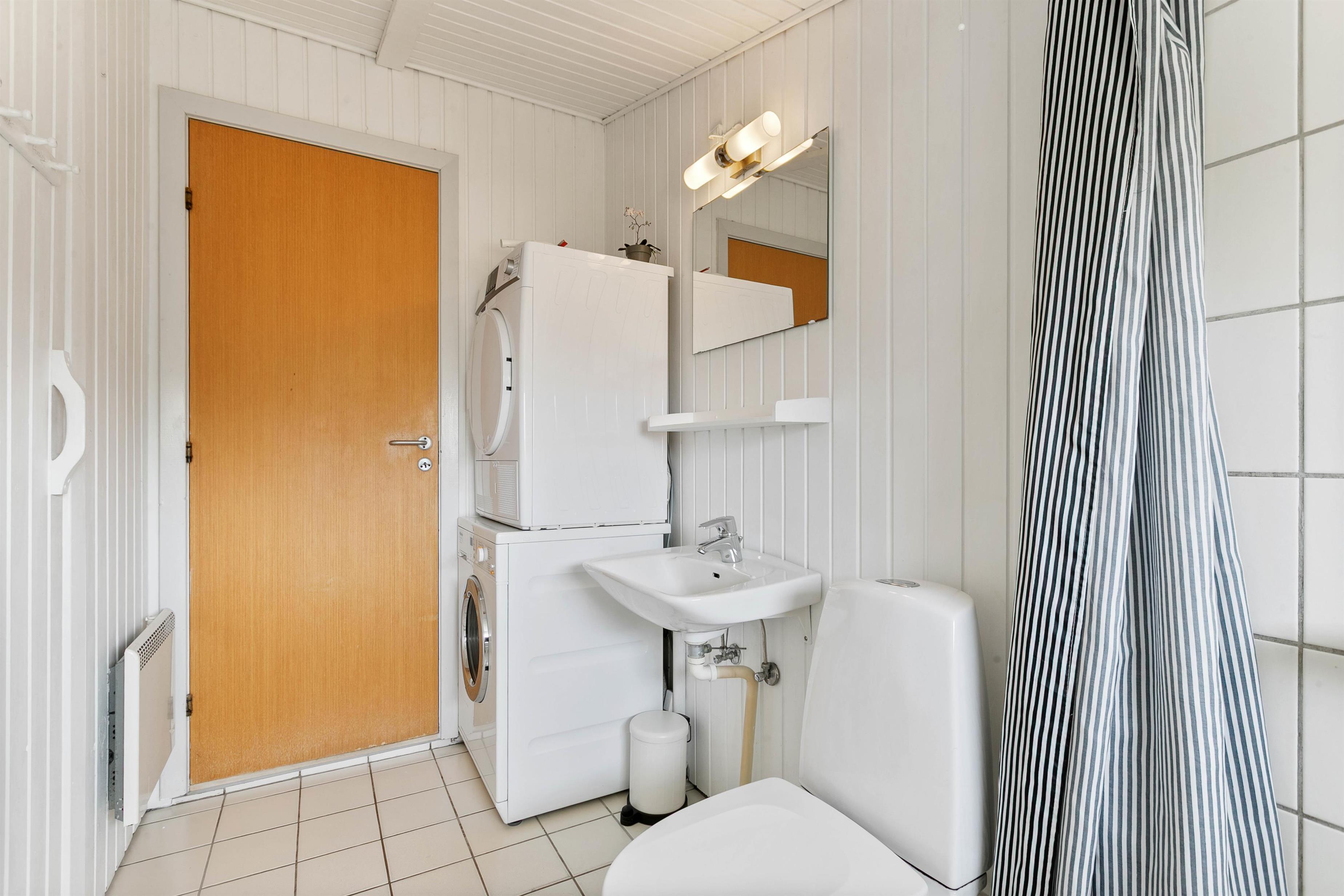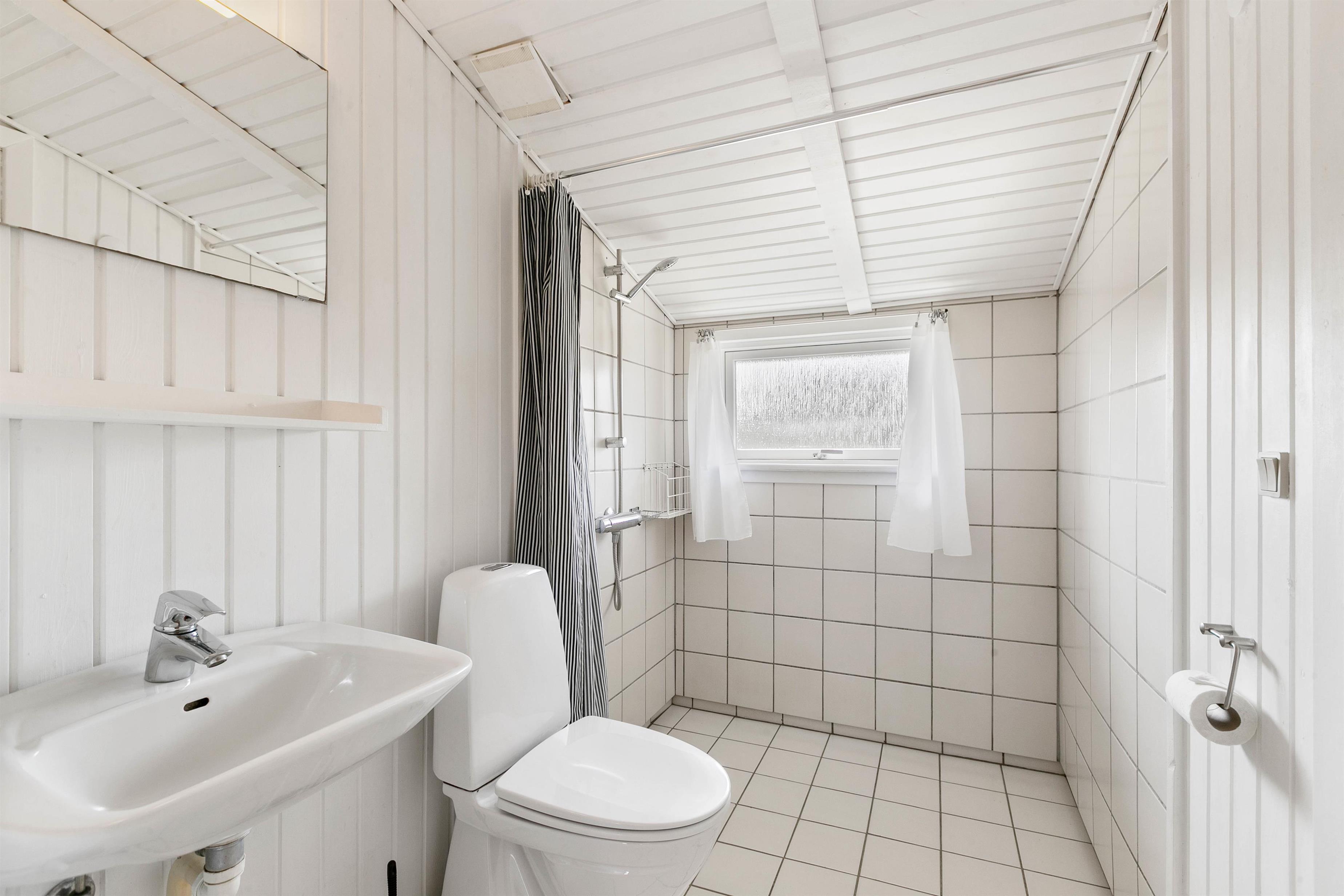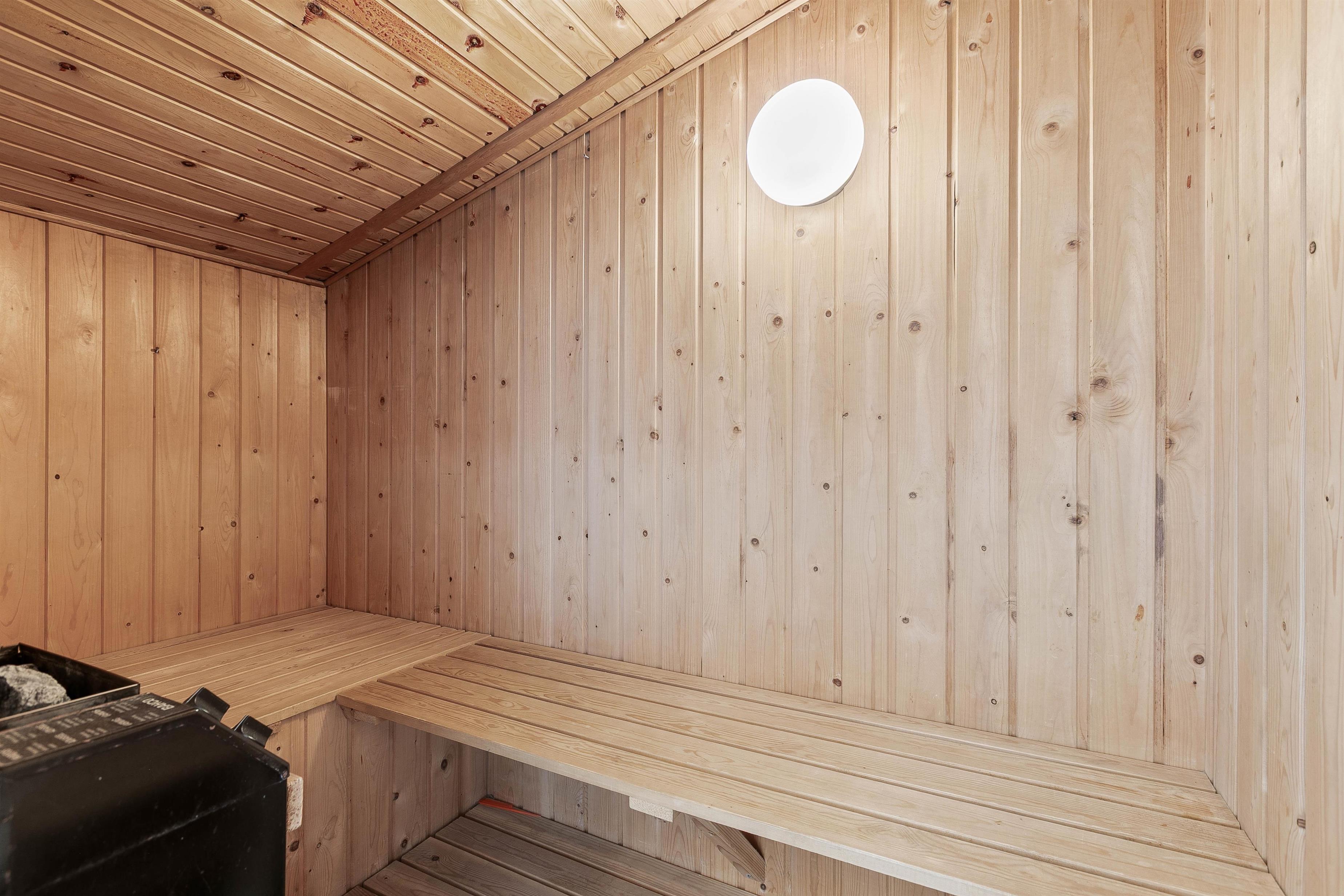 Fra badeværelset er der adgang til sommerhusets sauna, hvor I kan forkæle jer selv lidt ekstra og tanke nye kræfter i varmen - efter ungerne er lagt i seng eller efter en forfriskende gåtur i den salte havluft. Badeværelset har skråvæg ved bruseren, hvilket du særligt vil bemærke, hvis du er over 1,80 meter høj – her kan pladsen være begrænset.