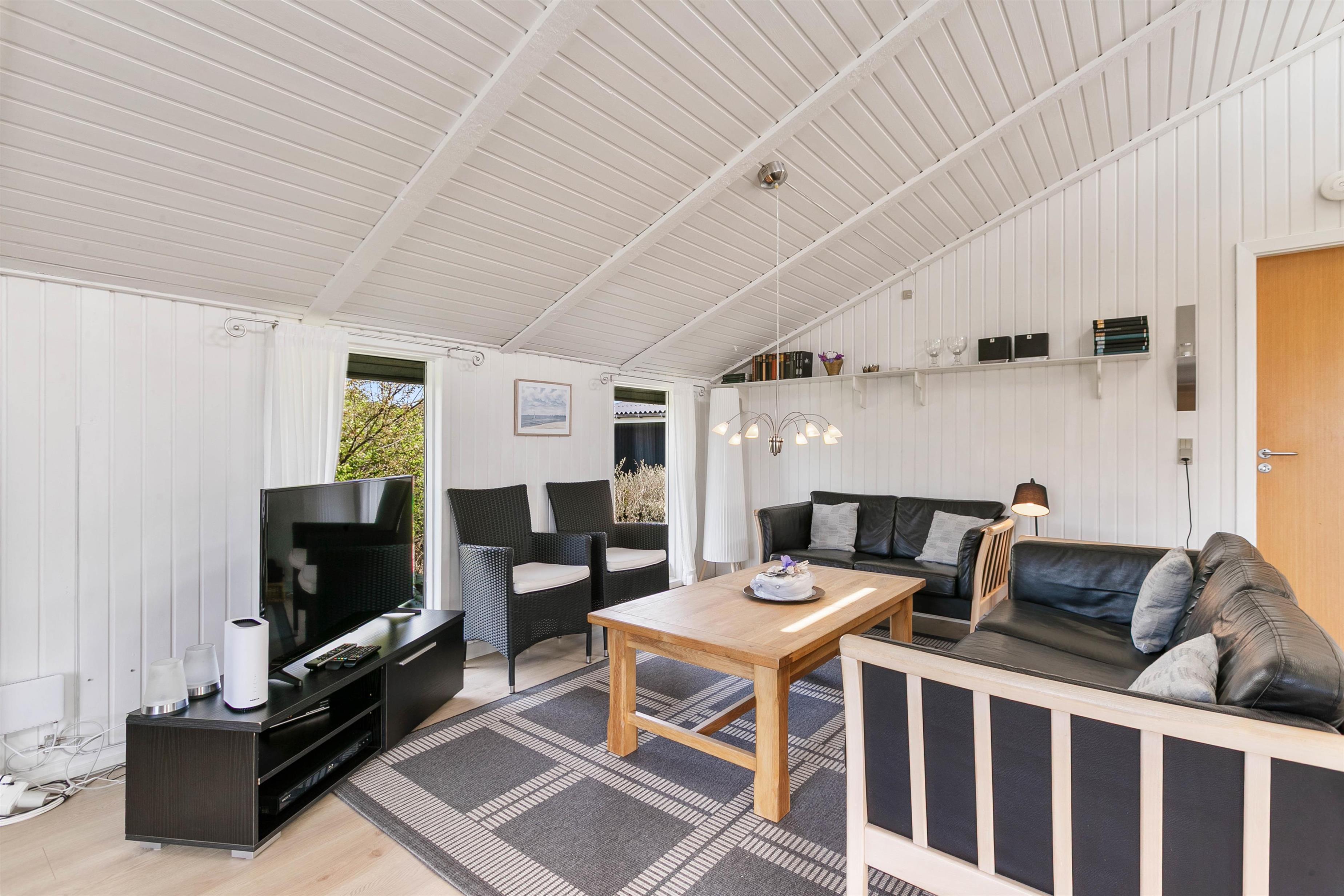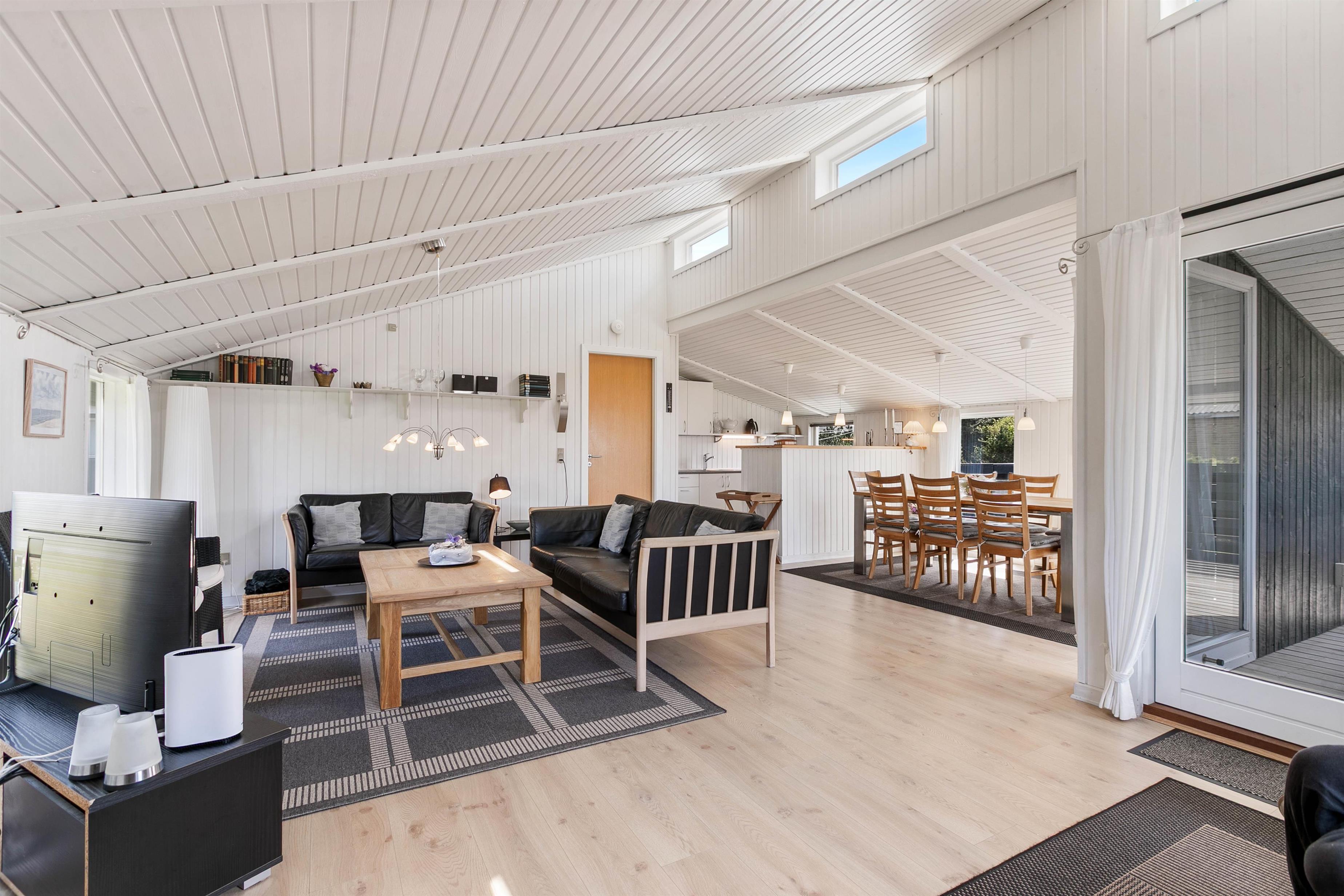 Med sine 102 kvadratmeter er der god plads til hele familien, og I vil straks føle jer velkomne i de hyggelige omgivelser med hvide trævægge- og lofter, der åbner rummene op, og små detaljer, der giver indretningen et personligt præg.