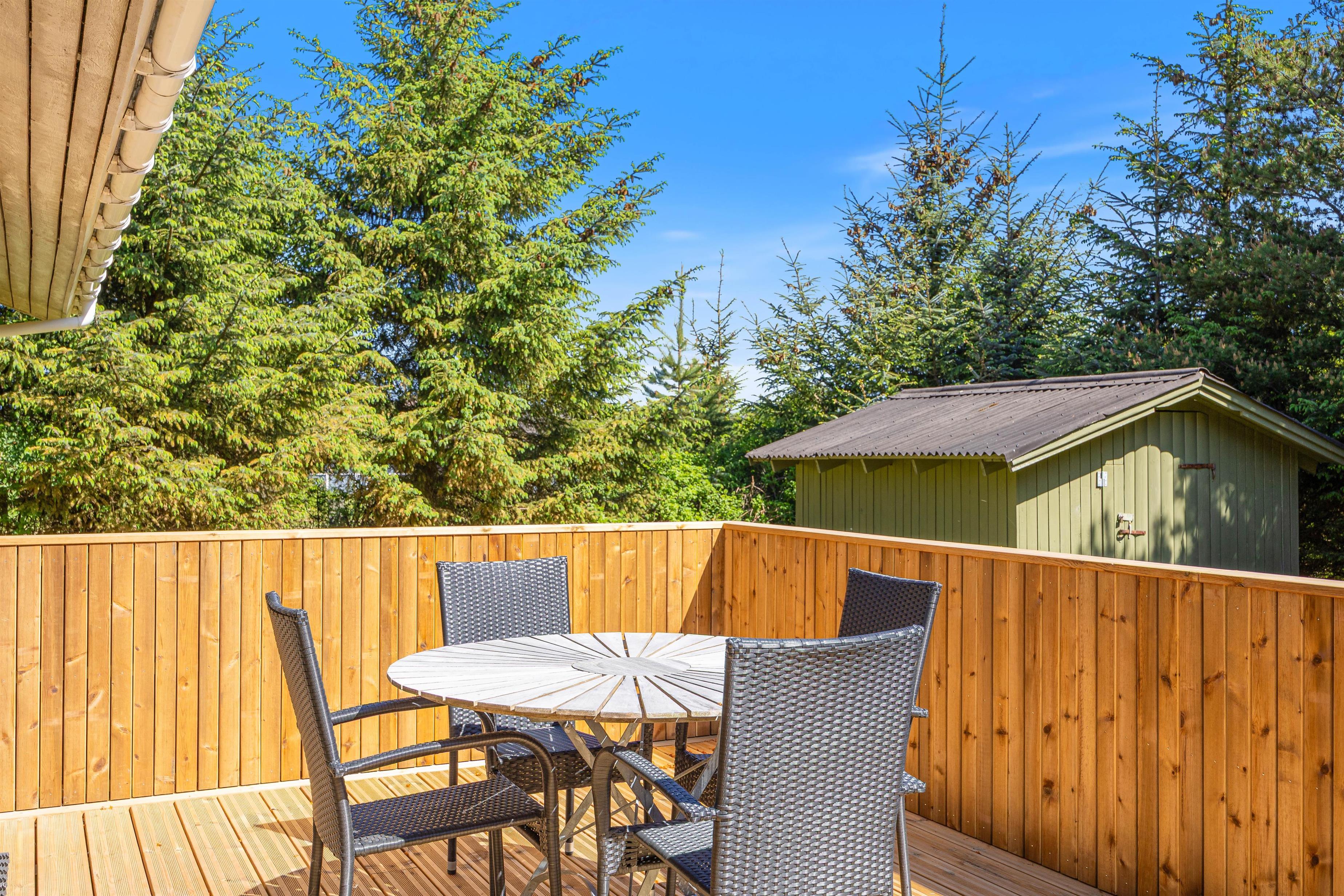 På de store træbeklædte og delvist overdækkede terrasser finder du naturligvis havemøbler, liggestole og en grill til de kulinariske udfoldelser.