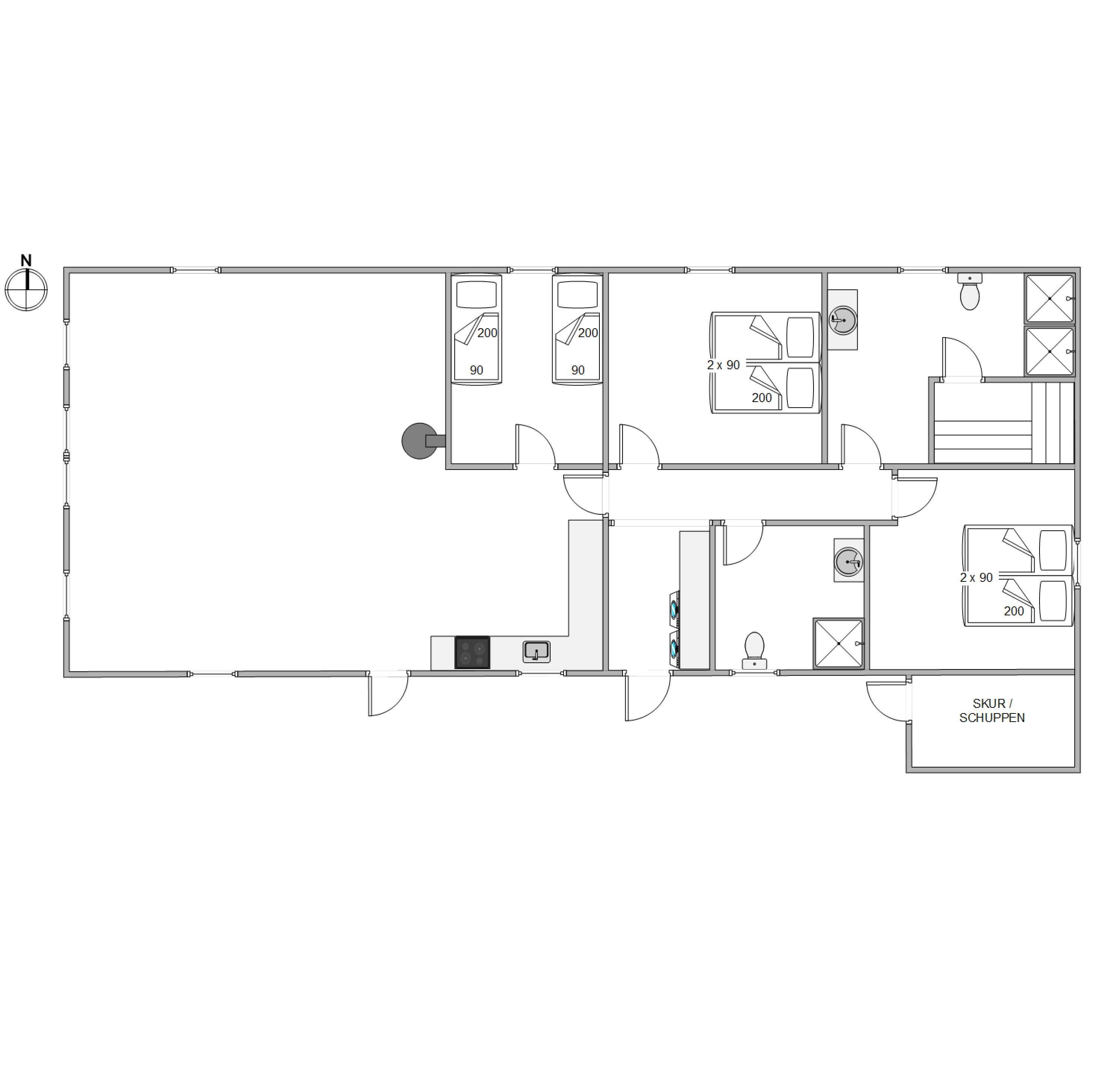 På det store badeværelse finder I sommerhusets store højdepunkt – den skønne sauna. Det er det helt perfekte sted at være, når I trænger til afslapning. På dette badeværelse er der desuden 2 brusere.